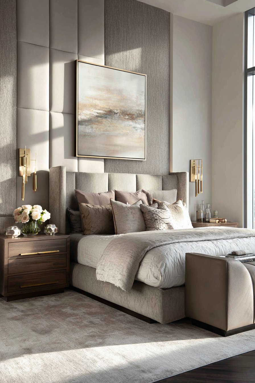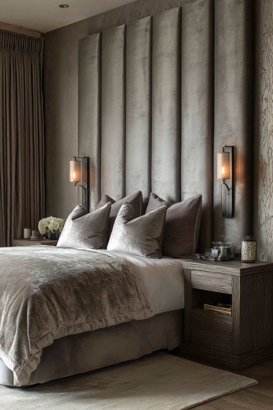 Sophisticated bedroom wall design ideas reach new heights with a dramatic floor-to-ceiling upholstered fabric installation that transforms the entire headboard wall into a luxurious tactile experience. Soft dove gray linen extends vertically with subtle channeling and covered buttons, creating the kind of hotel-inspired aesthetic that turns a bedroom into a personal sanctuary. This padded wall treatment demonstrates how wall design ideas can incorporate both visual appeal and functional comfort, providing a soft surface for reading in bed while dramatically elevating the room’s overall ambiance.