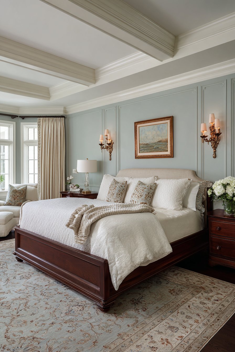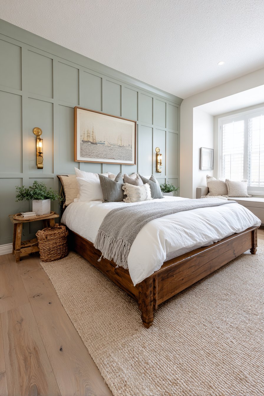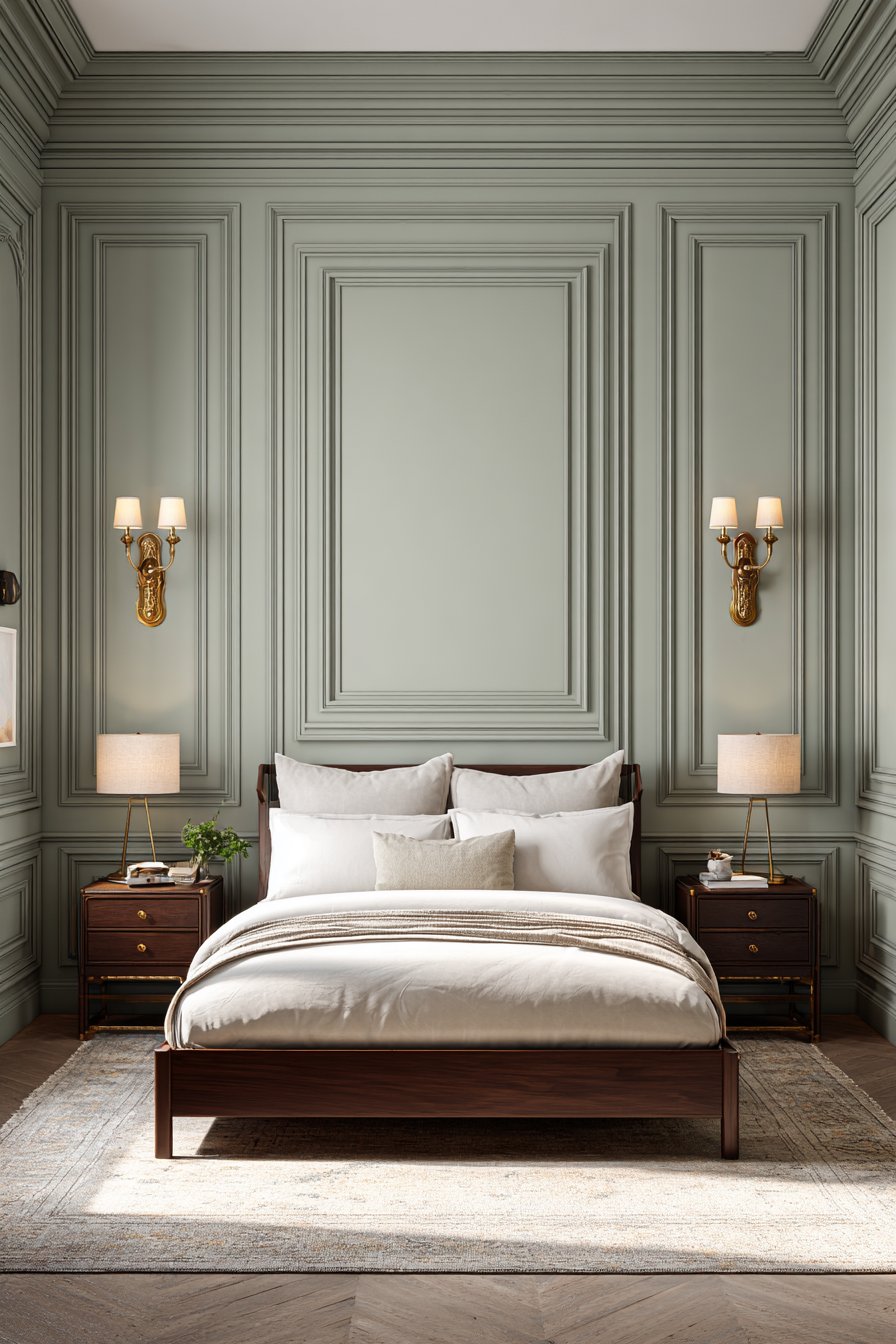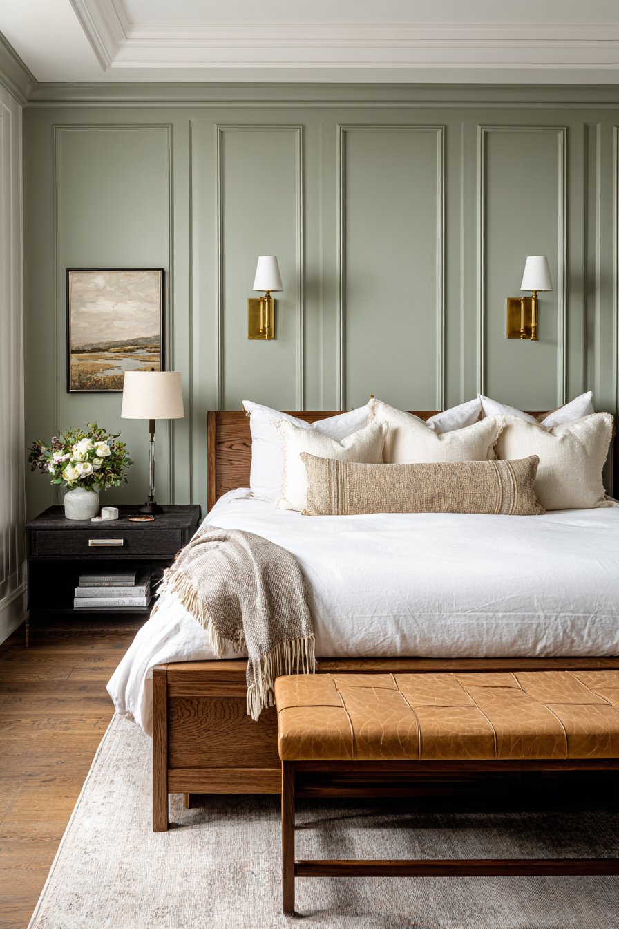Traditional bed frame in dark wood grounds the space while white bedding keeps the look fresh and prevents the sage green from feeling dated or heavy. Antique brass wall sconces flank the bed providing task lighting while their vintage-inspired design complements the traditional wainscoting. The raised panel details create dimensional shadows that add depth and interest, transforming flat walls into architectural features worthy of historical homes.