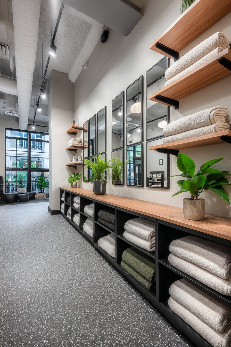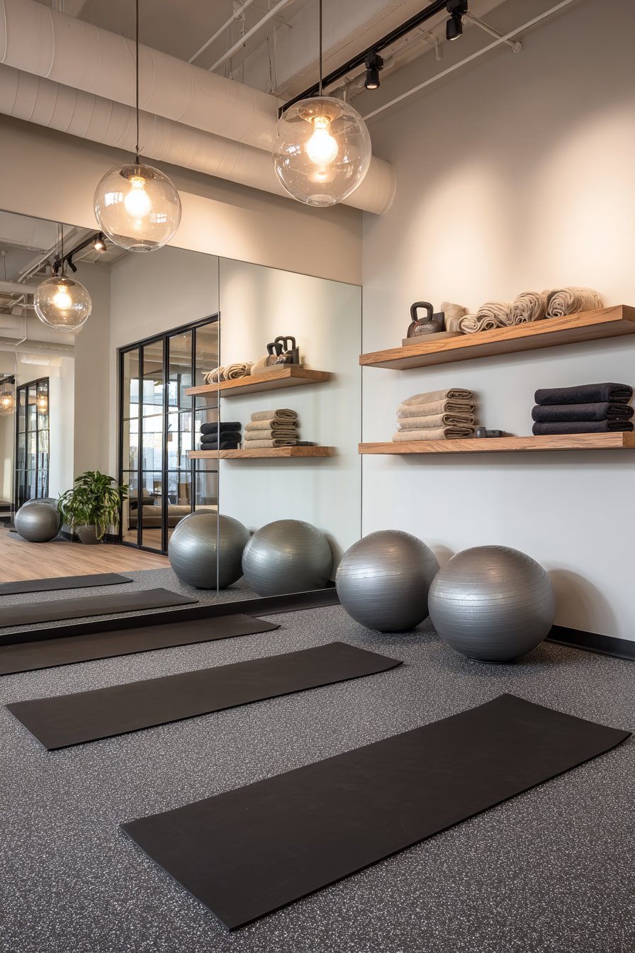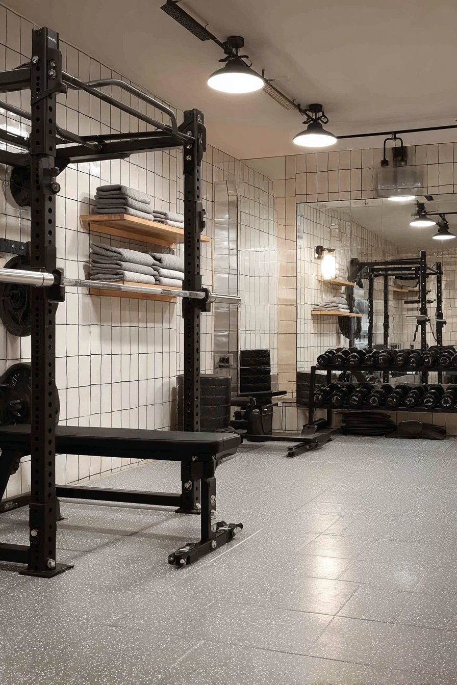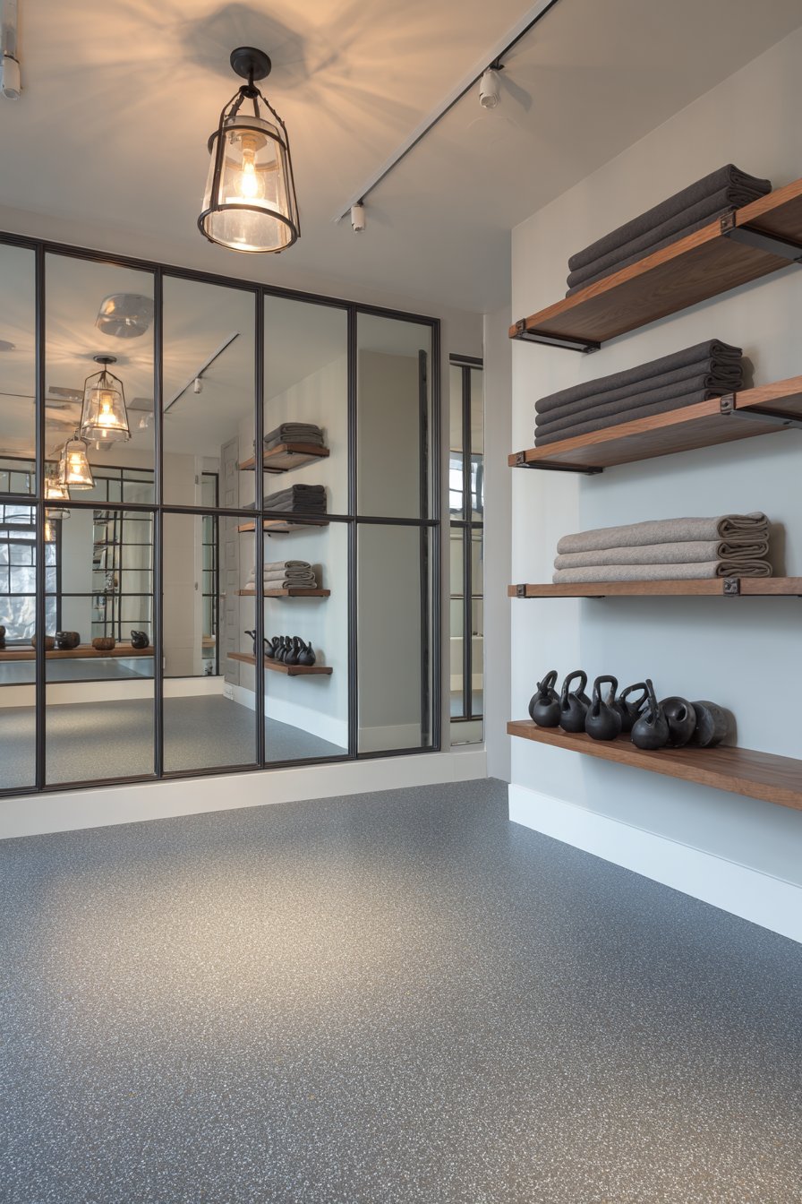 Floating shelves in black metal and wood display folded towels and minimal equipment, providing practical storage without cluttering the space. Rubber flooring in speckled gray provides durable foundation appropriate for gym equipment and high-impact activities. Track lighting overhead ensures bright task illumination essential for safe exercise while preventing harsh shadows that would make using mirrors difficult.