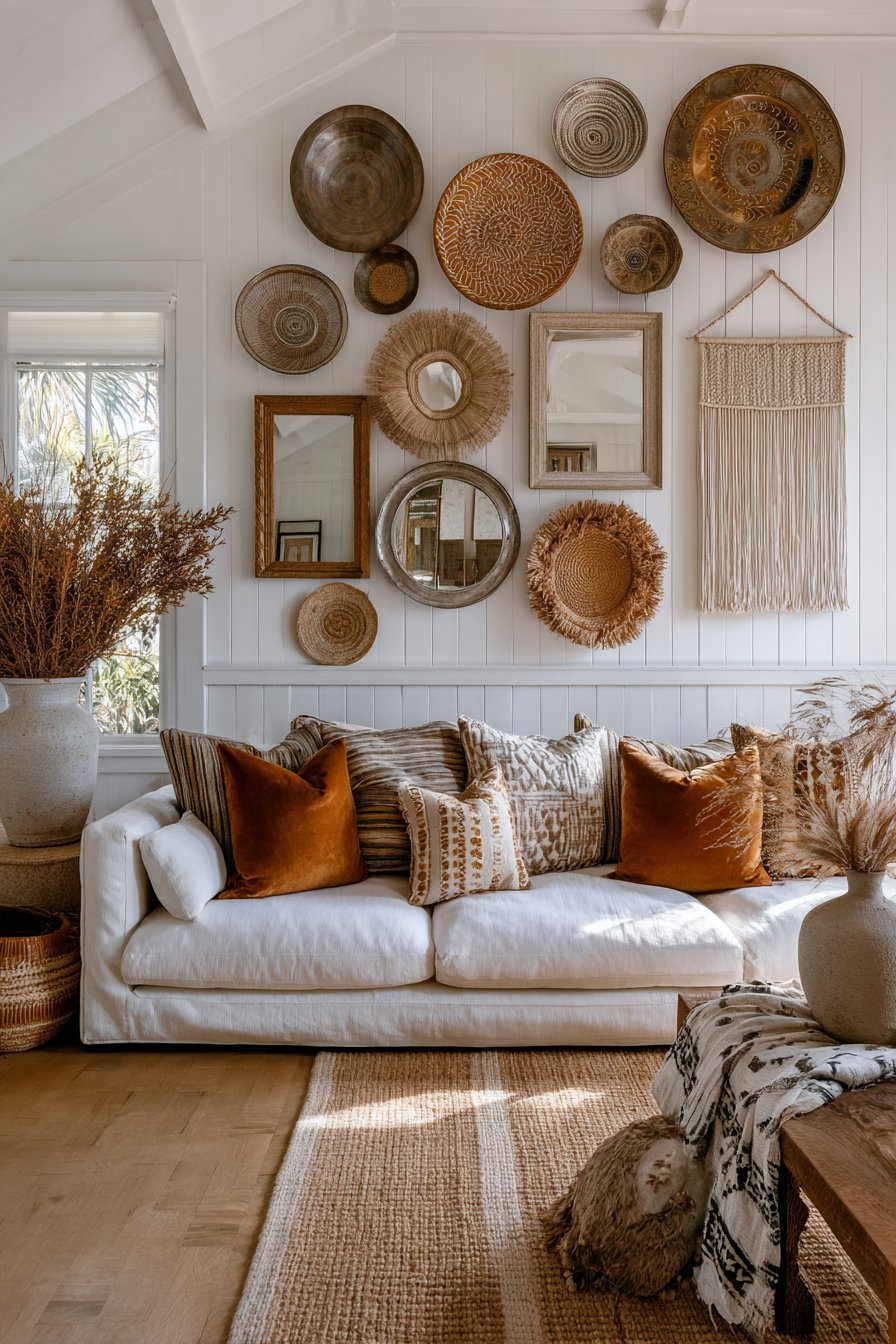 Living room wall design ideas celebrate personal style through eclectic collection wall displaying vintage plates, brass mirrors, woven baskets, and macramé pieces arranged in organic asymmetrical pattern. This installation demonstrates how wall design ideas can showcase collections and treasures in artful arrangement that tells personal story while creating substantial visual impact. The curated collection maintains cohesive earthy color palette despite varying materials and forms, creating unity within diversity.