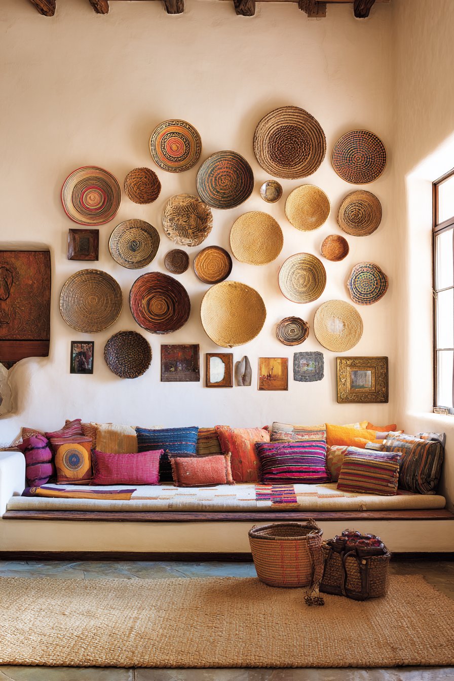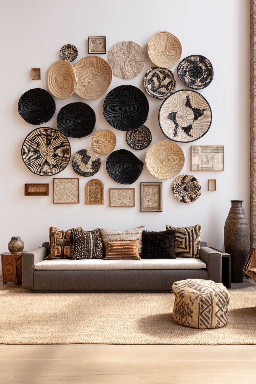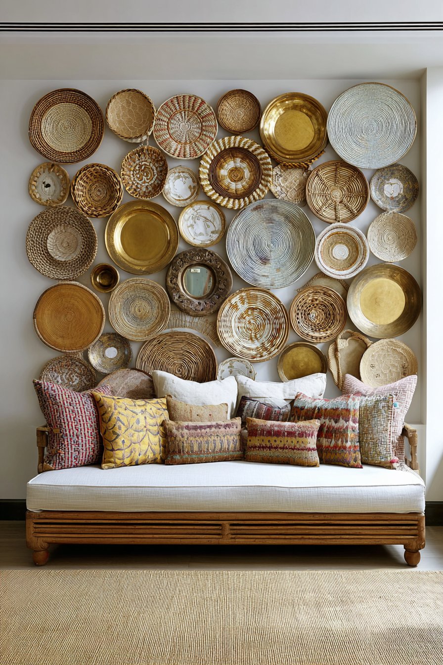 A low-profile sofa with colorful pillows sits below the wall display, its relaxed silhouette complementing the bohemian aesthetic. Natural jute area rug anchors the space with organic texture that echoes the natural materials in the wall collection. The asymmetrical arrangement creates visual interest that draws the eye across the wall, inviting close examination of individual pieces while reading as cohesive composition from distance.