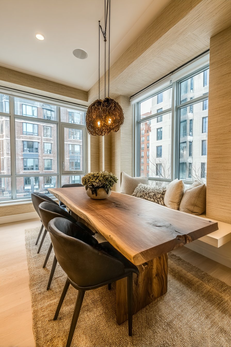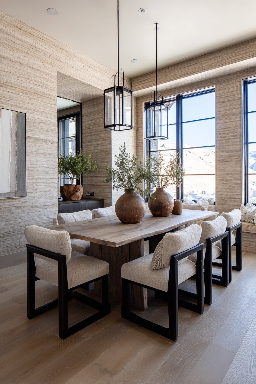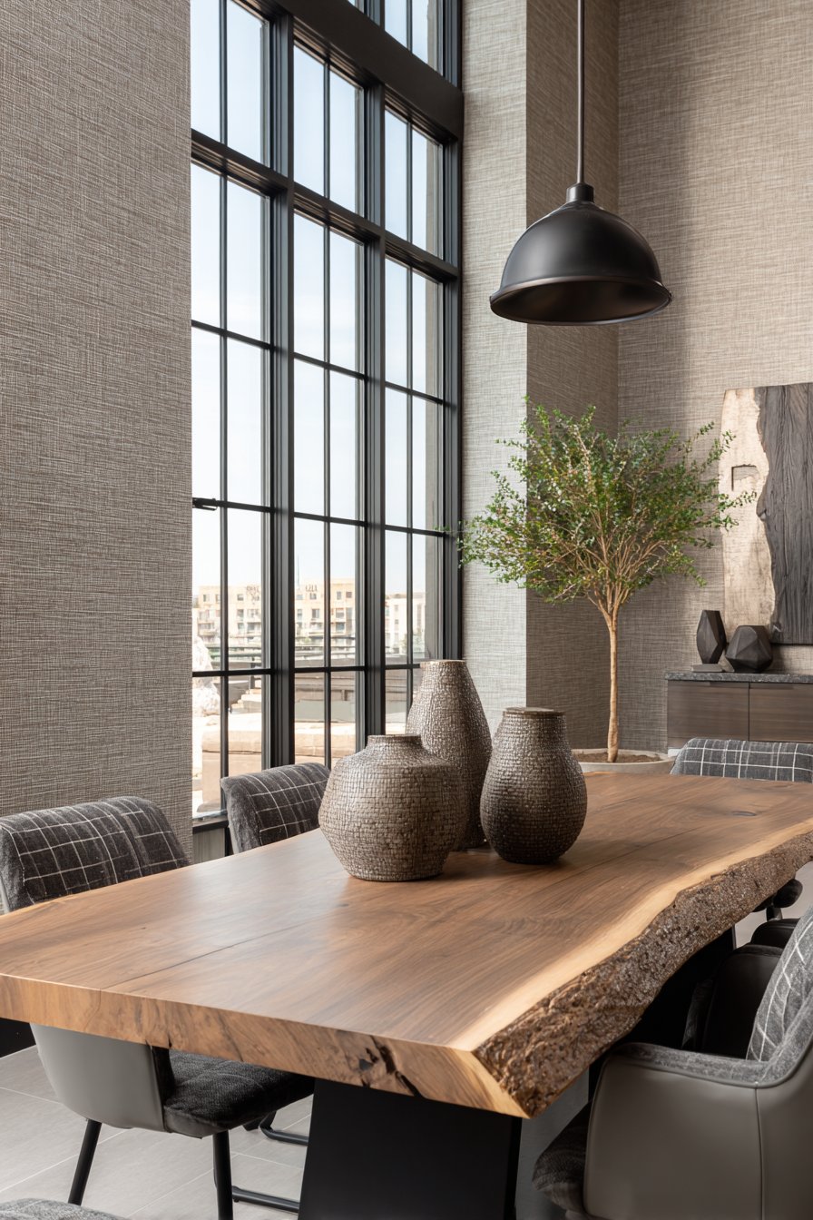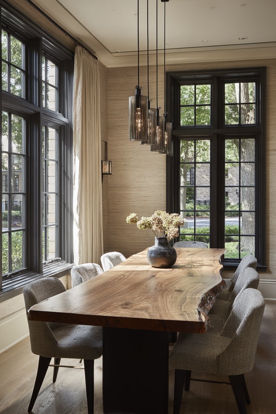 A live-edge wood dining table with modern chairs centers the space, its natural edge echoing the organic quality of the grasscloth walls. Simple pendant lighting in black metal provides focused task illumination above the dining table while maintaining visual simplicity that allows the wall texture to remain prominent. Natural window light emphasizes the grasscloth texture and fiber variations, showing how natural materials change appearance in different lighting conditions.
