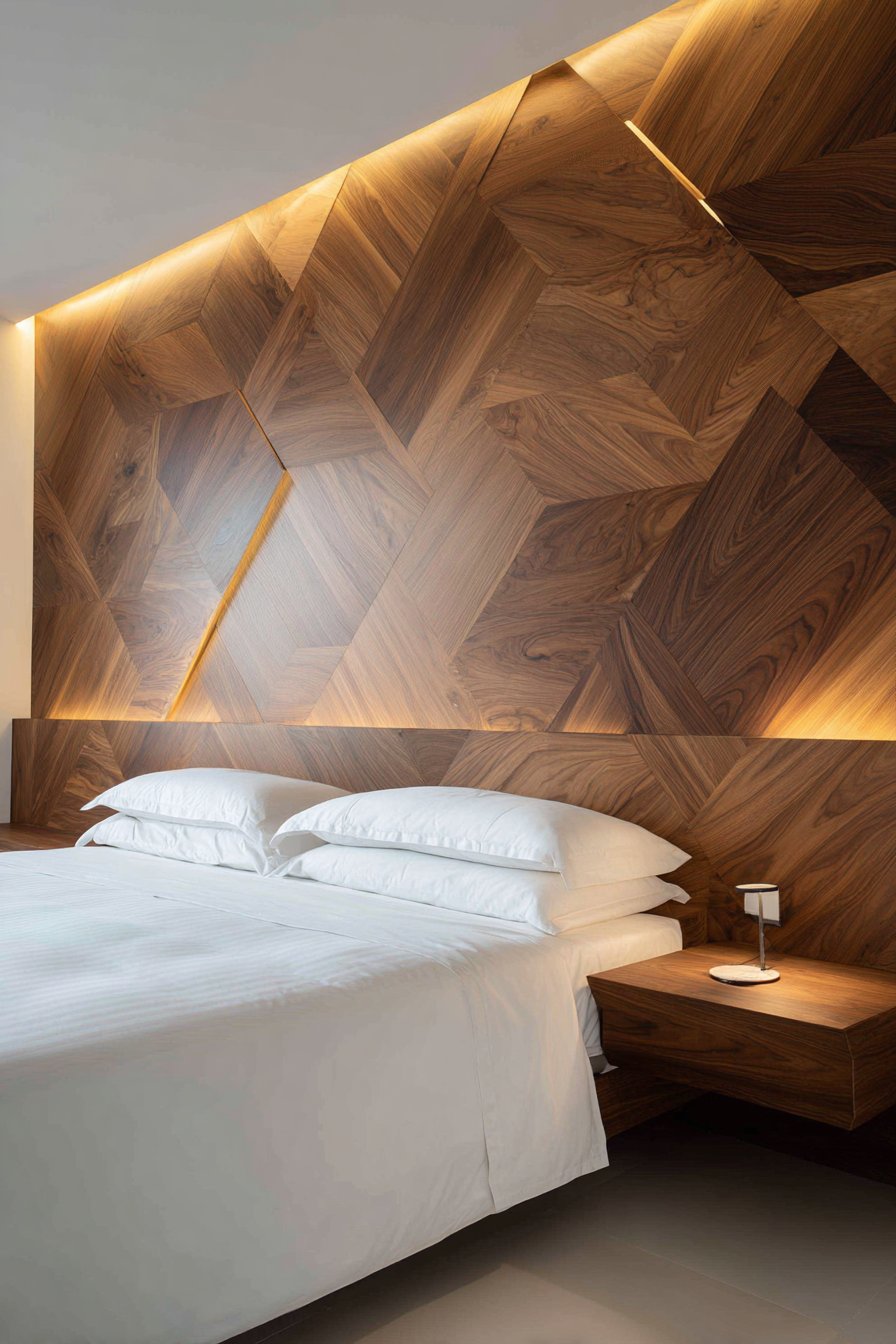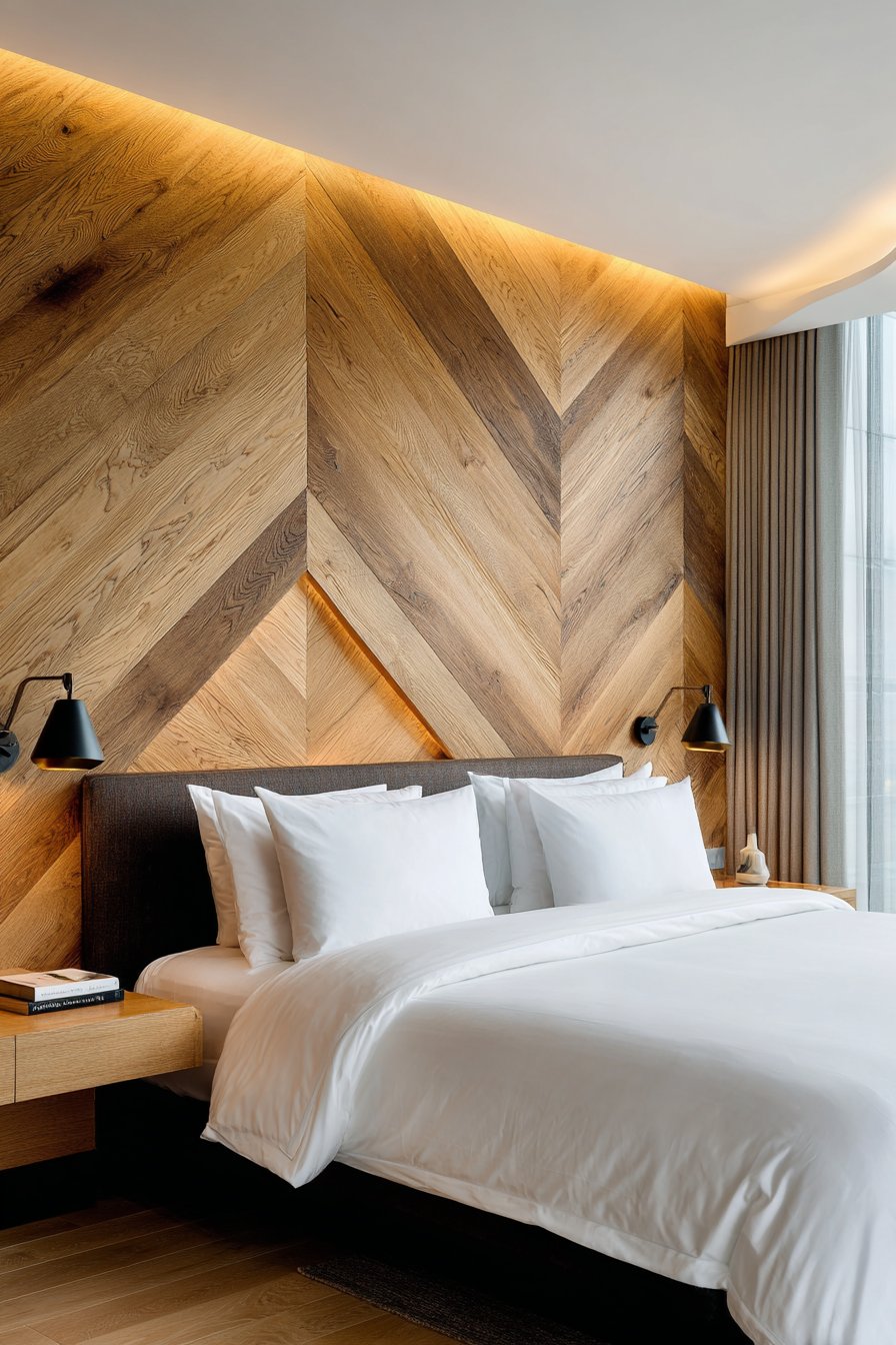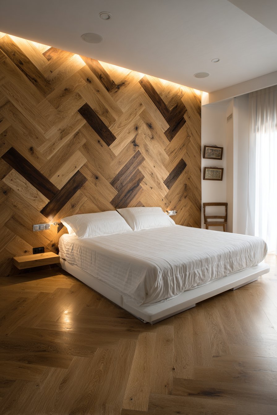 Interior design photography captures the herringbone pattern precision and wood tone contrast that makes this installation so striking. Natural daylight highlights the wood grain in both light and dark woods, showing their distinct characters while balanced exposure captures the installation craftsmanship and geometric complexity. This bedroom proves that wall design ideas utilizing pattern can succeed when executed with precision and paired with minimal furnishings that allow the patterned wall to remain the focal point without competition.