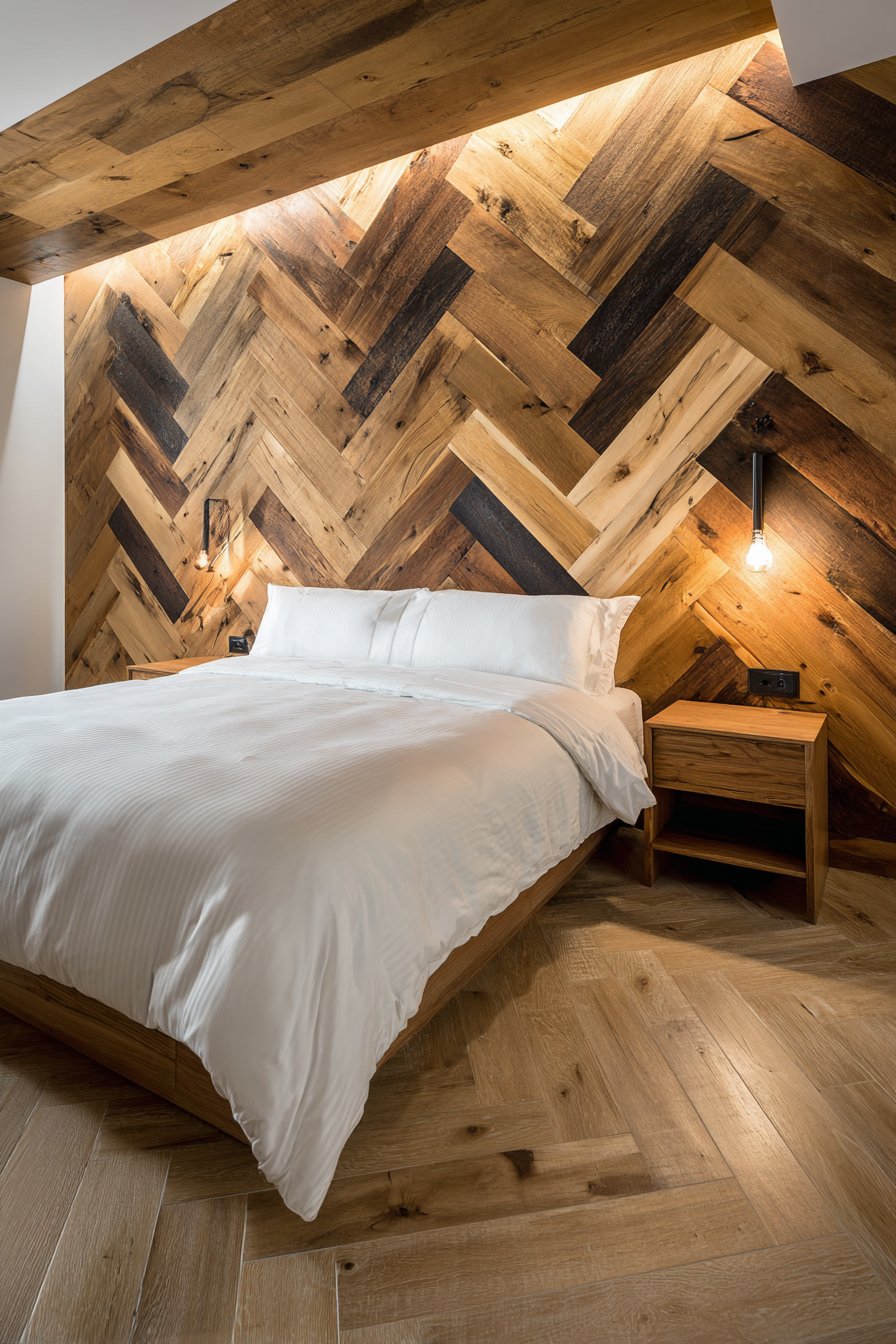 White bedding and minimal nightstands keep attention focused on the statement wall, their simplicity providing necessary visual rest against the complex geometric pattern. Integrated LED strip lighting along wall edges provides ambient glow that highlights the wood grain and emphasizes the herringbone pattern during evening hours. The two-tone wood combination creates value contrast that makes the geometric pattern more visible and dramatic than single-tone installations.