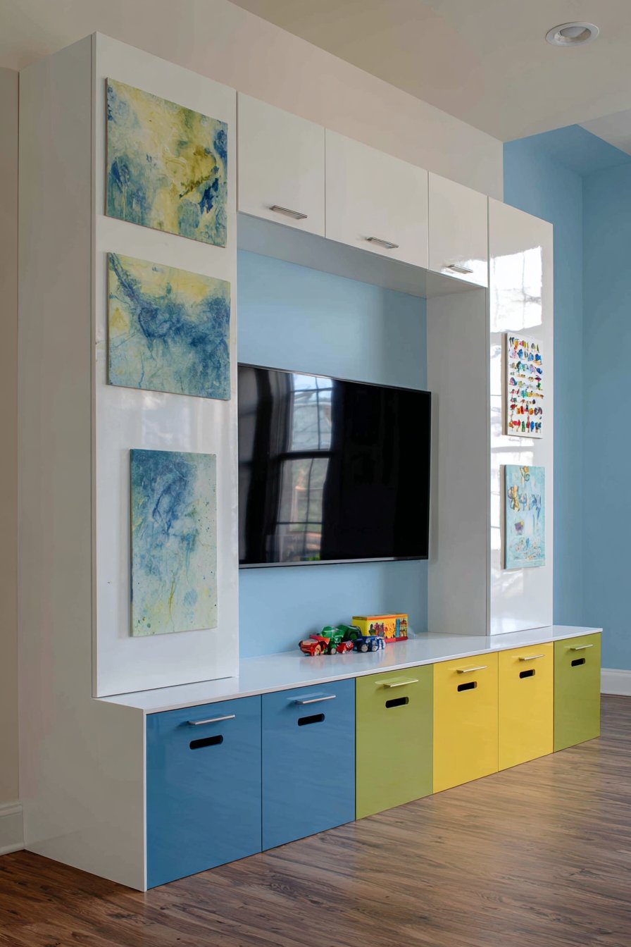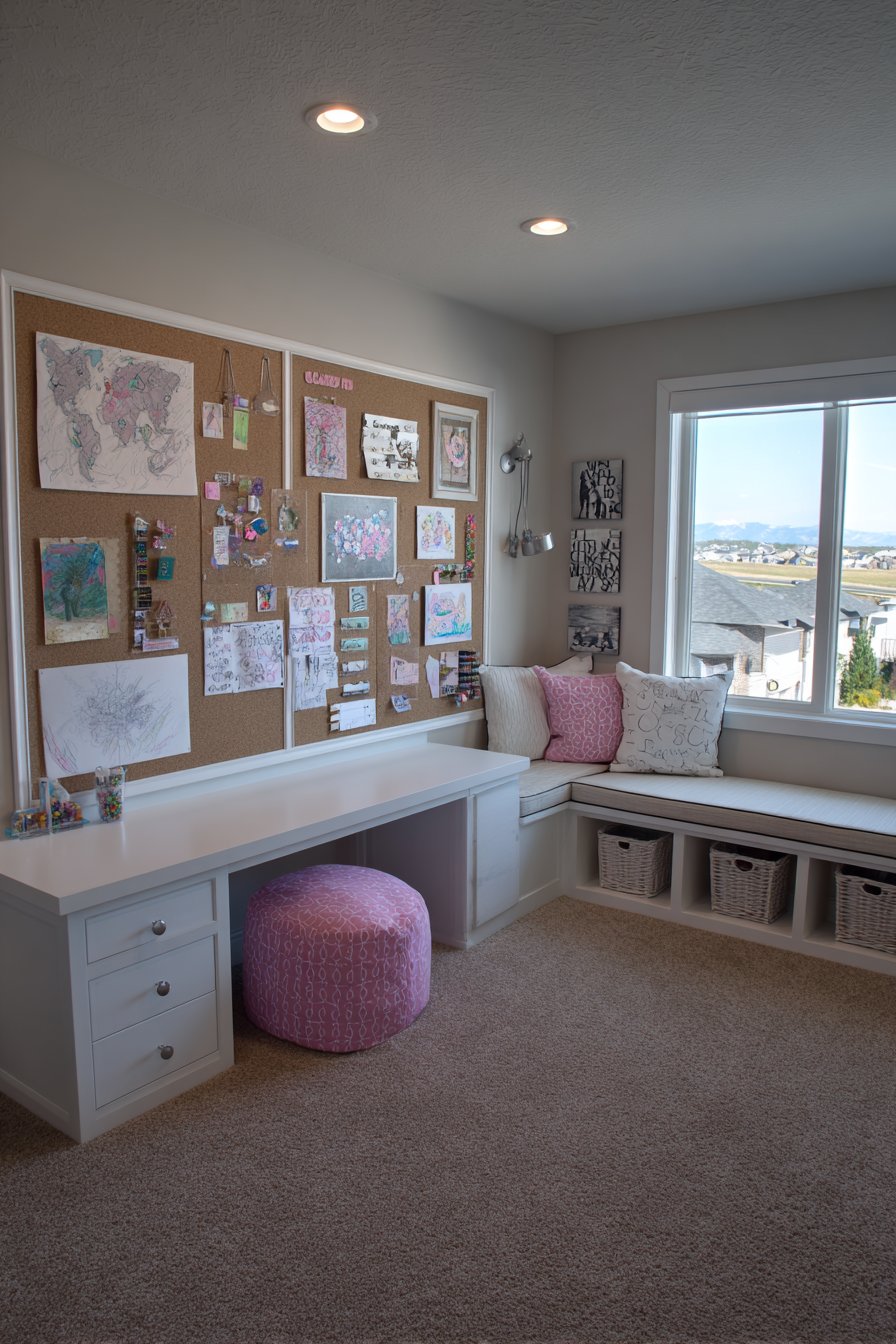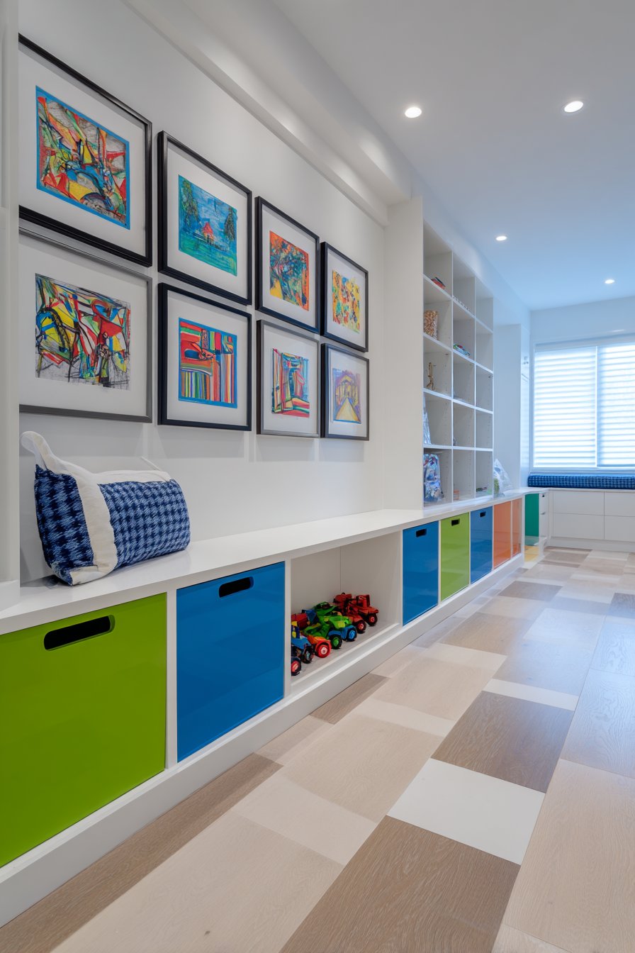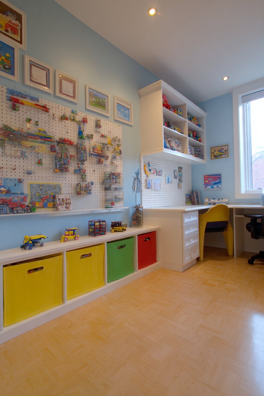 Built-in low storage cubbies run along the base in colorful painted finishes, providing accessible toy storage at child height while introducing cheerful color. Durable laminate flooring handles active play and easy cleanup essential in spaces dedicated to children’s activities. The combination of magnetic surface, cork boards, and low storage creates comprehensive organizational system that keeps playroom functional yet uncluttered.