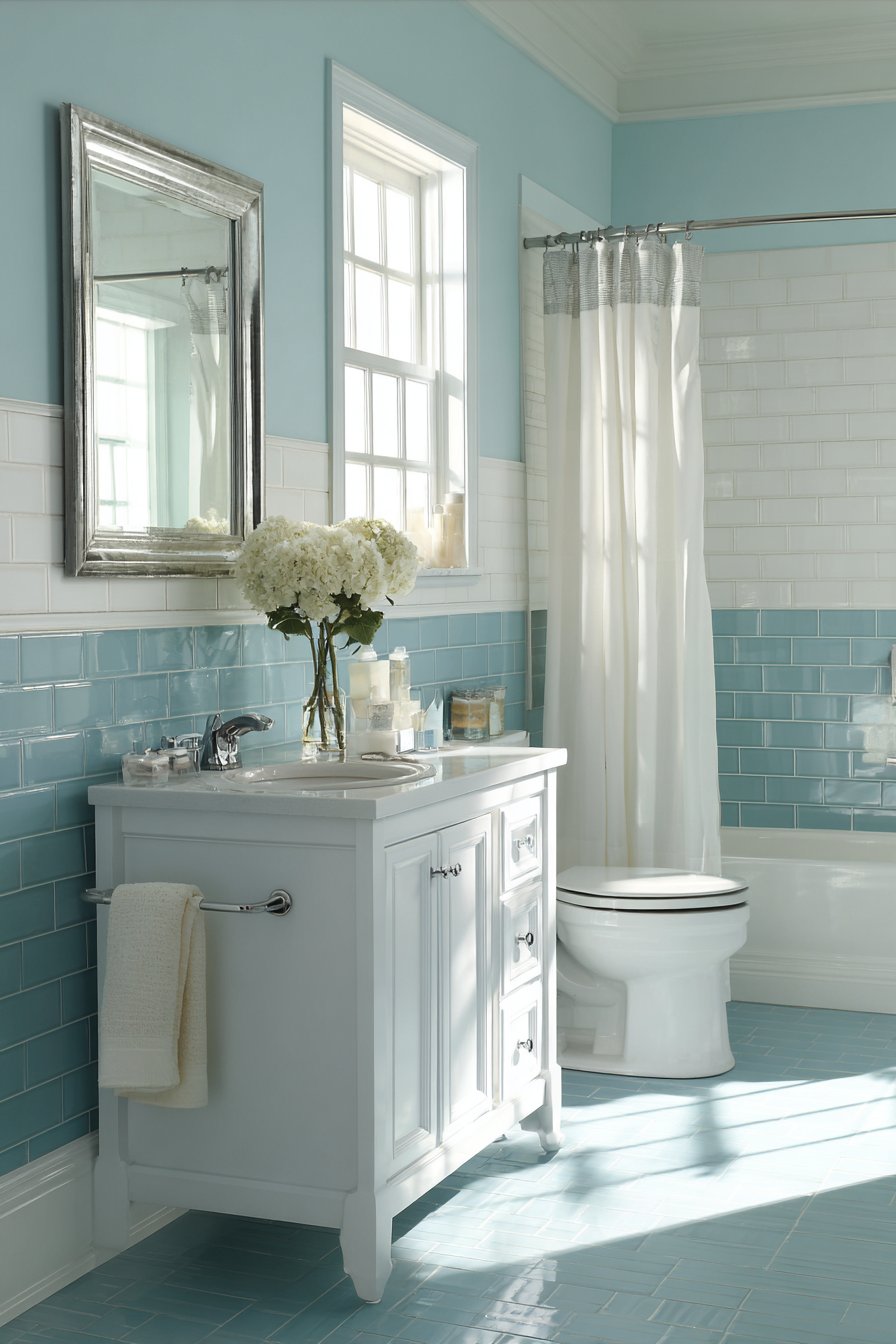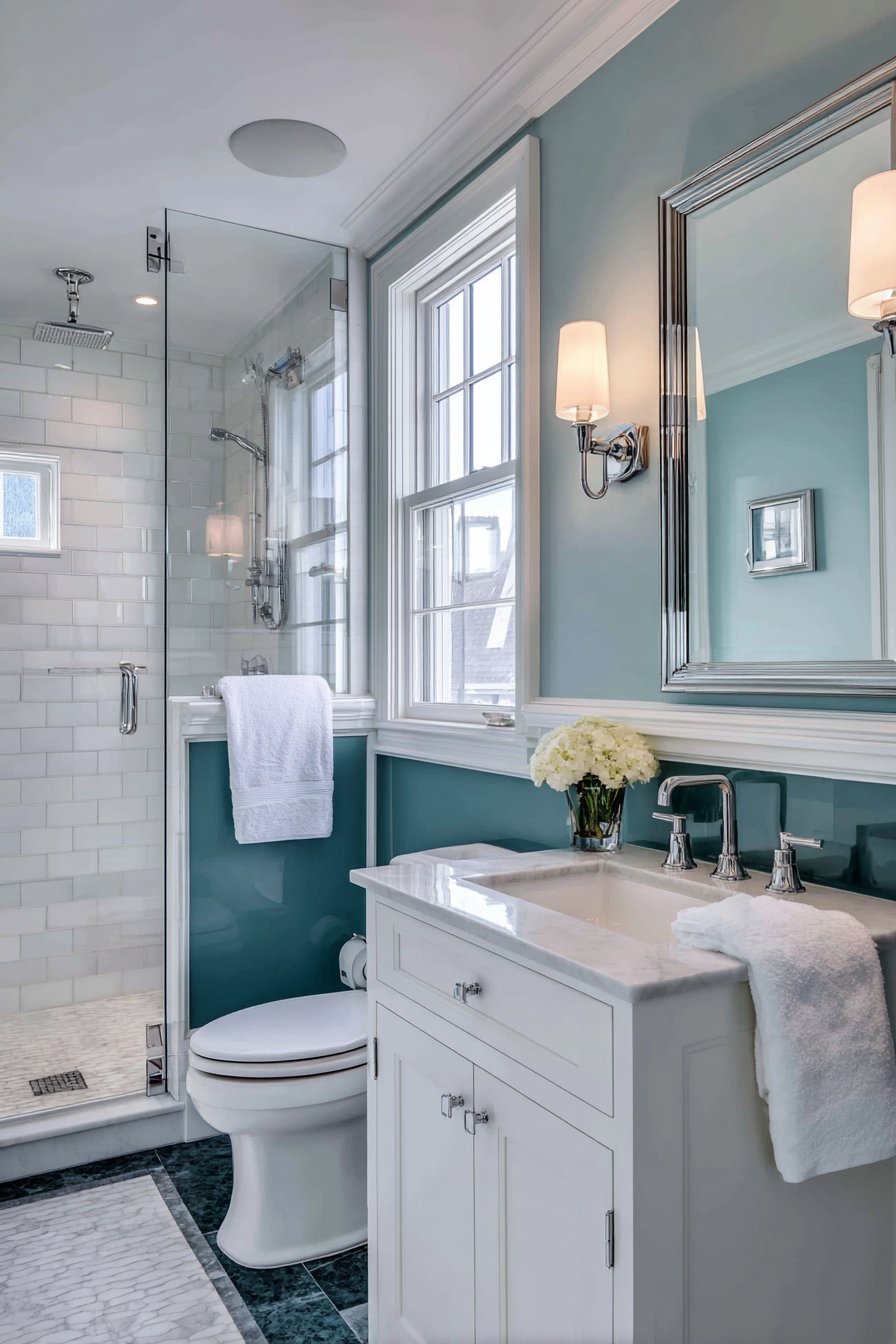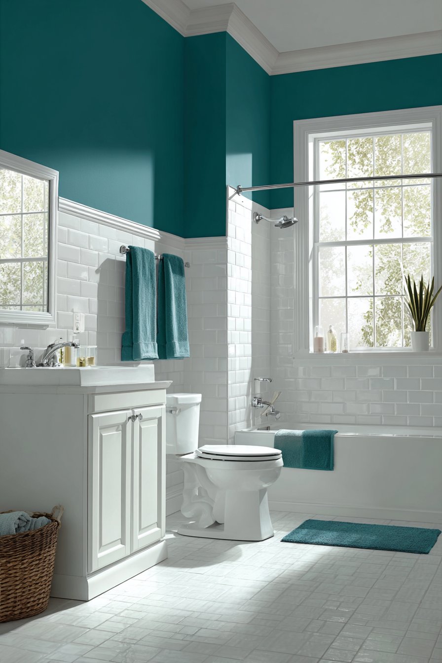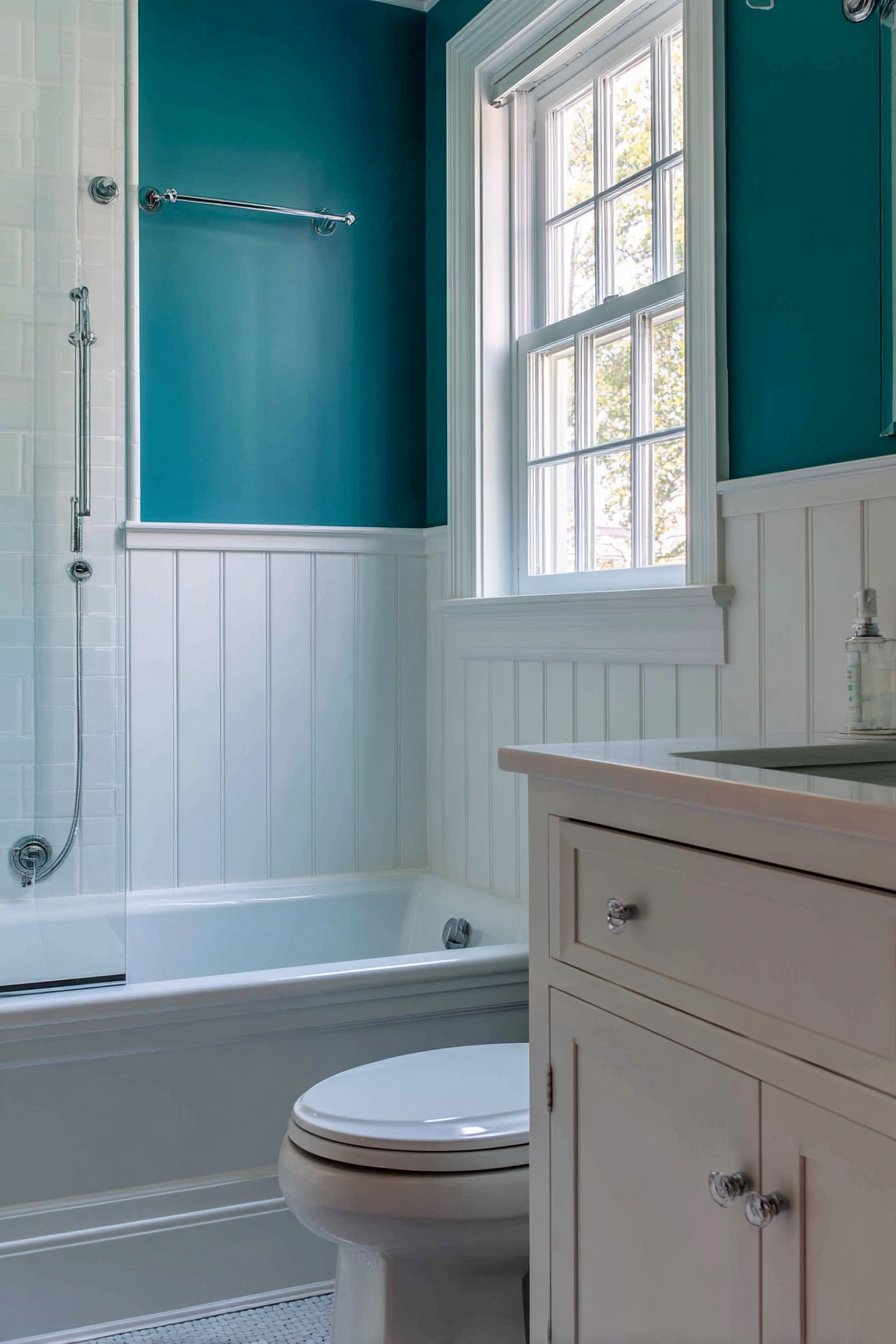 Interior photography with natural window light captures both paint colors accurately, balanced exposure preventing the teal from appearing too dark while showing the crisp white upper walls. Wide-angle view demonstrates the color proportion and molding detail that defines the two-tone treatment, providing scale reference for readers considering similar approaches. This bathroom proves that wall design ideas need not be expensive or complex to deliver significant impact—sometimes thoughtful paint application combined with simple trim work creates all the interest a space needs.