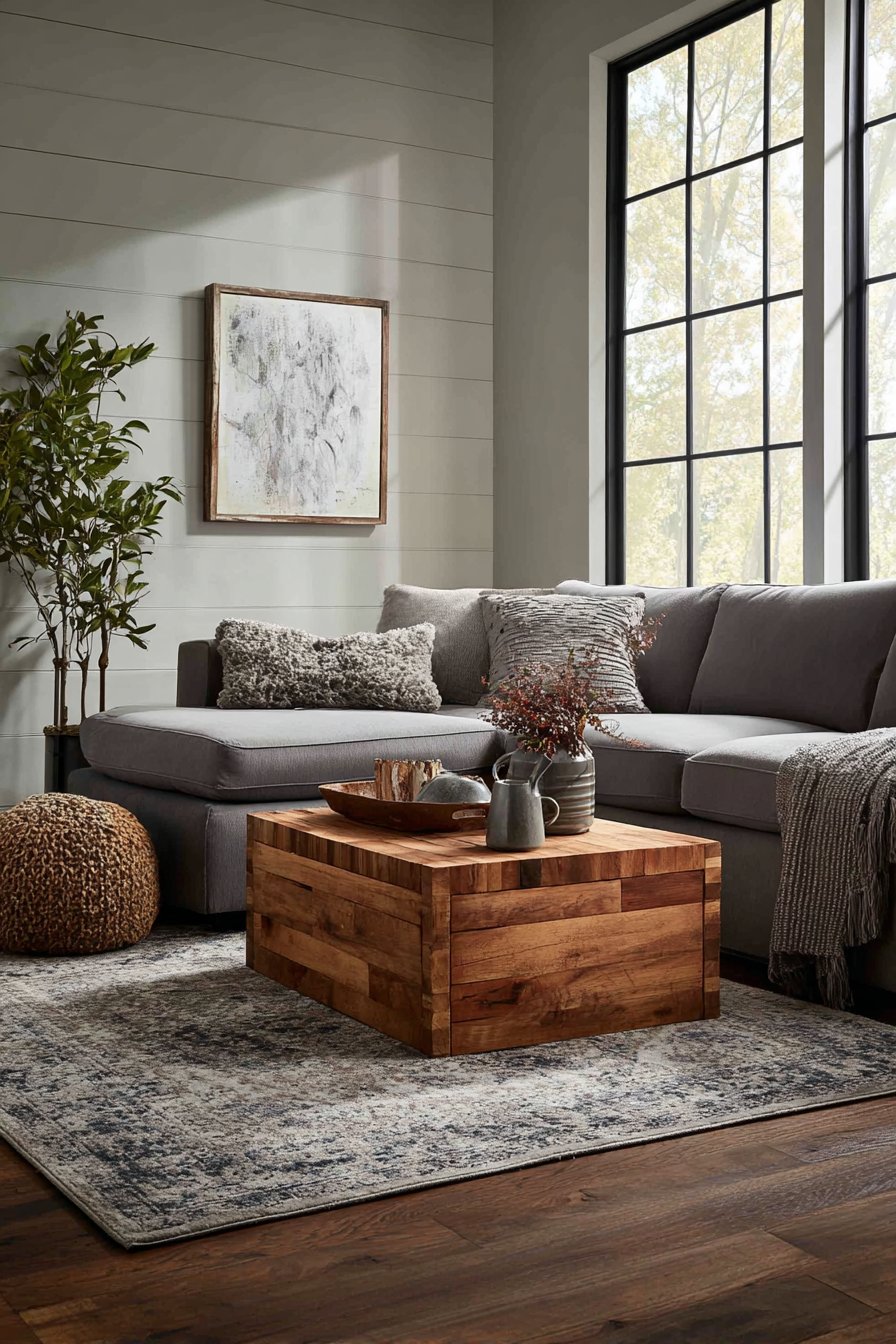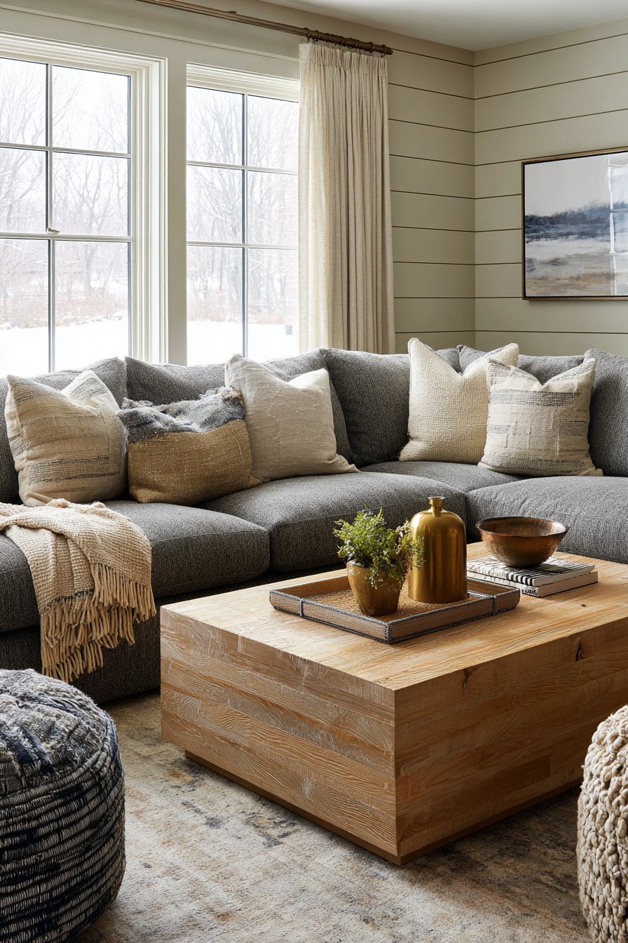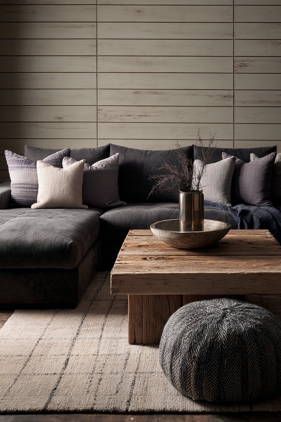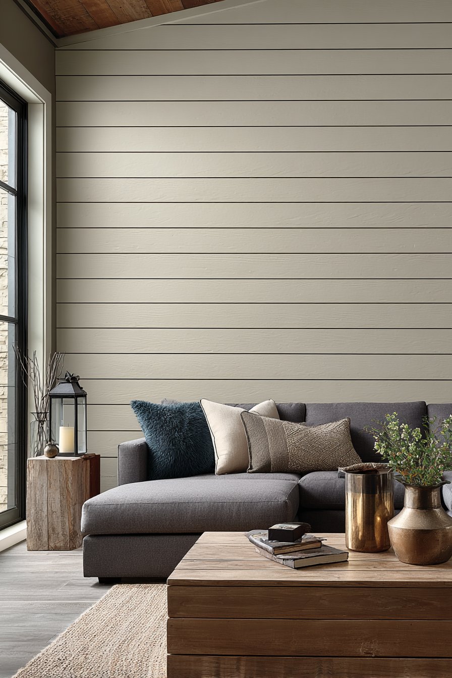 A contemporary sectional in deep gray sits in front of the shiplap wall with mixed metallic accents in decor accessories creating sophisticated material palette. Natural wood coffee table adds warmth that prevents the gray and greige palette from feeling cold. The horizontal orientation of the shiplap creates subtle visual rhythm that adds interest without overwhelming, proving that pattern can be achieved through installation technique as much as through color or material choices.