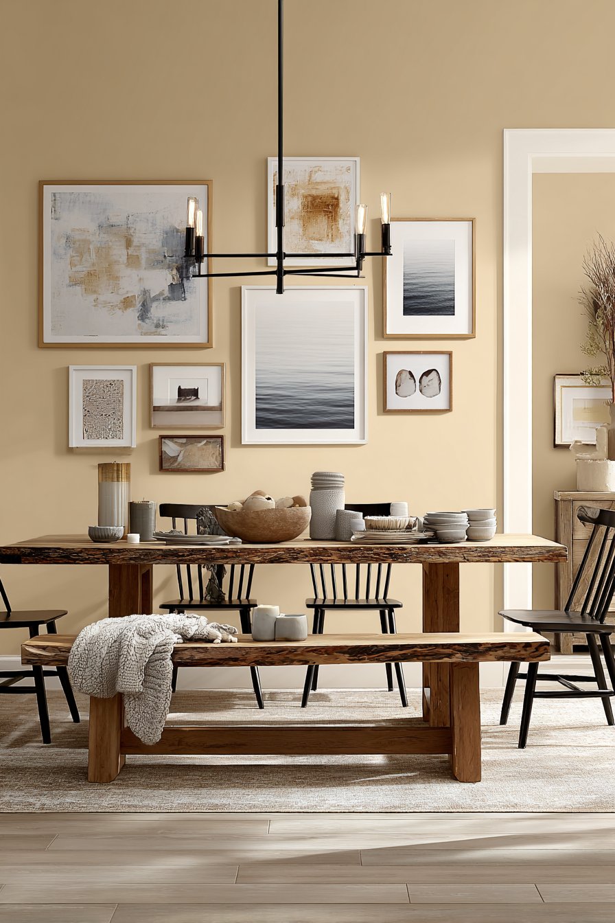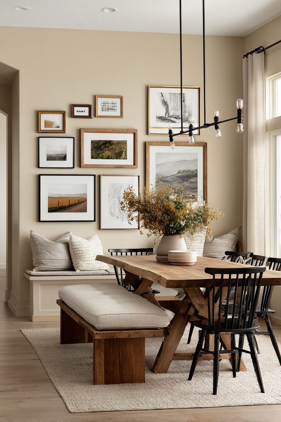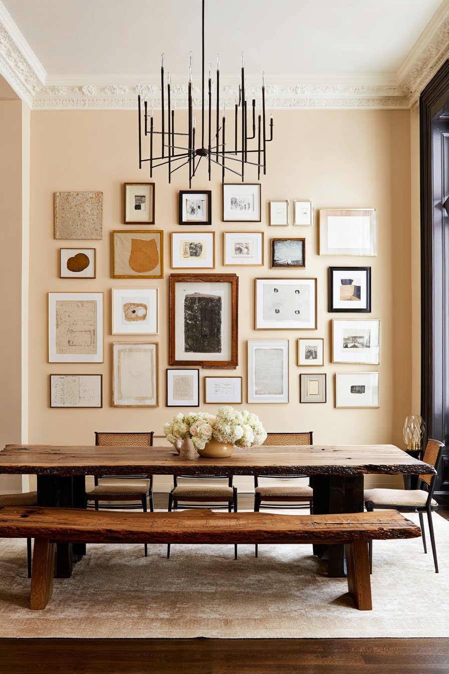 The dining room showcasing wall design ideas through a masterfully arranged gallery wall demonstrates how collections of artwork can transform a simple painted surface into a dynamic visual story. This mixed-frame installation features varying sizes of prints, photographs, and abstract art pieces in black, natural wood, and brass finishes, creating an asymmetrical layout that feels both intentional and organic. The warm beige painted wall provides a neutral backdrop that allows each piece to shine while creating cohesion across the diverse collection.