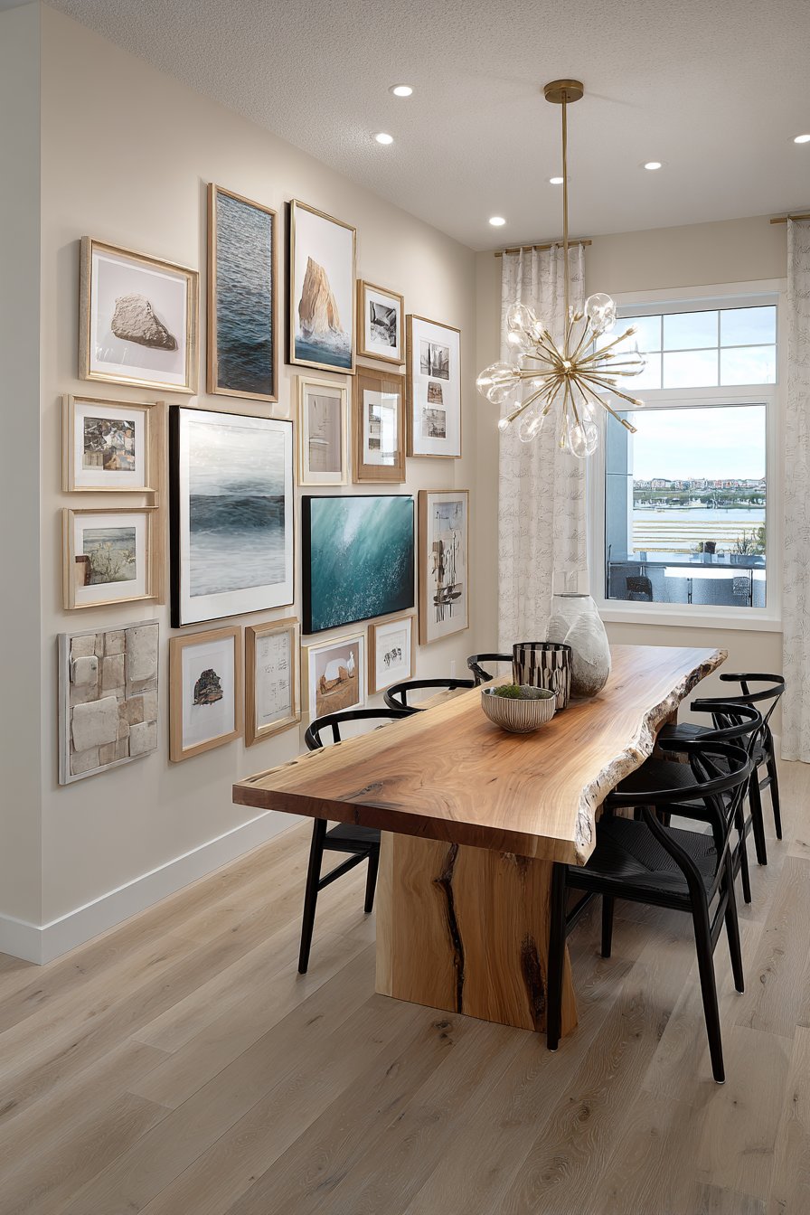 A live-edge wooden dining table centers the room beneath modern chandelier lighting, grounding the eye-level art display while the natural wood edge echoes the organic quality of the wooden frames above. The composition demonstrates how gallery walls should relate to furniture placement—in this case, the arrangement’s width roughly corresponds to the table below, creating visual harmony between wall treatment and room furnishings. Interior design photography with detail focus captures the careful curation of art selection and frame variety, with soft natural lighting preventing glare on glass surfaces while highlighting the distinct character of each frame’s finish and texture.