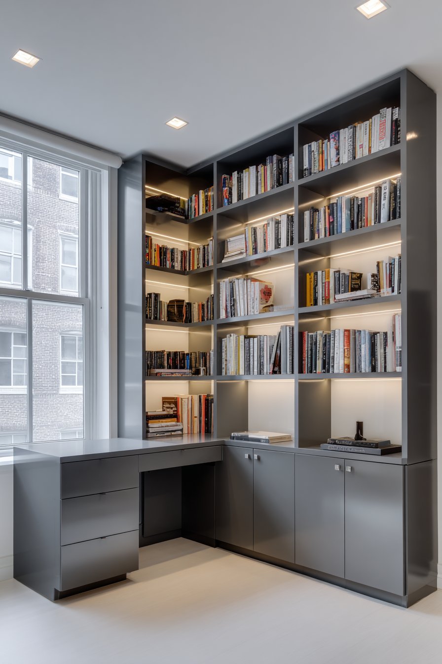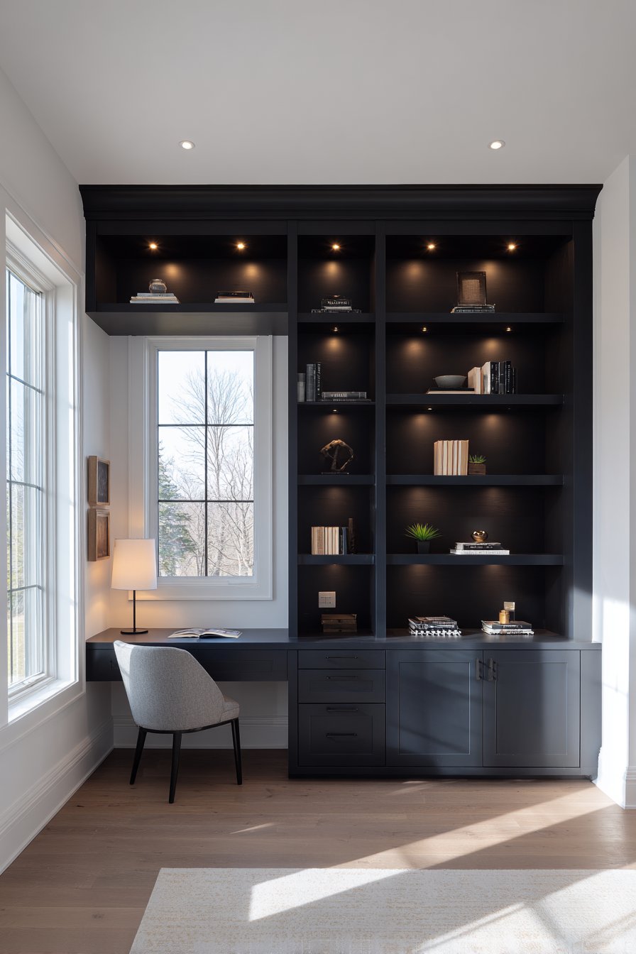 The millwork’s thoughtful design includes closed lower cabinets that conceal office supplies, paperwork, and equipment, maintaining visual calm at eye level where open shelving displays carefully curated items. A small floating desk extends seamlessly from the shelving unit, demonstrating efficient space utilization that maximizes functionality without requiring additional floor space. The white walls surrounding the built-in create dramatic contrast that makes the charcoal installation read as a distinct architectural element rather than simply painted cabinetry.