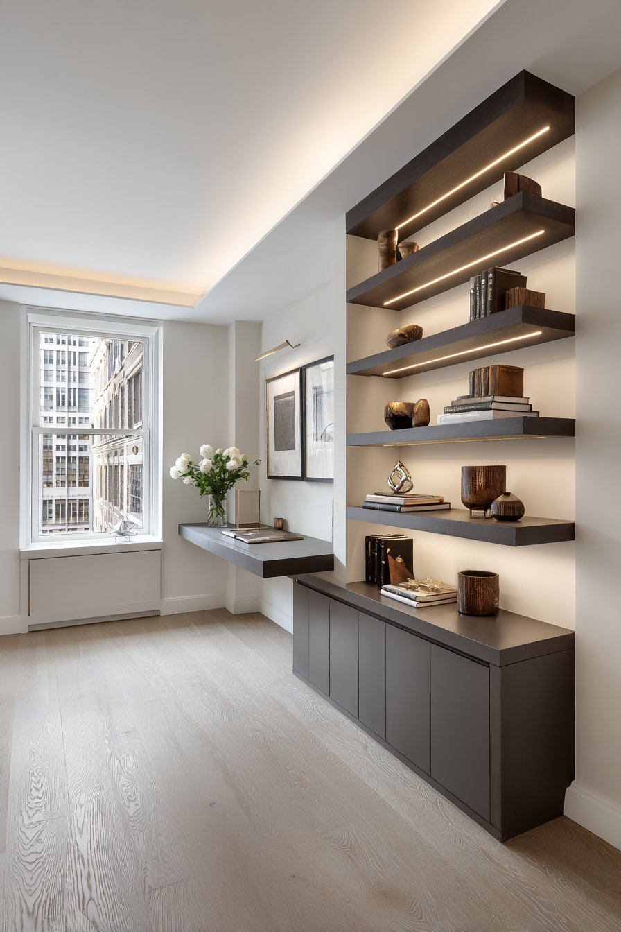 Contemporary home office wall design ideas find their ultimate expression in custom floor-to-ceiling built-in shelving that combines closed storage, open display, and integrated workspace in one cohesive installation. The matte charcoal finish creates sophisticated backdrop for books and decorative objects while the integrated LED strip lighting on each shelf level adds both functionality and atmospheric ambiance. This wall treatment exemplifies how wall design ideas can merge aesthetic appeal with practical organization, turning an entire wall into a hardworking element that serves multiple purposes.
