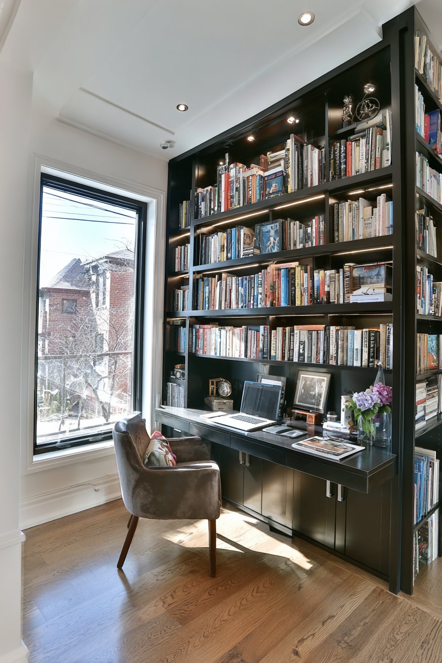 Recessed lighting overhead ensures adequate task illumination for work activities, complementing the shelf lighting system to create layered illumination that adapts to different needs throughout the day. Wide-angle interior photography captures the impressive scale of this floor-to-ceiling installation, showing how custom millwork can completely transform a room’s character while providing exceptional storage capacity. Natural daylight from a nearby window adds warmth to the space, preventing the dark finish from feeling heavy while highlighting the organized display of books and objects that give the office personality and lived-in charm.