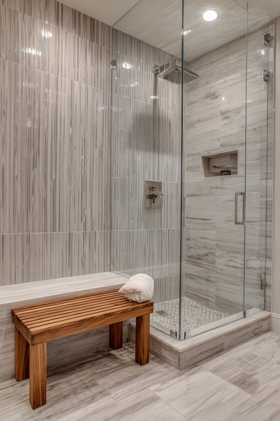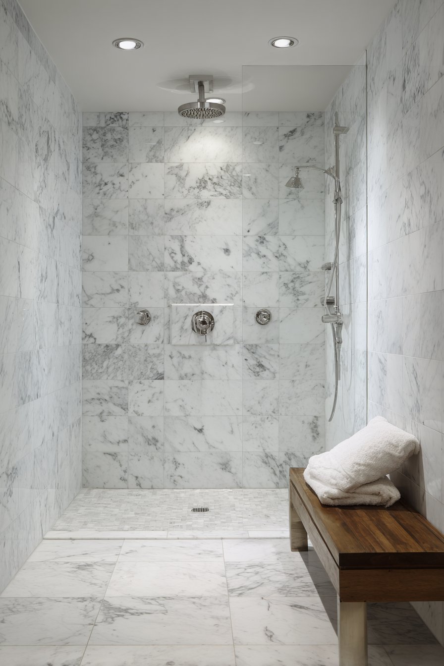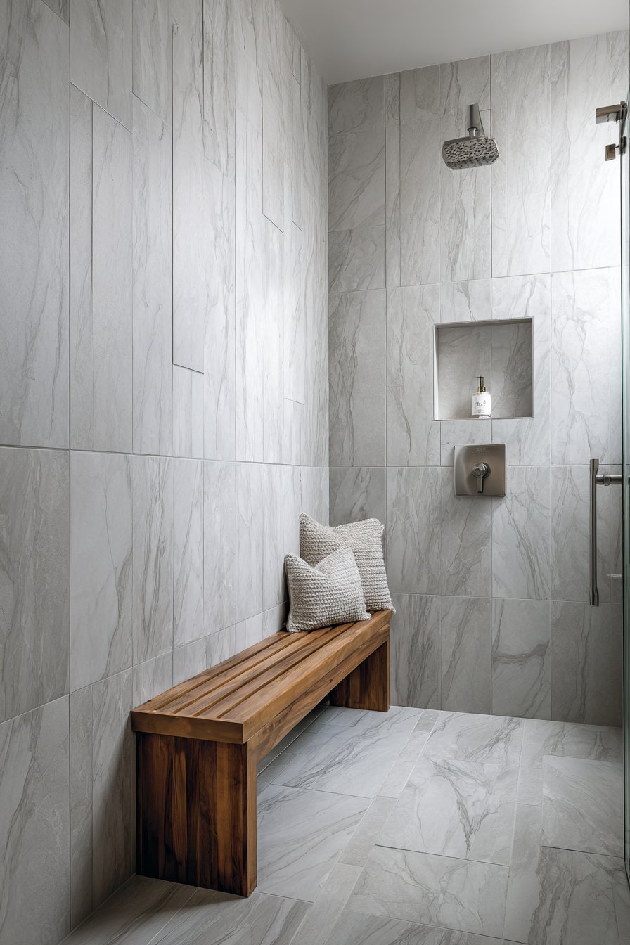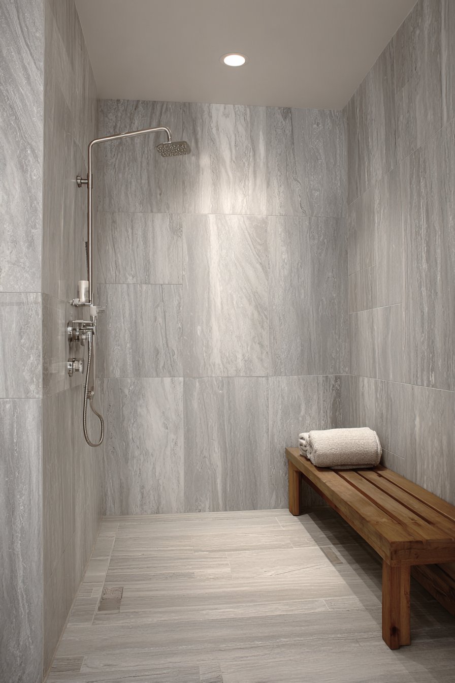 Brushed nickel fixtures and a rainfall showerhead complement the cool gray tones while adding subtle metallic shimmer that catches light beautifully against the tile surface. A floating teak bench introduces warm organic contrast, its rich honey tones preventing the gray palette from feeling cold while providing practical seating. Professional interior photography with balanced exposure captures the tile pattern precision and veining detail, with soft diffused lighting highlighting the smooth porcelain surface and subtle color variations that make each tile unique while maintaining overall cohesion.