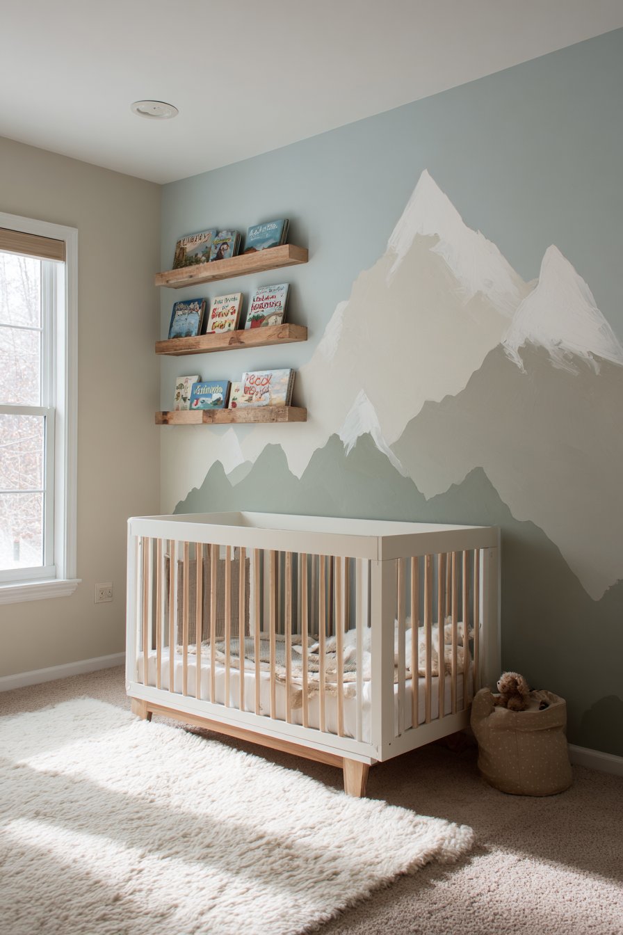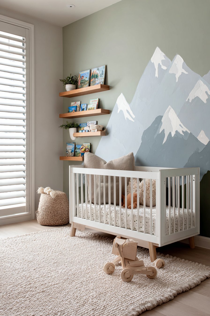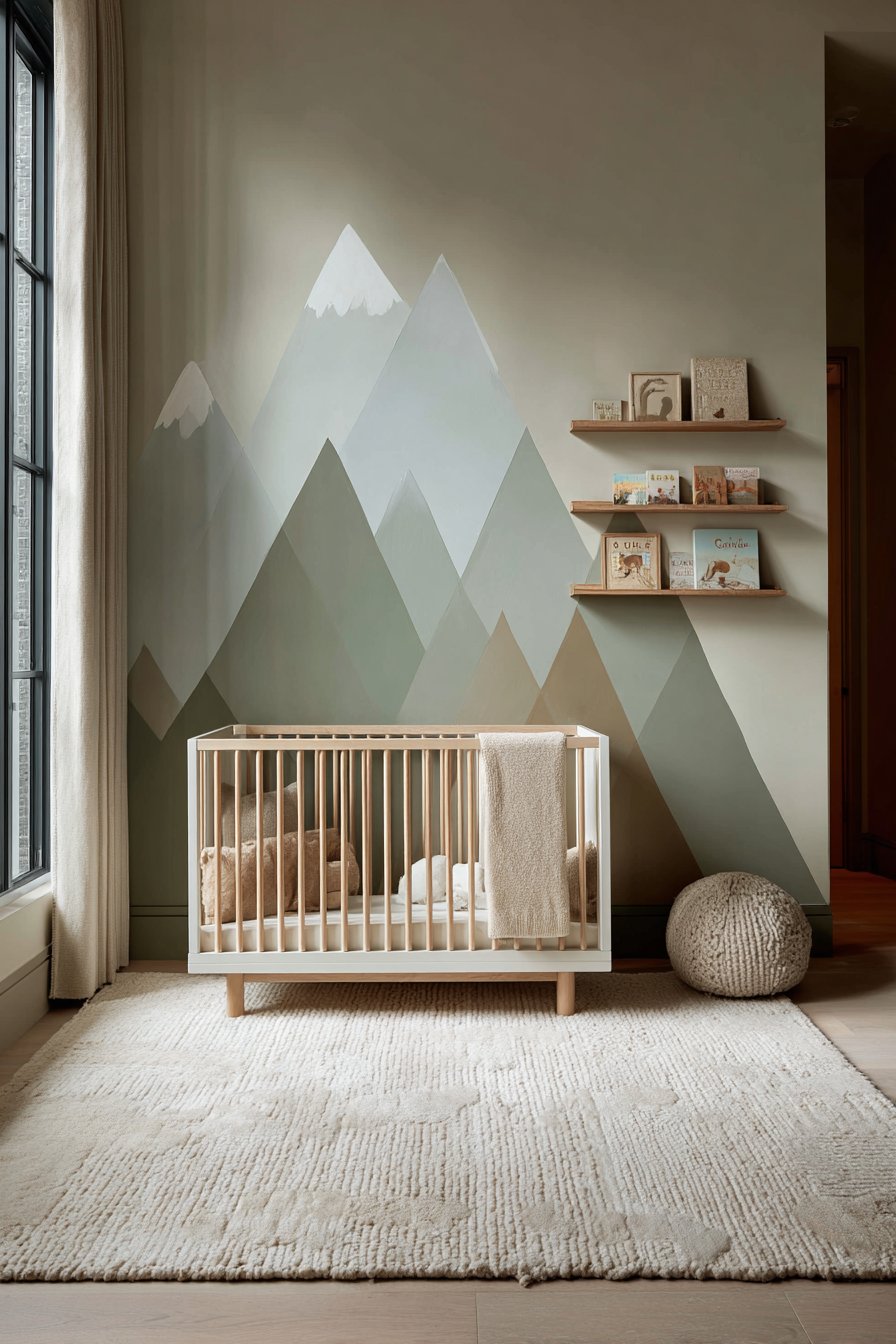 Modern nursery wall design ideas embrace whimsy and serenity through a hand-painted mountain mural featuring soft sage green, dusty blue, and warm taupe tones that create a peaceful backdrop for early childhood. This stylized mountain range extends across the main wall behind a white crib, demonstrating how wall design ideas can set the entire mood for a space through custom artwork that grows with the child. The gentle color palette and simplified forms make this mural appropriate for infants while remaining sophisticated enough to transition through toddler years.