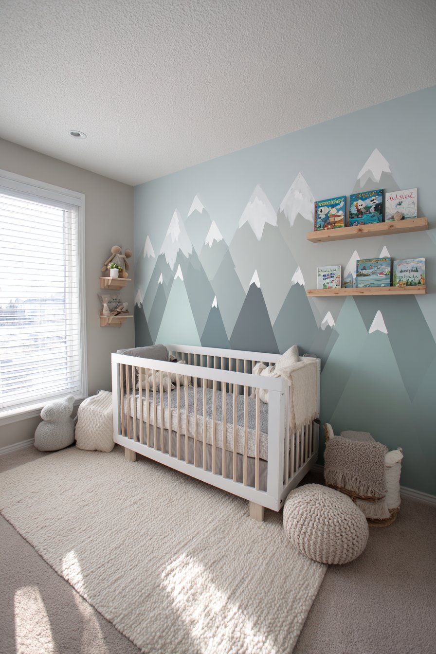 Interior design photography captures the full mural composition with natural window light creating gentle shadows that enhance the painted texture and dimensional quality of the stylized peaks. The wide-angle perspective shows how the mural integrates seamlessly with room furnishings, serving as backdrop rather than overwhelming focal point. This balance is crucial in nursery design where the wall treatment should stimulate without overstimulating, creating an environment that feels both engaging and restful for young children and exhausted parents alike.