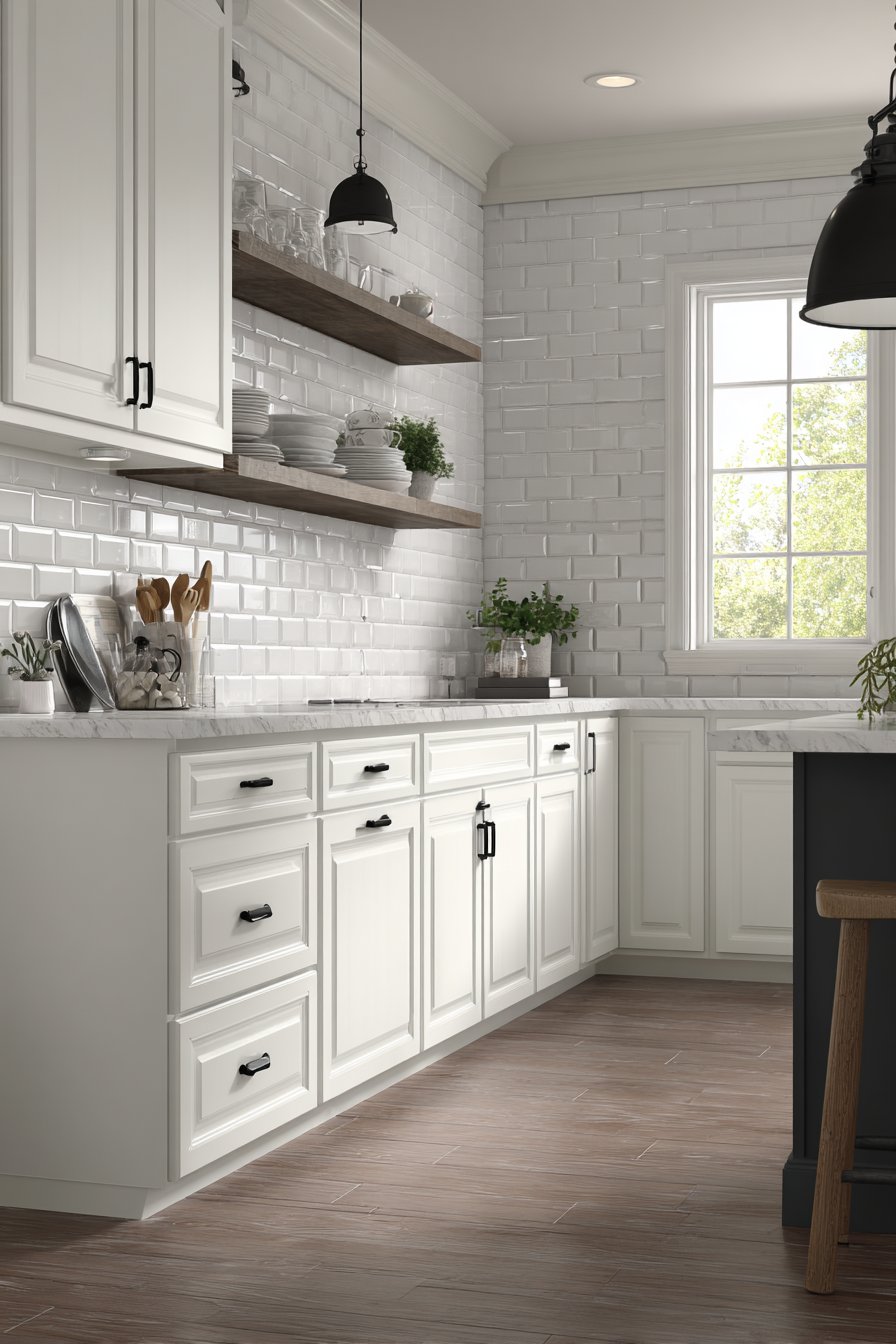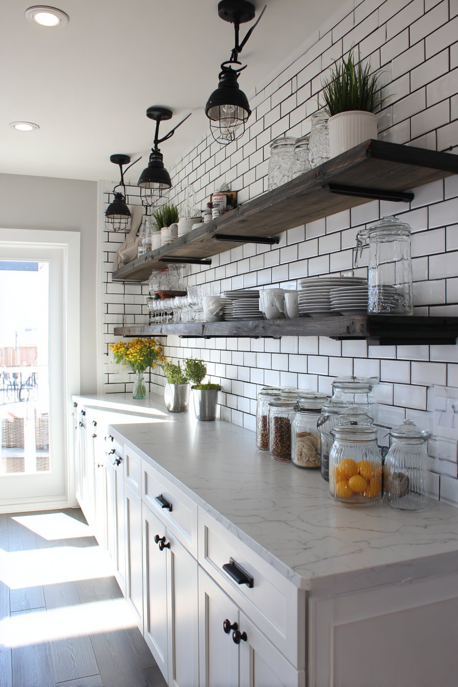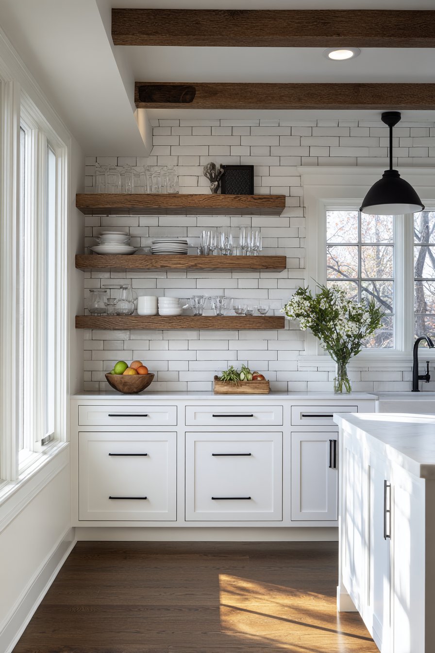 Open wooden shelving interrupts the tile at strategic points, providing practical storage for everyday dishes and glassware while breaking up the expanse of white tile to prevent monotony. This integration of natural wood against crisp white tile introduces warmth that keeps the kitchen from feeling too clinical or stark. Matte black cabinet hardware and pendant lights provide modern contrast that updates the classic tile, proving that wall design ideas can successfully bridge traditional and contemporary aesthetics.