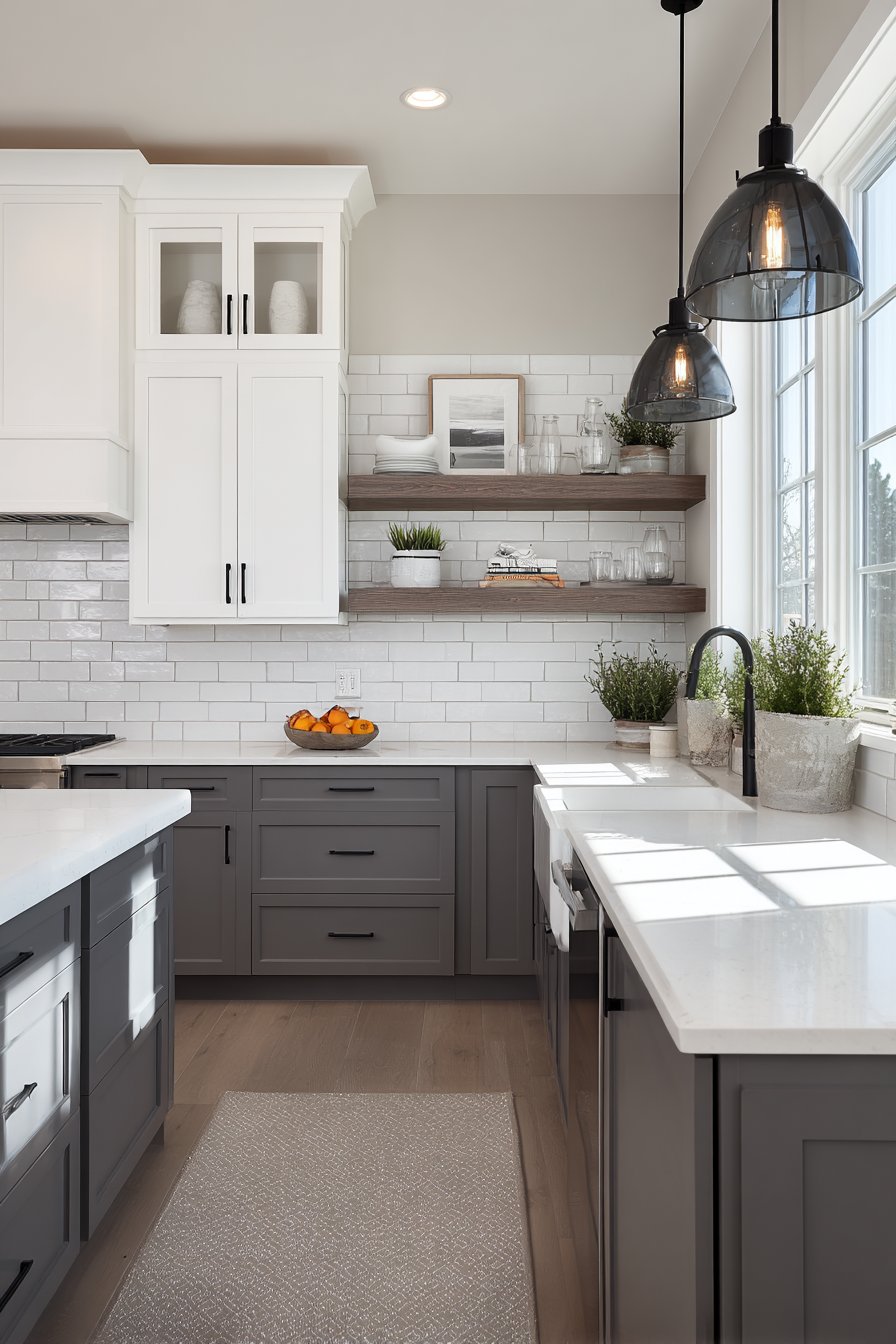 Kitchen wall design ideas achieve timeless appeal through a floor-to-ceiling subway tile backsplash in classic white with contrasting dark gray grout, demonstrating how traditional materials can create fresh impact through thoughtful installation. This expansive tile treatment extends from countertop to ceiling rather than stopping at the typical backsplash height, transforming the entire wall into a clean, bright surface that’s both practical and visually striking. The horizontal brick pattern installation honors subway tile’s heritage while the dramatic scale brings contemporary relevance.