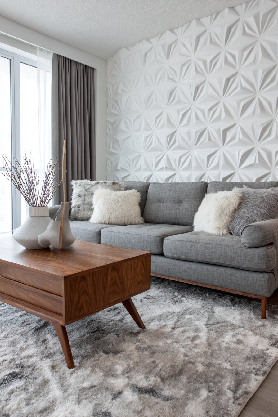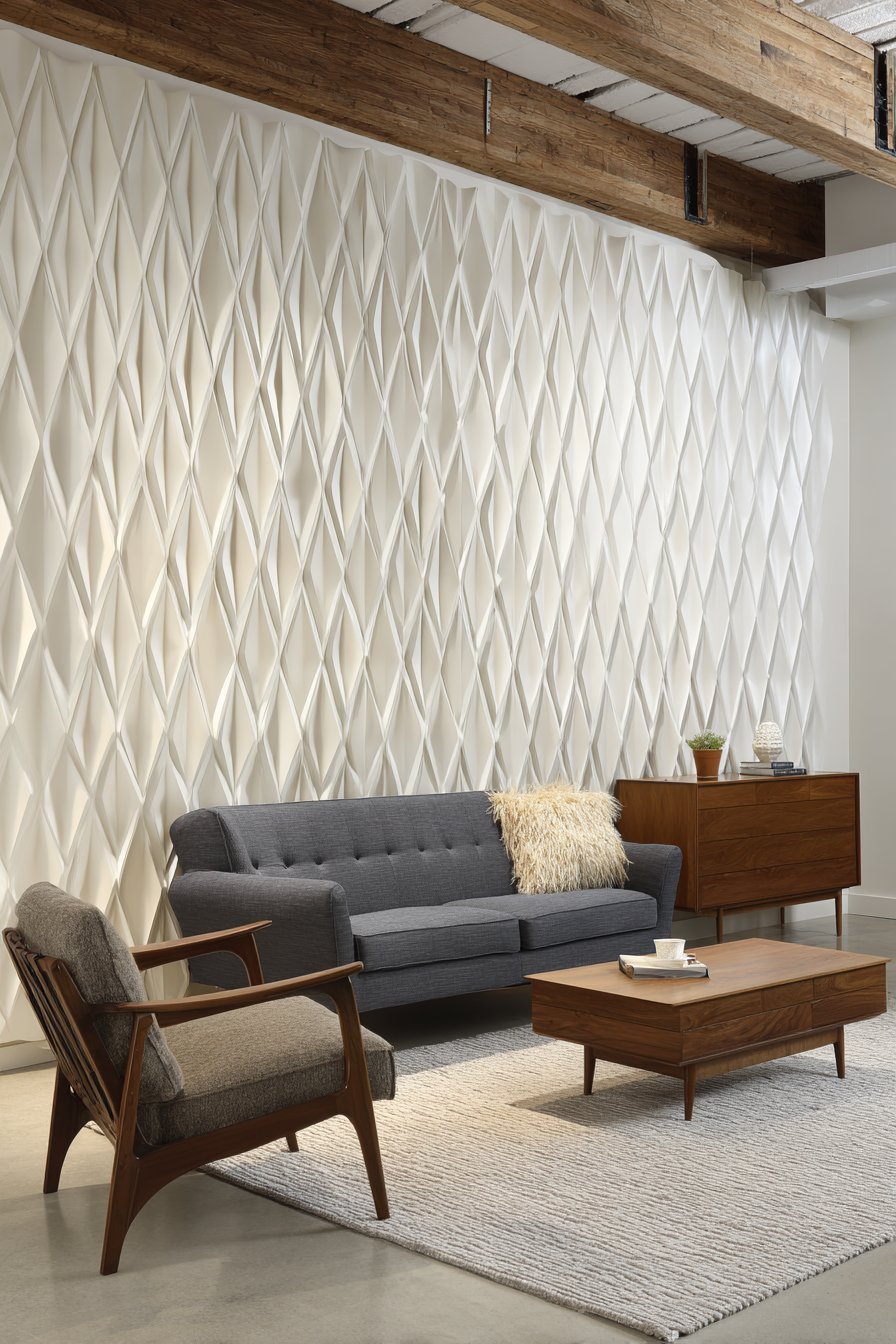 Mid-century modern walnut furniture pieces complement the contemporary wall treatment, their warm organic tones providing perfect counterpoint to the cool white geometric precision of the panels. A wool area rug in warm gray tones grounds the seating area, its soft texture contrasting with the hard architectural quality of the wall panels. This interplay of textures—soft and hard, organic and geometric—creates richness and depth that makes the space feel carefully curated and thoughtfully designed.