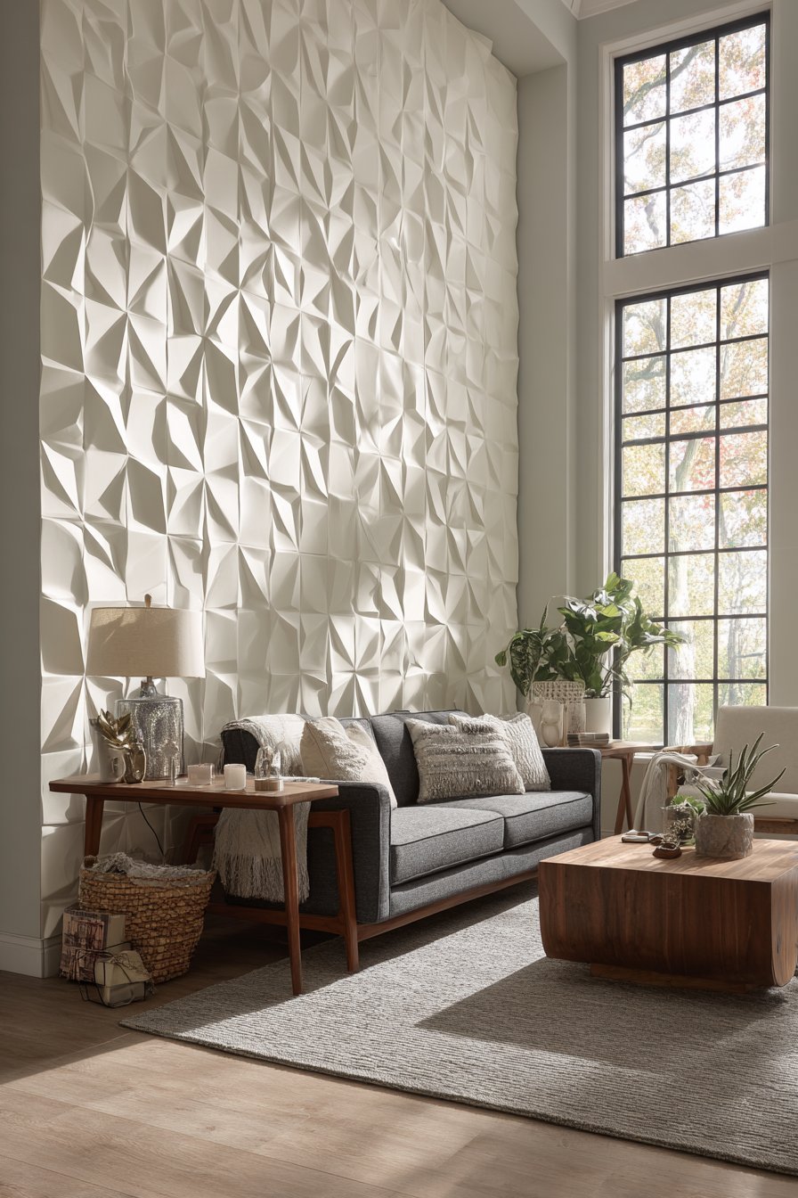 Living room wall design ideas reach architectural heights with textured 3D geometric wall panels in soft white that create dramatic play of light and shadow across the accent wall. These three-dimensional diamond-pattern panels add sculptural interest without introducing color, demonstrating how wall design ideas can achieve impact through form and texture alone. The panels serve as a stunning backdrop for a modern sofa, transforming a flat wall into a dynamic surface that changes character as light conditions shift throughout the day.