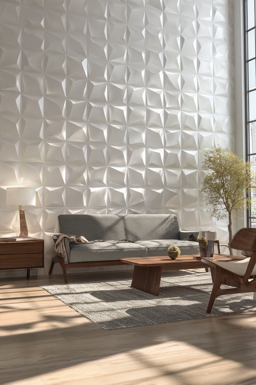 Wide-angle interior design photography captures the full panel installation and the shadow patterns created by natural side lighting, which changes throughout the day to reveal different aspects of the dimensional design. Detail focus on panel edges shows the clean installation and dimensional depth that makes this treatment so effective. The panels’ geometry creates a sense of movement and energy that prevents the monochromatic white palette from feeling flat or boring, proving that successful wall design ideas can deliver visual excitement through form rather than relying solely on color or pattern.