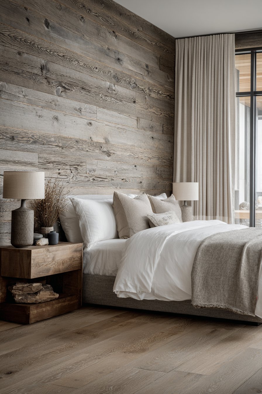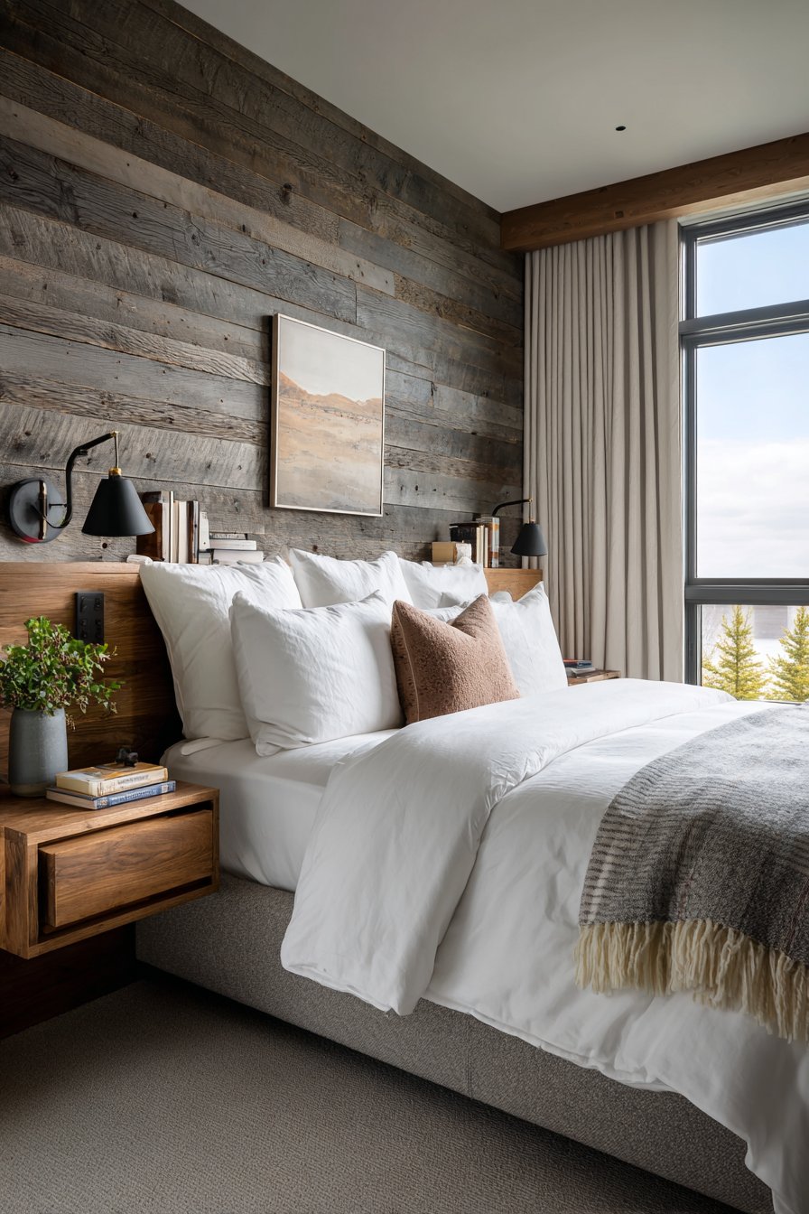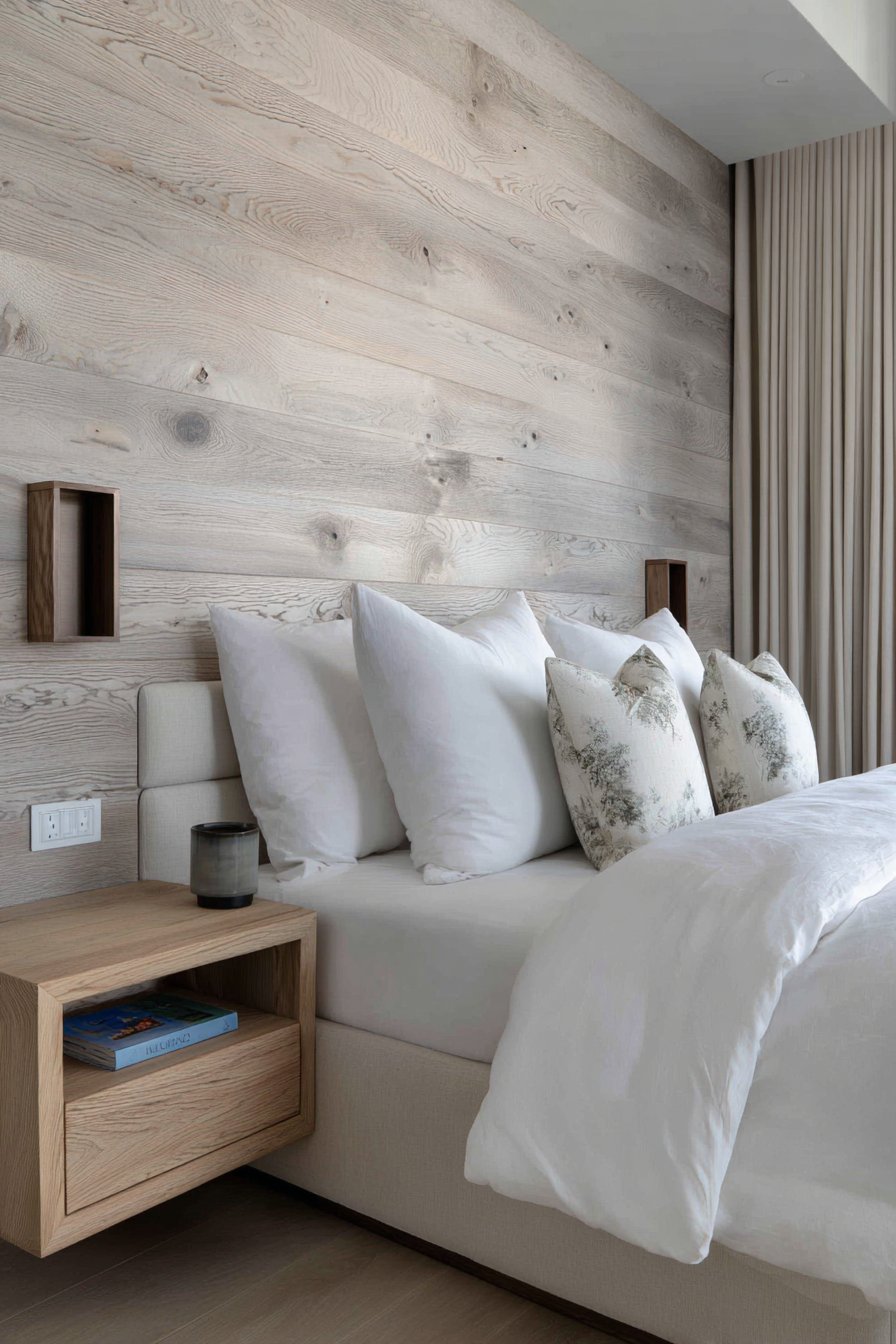 The planks feature authentic wood characteristics including subtle texture and natural knots that add genuine character impossible to replicate with printed or artificial materials. White bedding and natural linen curtains create serene contrast against the gray wood, their crisp freshness balancing the planked wall’s rustic character. Matching wood floating nightstands mount directly to the planked wall, demonstrating how wall treatments can integrate with furniture in seamless, space-efficient ways.