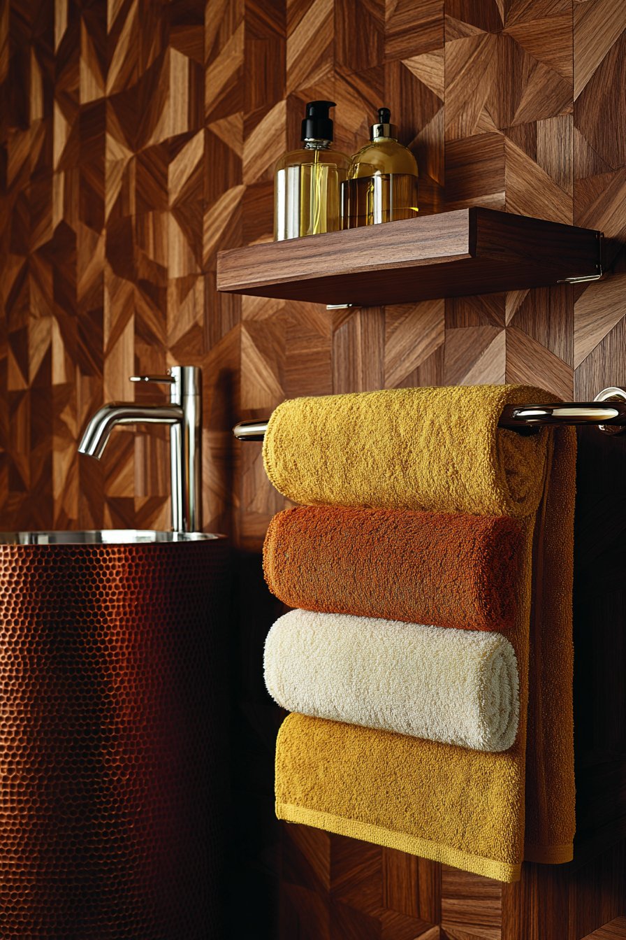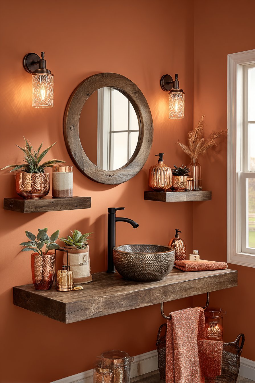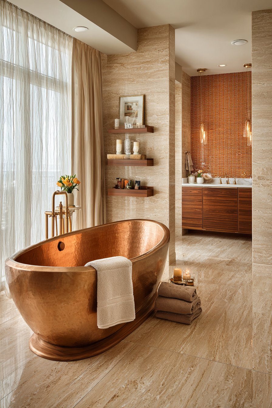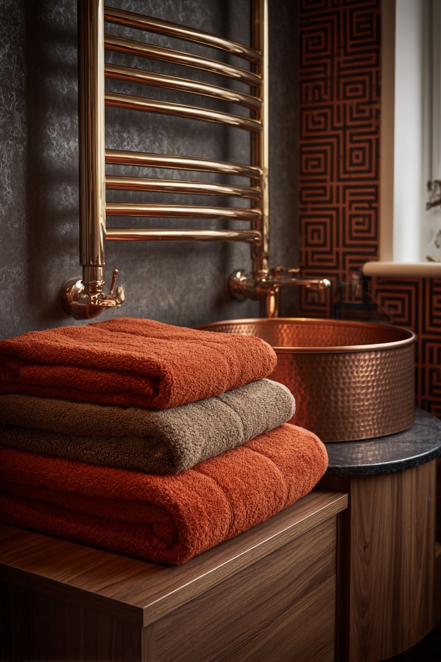 The circular vessel sink in hammered copper becomes a stunning focal point that draws the eye and provides a talking point without requiring much space. The hammered texture catches light beautifully, creating ever-changing patterns throughout the day as natural light moves through the room. Copper also possesses natural antimicrobial properties, making it an excellent choice for bathroom applications beyond its obvious aesthetic appeal. The heated towel rack in brushed gold holds plush towels in burnt orange and cream, adding both luxury and practicality to the small space.