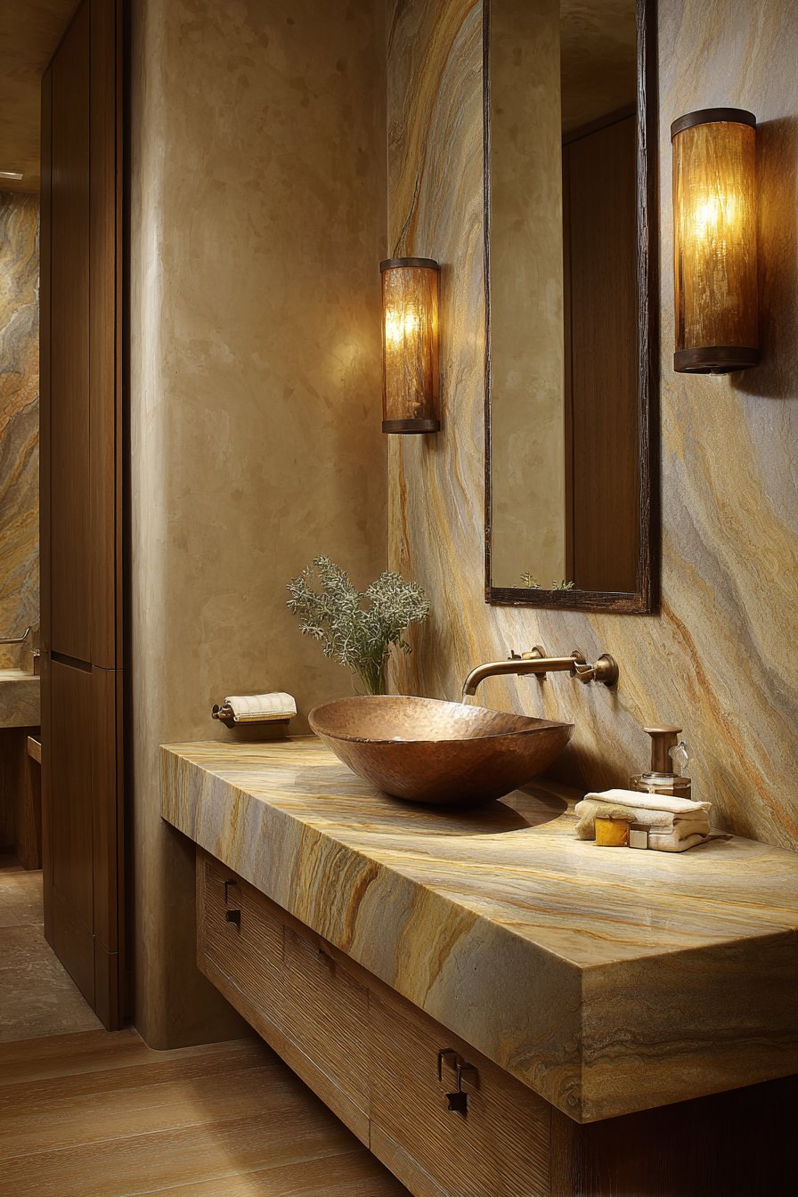 The textured beige walls create depth and dimension without overwhelming the senses, providing a neutral backdrop that allows the warmer elements to shine. This layering of warm tones—from the golden marble to the copper sink, from the oak vanity to the brass hardware—creates a cohesive palette that feels carefully curated yet effortlessly natural. The overall effect is one of understated luxury, where quality materials and thoughtful design combine to create a space that feels both special and livable.