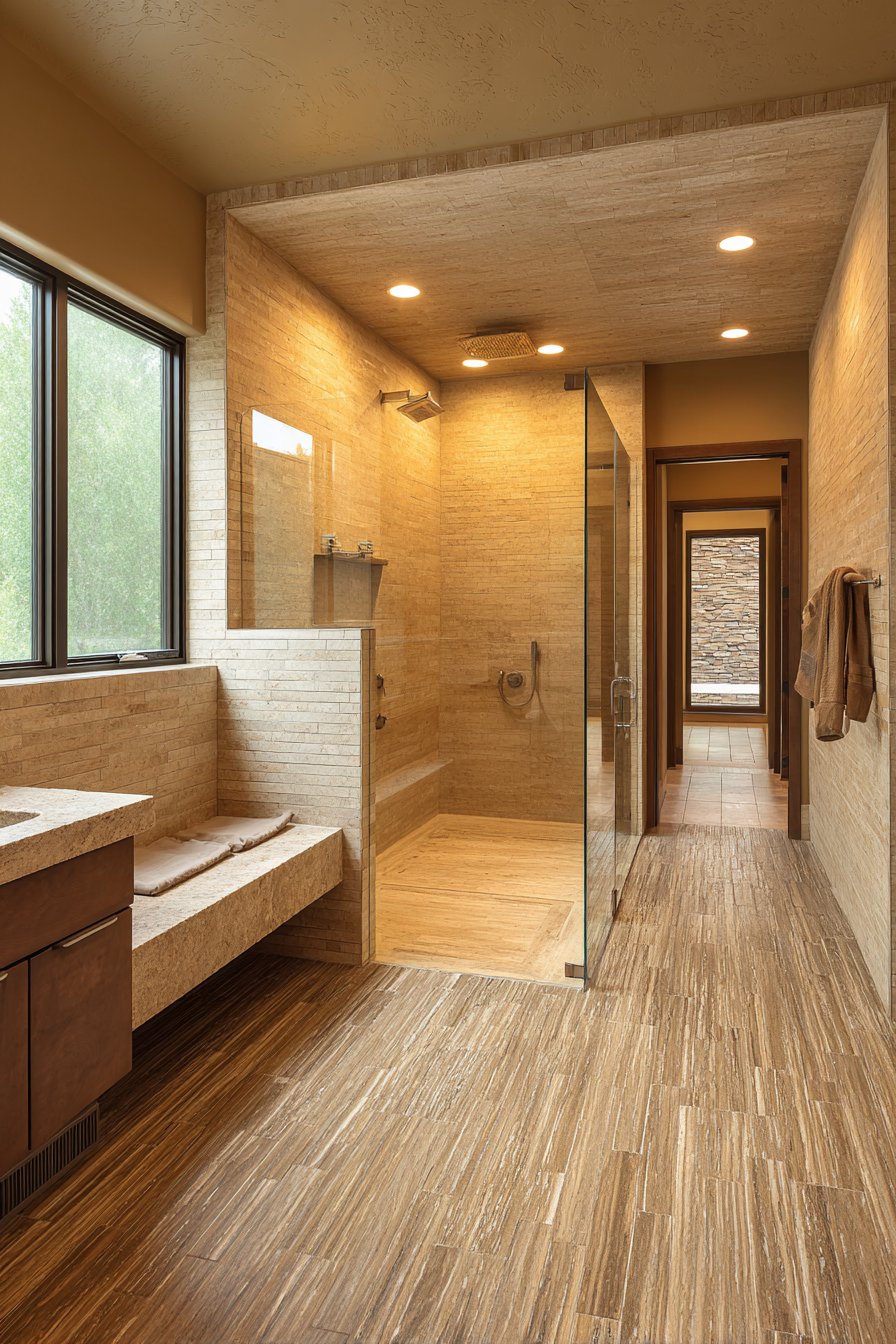 2. Earthy Travertine Shower Sanctuary with Heated Floors