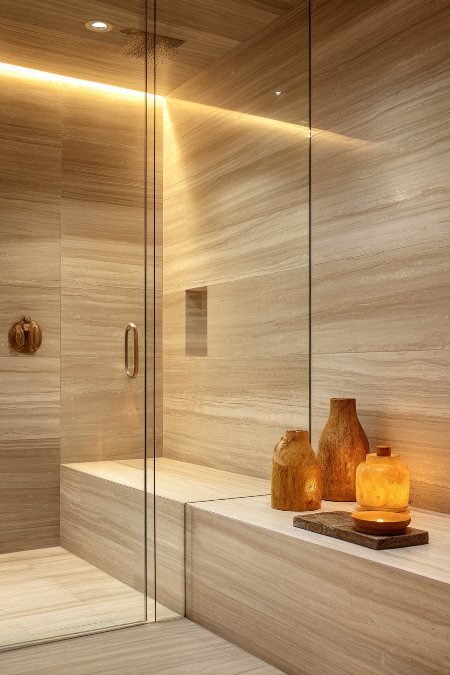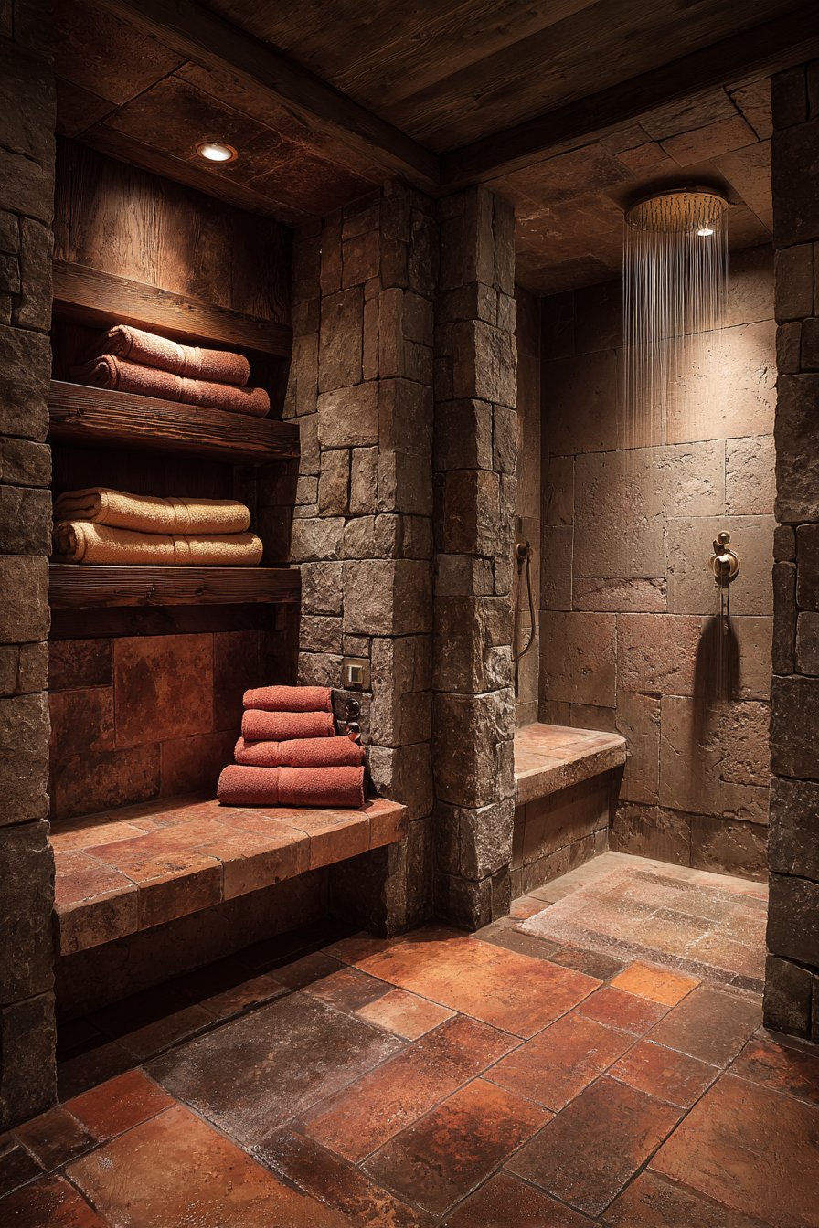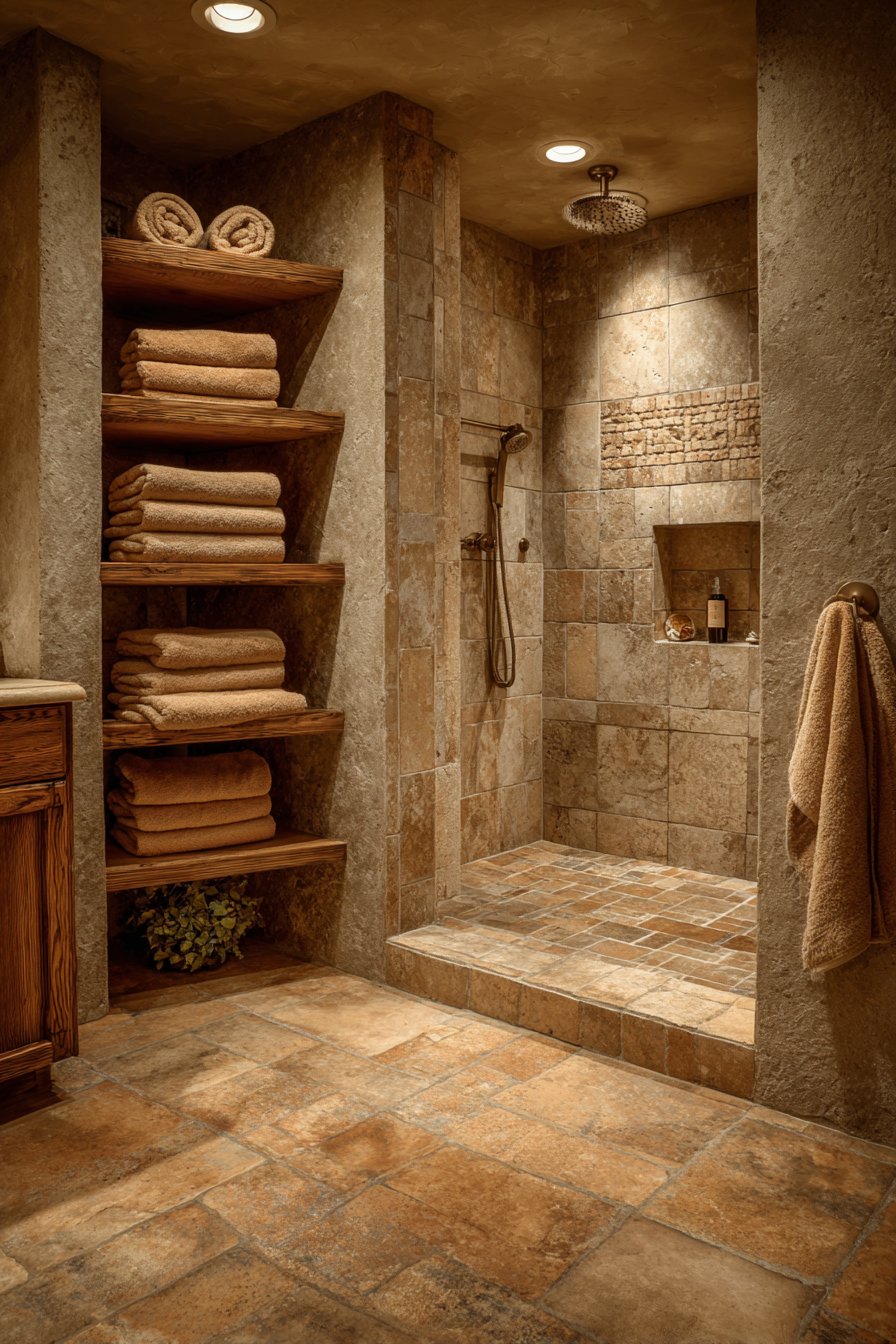 Recessed lighting with warm color temperature is crucial in this design, as it enhances the golden tones within the travertine and terra cotta while creating pools of light that feel intimate rather than clinical. The wooden accent shelving provides practical storage for rolled towels in cream and caramel tones, adding another organic element that softens the stone surfaces. These shelves also create opportunities for styling with natural accessories—perhaps a wooden bowl holding artisan soaps or a small potted plant that thrives in the humid environment.