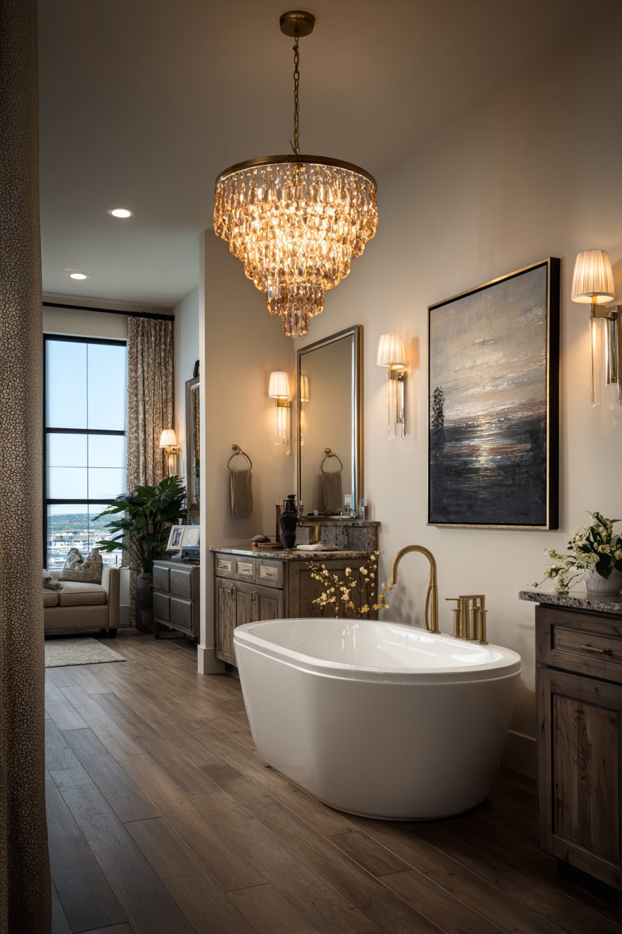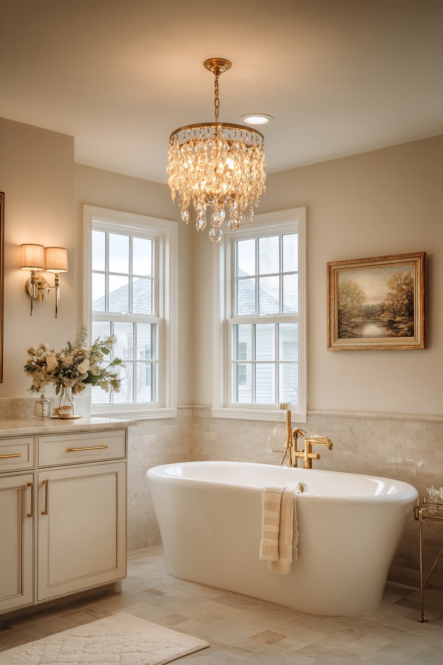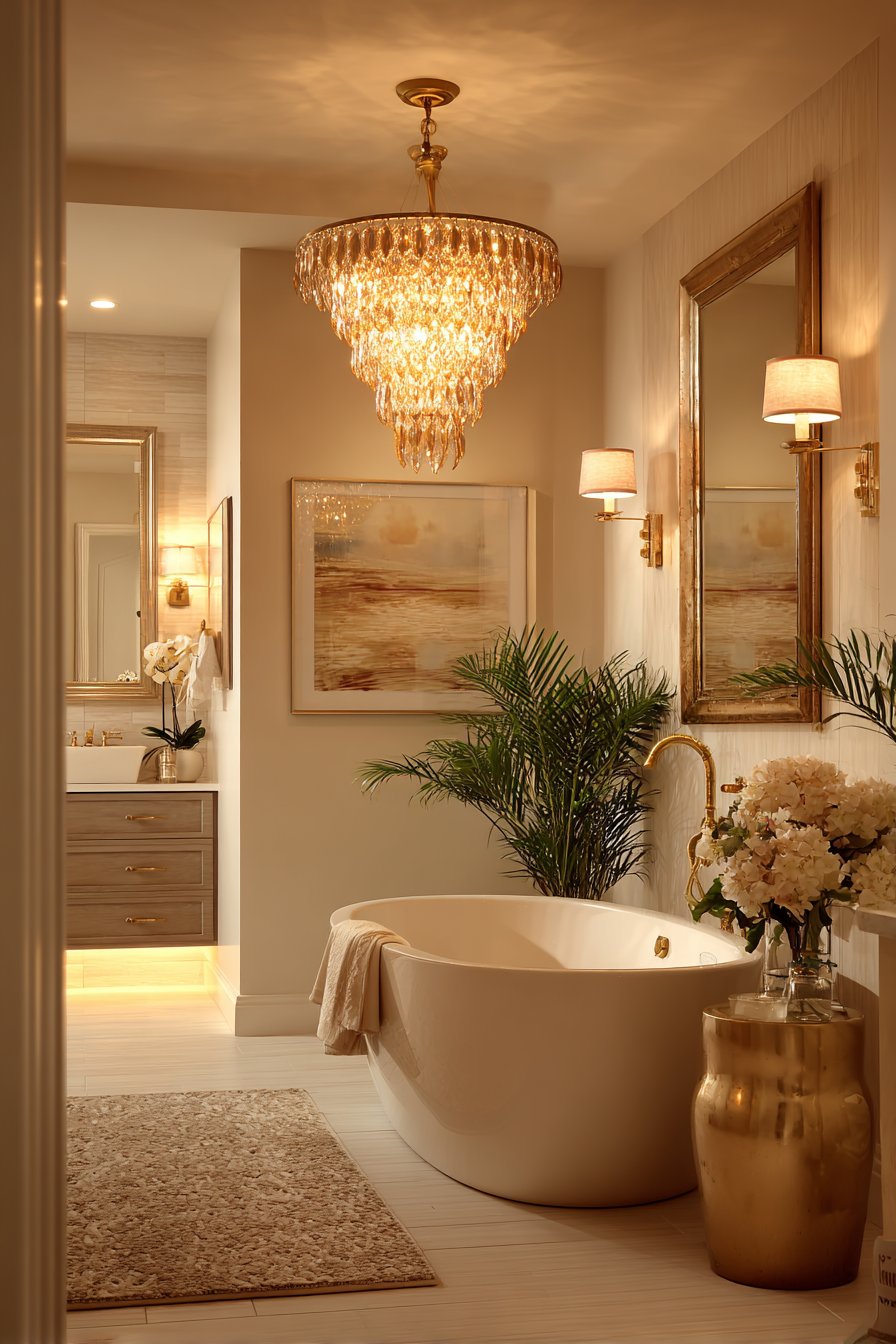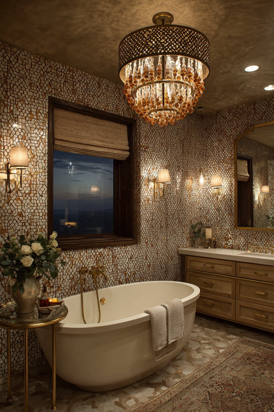Lighting makes or breaks bathroom design, and this scheme demonstrates how multiple light sources at different levels can create a truly luxurious atmosphere. The statement chandelier with amber crystal droplets and brass frame above the freestanding tub serves as jewelry for the room, its ornate beauty creating a focal point that elevates the space from purely functional to genuinely special. The amber crystals filter and warm the light, casting golden reflections throughout the space that dance and shimmer when the crystals catch air currents.