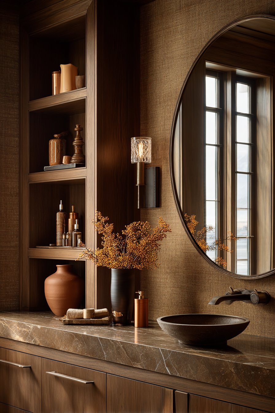 Small bathrooms present unique challenges, but this design proves that compact spaces can be just as warm and luxurious as larger rooms through careful material selection and strategic design choices. The wall-mounted vanity in warm walnut veneer provides essential storage without making the room feel cramped, as the floating design allows floor space to remain visible, creating an illusion of greater square footage. The rich, chocolatey tones of walnut bring immediate warmth and sophistication to even the most modest powder room.