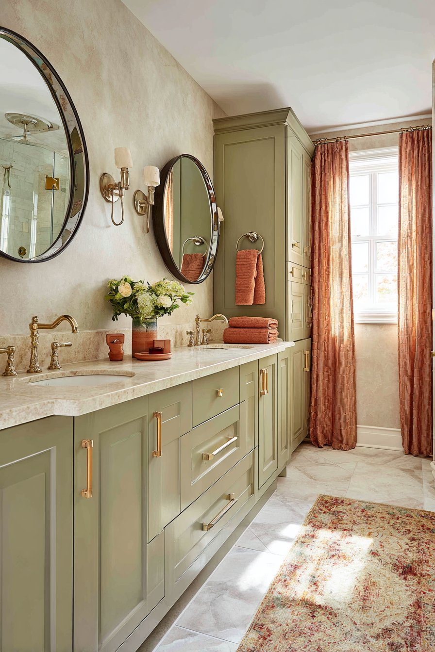 The walls painted in soft apricot create an enveloping warmth that feels like a gentle embrace, particularly during evening baths when the setting sun or candlelight enhances the peachy glow. This bold yet soft color choice demonstrates that warm bathrooms need not be limited to safe beiges and whites—carefully chosen colors can dramatically increase the sense of coziness while still feeling sophisticated and intentional. The key is selecting colors with warm undertones that have been slightly grayed or softened to avoid appearing juvenile or overwhelming.