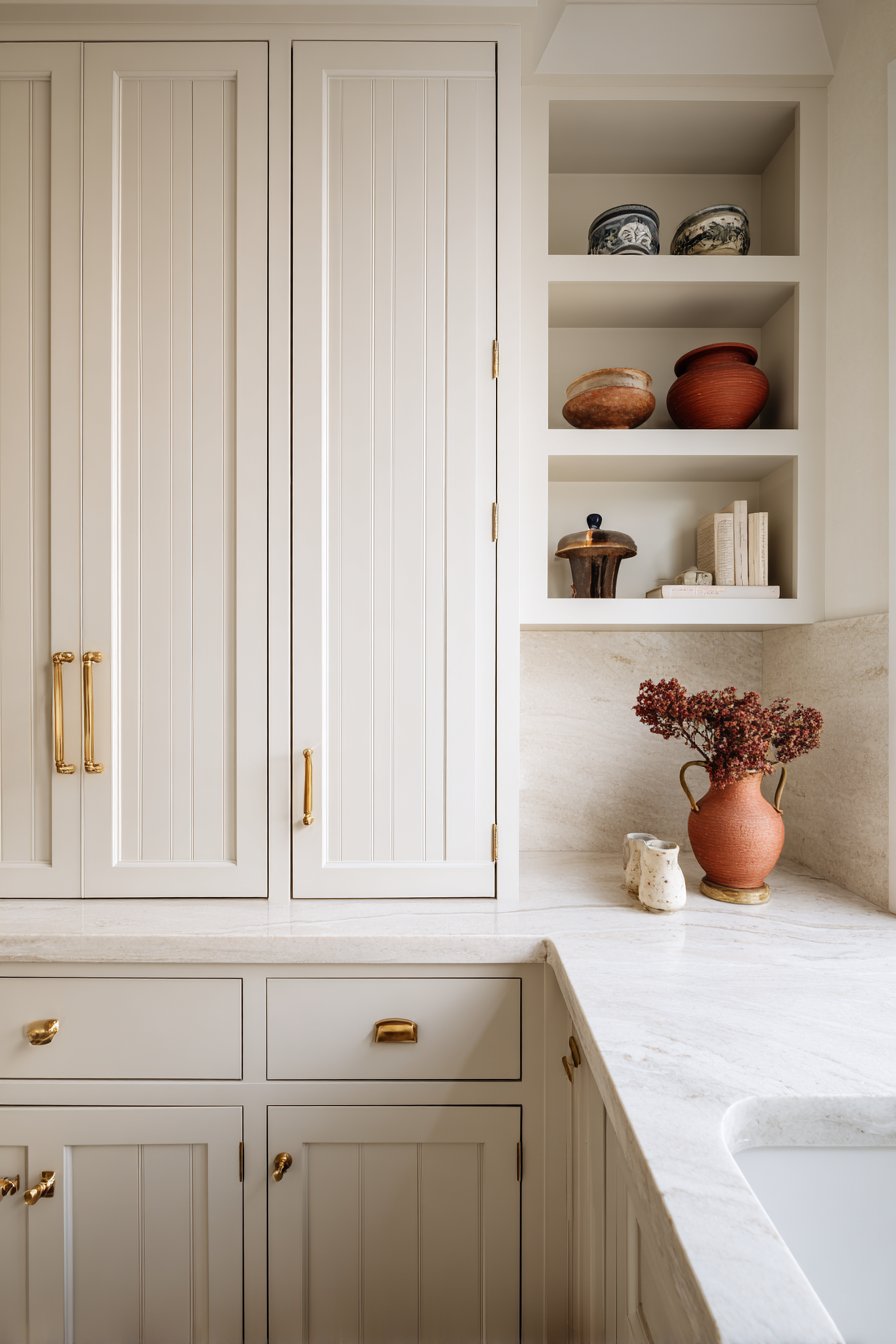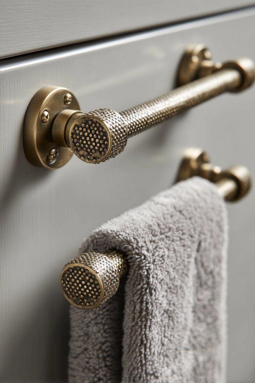 These carefully chosen elements pop beautifully against warm white shaker-style cabinetry and soft grey-beige walls, creating just enough contrast to be interesting without feeling stark or jarring. The shaker style, with its clean lines and simple recessed panels, provides a timeless backdrop that allows the beautiful hardware to shine without competing for attention. The antique finish is particularly practical in bathrooms, as it shows fewer fingerprints and water spots than polished brass while offering more character than standard brushed finishes.