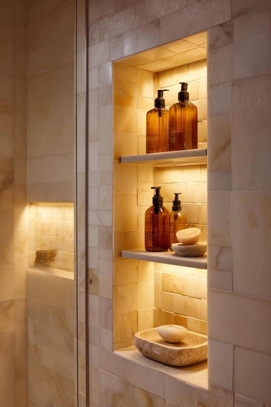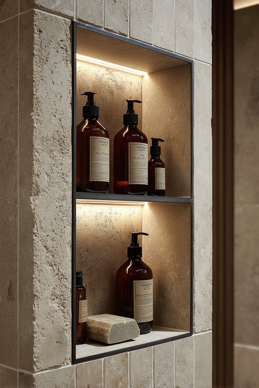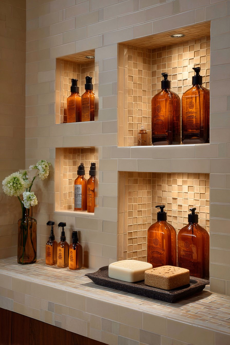 - Use matching grout color for niche and surrounding tiles for a seamless, built-in appearance