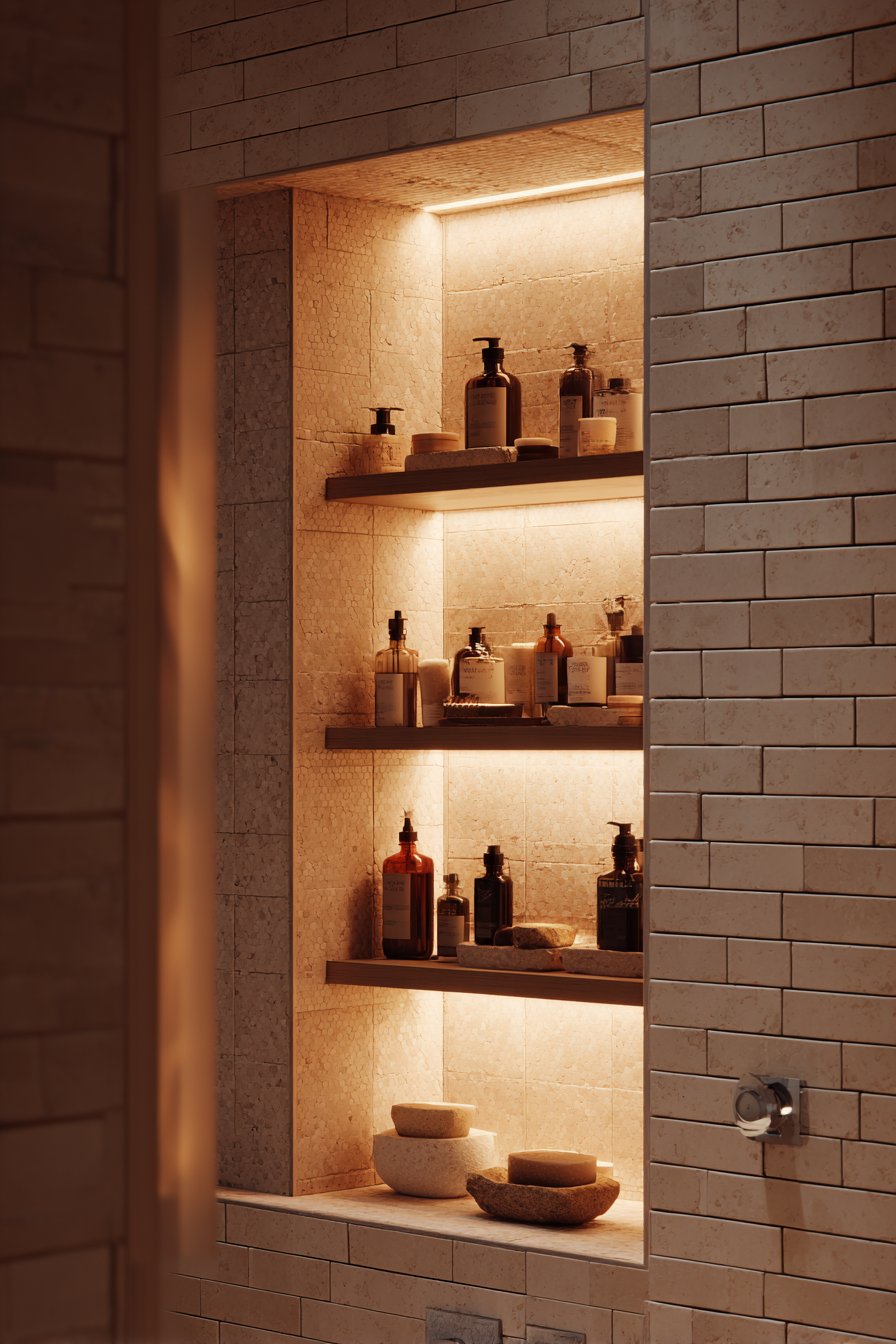 - Use LED strip lighting under floating vanities or in niches to add dimensional light