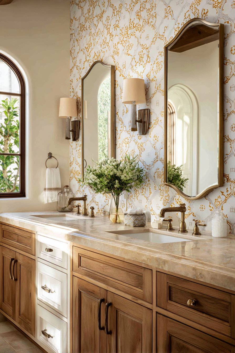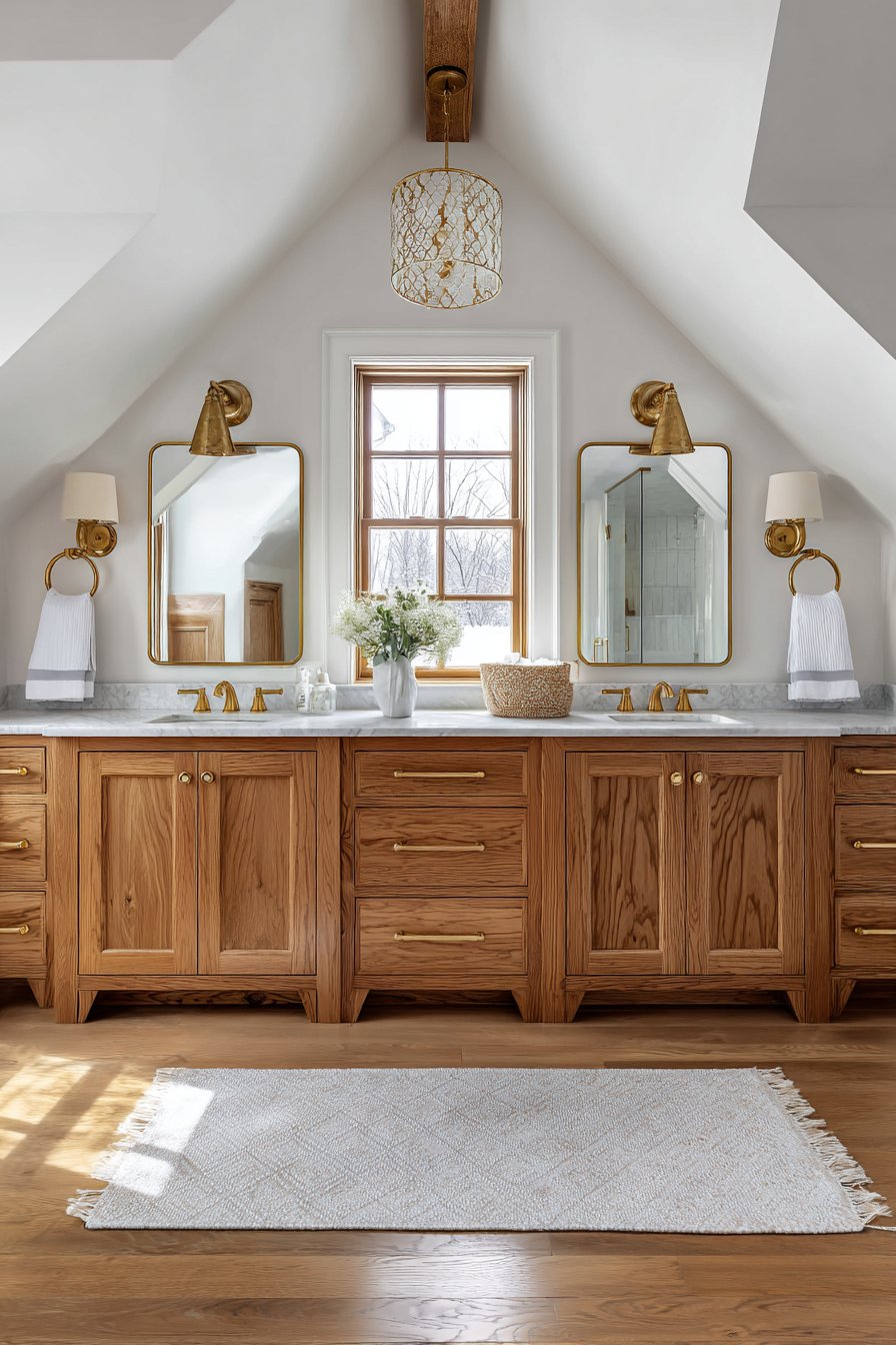 Twin mirrors with individual sconce lighting in aged brass frame each sink area, providing personalized lighting while maintaining symmetry and balance. This dual-mirror approach is often superior to a single large mirror because it allows each person to adjust their own lighting without affecting the other, and the aged brass finish adds warmth and character that new brass lacks. The shared storage base features thoughtful two-tone design combining warm oak upper drawers with cream lower cabinets, creating visual interest while maximizing storage through the varying drawer and cabinet configurations.