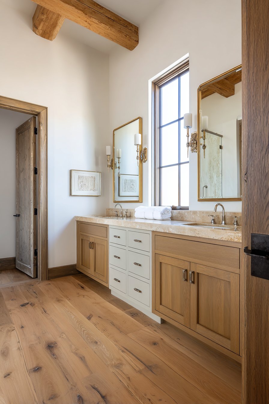 The symmetrical layout bathed in natural morning light creates a sense of order and calm that’s essential for shared spaces, where two people’s different routines and needs must coexist peacefully. The warm materials and colors ensure the space feels inviting rather than institutional despite its larger scale, with the golden light streaming through windows picking up the warm tones in the quartzite and oak, making the entire vanity area glow with welcoming warmth during those critical morning hours.