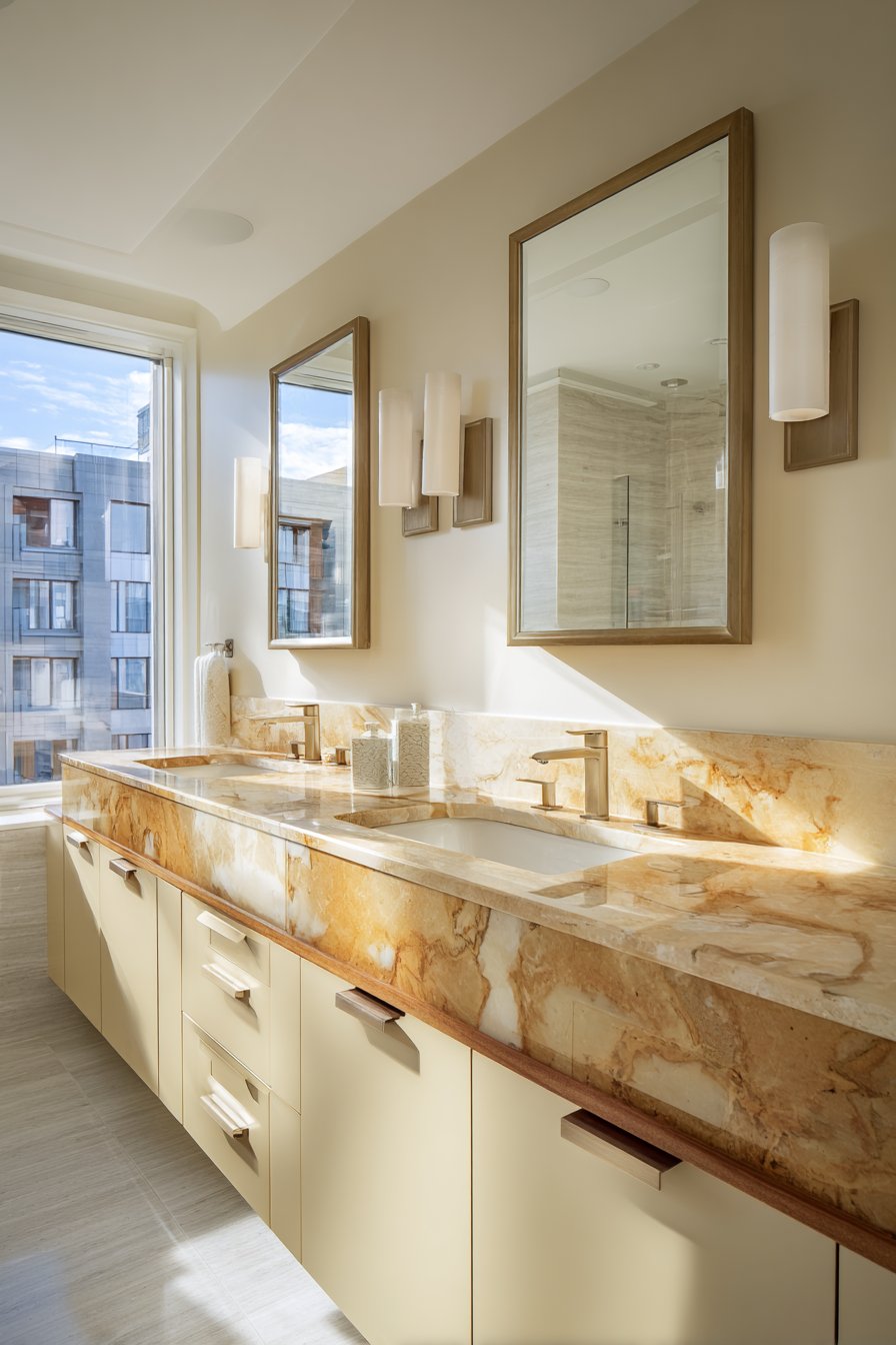 Shared bathrooms require design solutions that accommodate two users while maintaining aesthetic cohesion, and this double vanity setup masterfully balances individual needs with unified design. The continuous warm quartzite countertop with golden movement spans the length of the vanity, providing each user with ample space while the uninterrupted surface creates visual flow and luxury. The two undermount sinks—positioned with adequate space between them—offer independence and reduce morning traffic jams, making shared routines more harmonious.