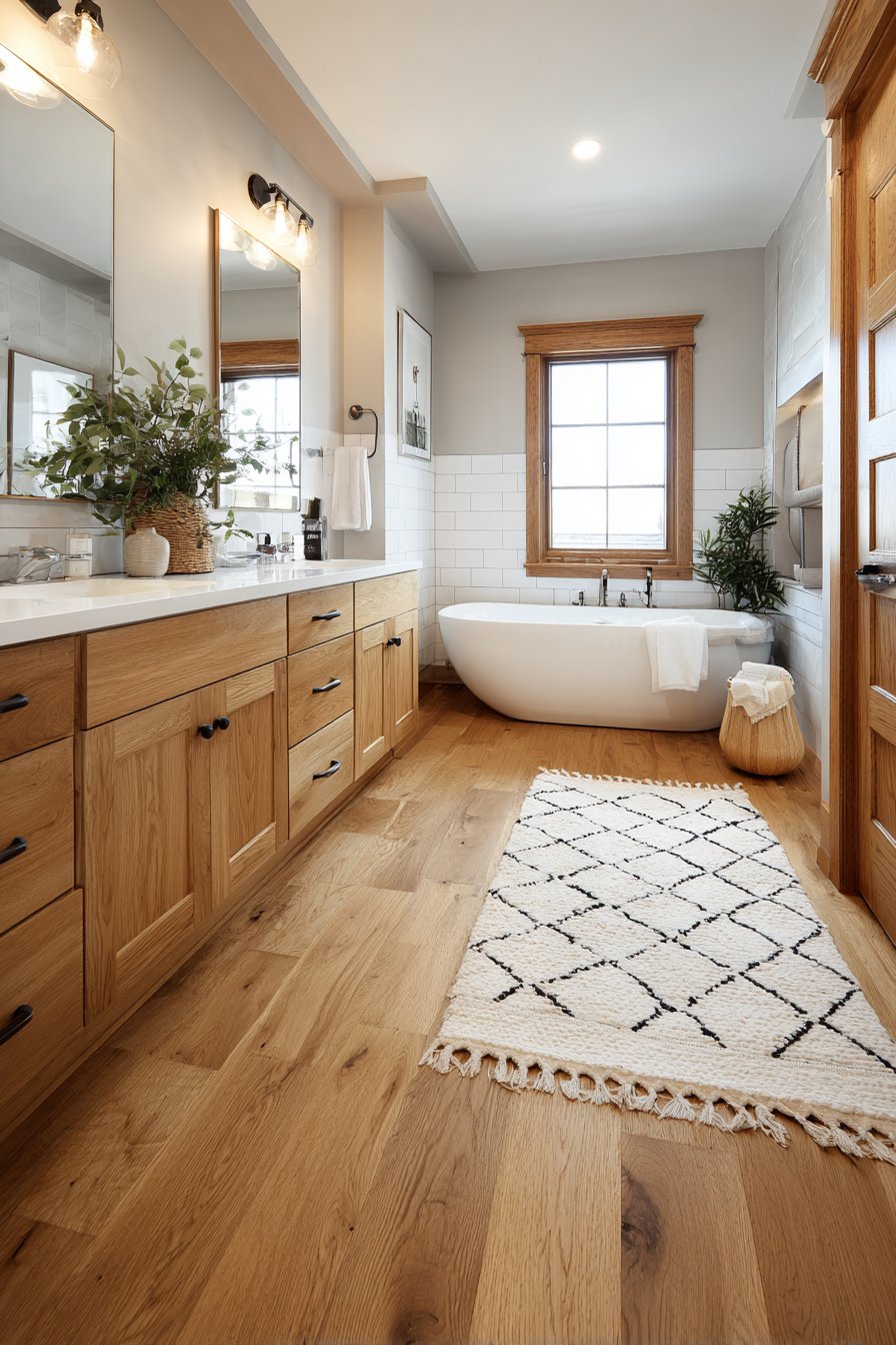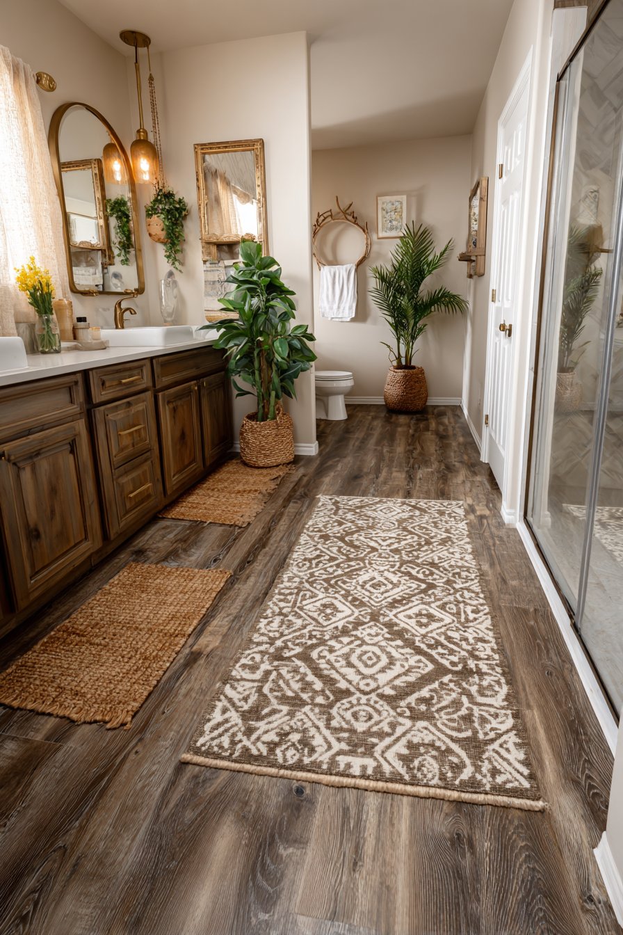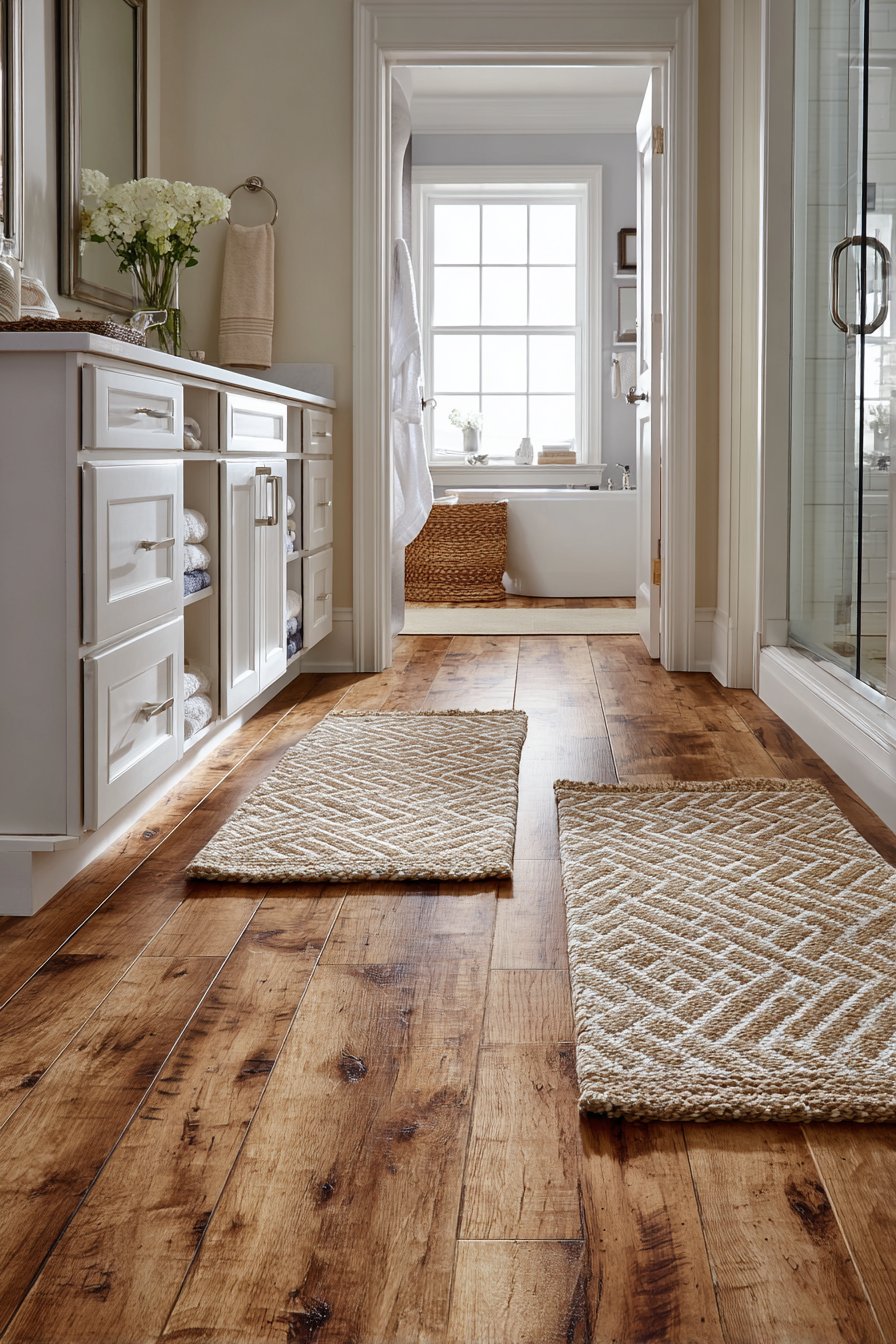 The flooring extends seamlessly from the main bathroom into the water closet area, creating visual continuity that makes both spaces feel more expansive than they would with different flooring materials. This continuous flow is particularly important in bathrooms where different flooring materials can make the space feel choppy and disconnected. Area rugs in natural jute with warm geometric patterns add comfort at key locations—beside the tub, in front of the shower, at the vanity—while their natural fiber and neutral pattern complement rather than compete with the flooring.