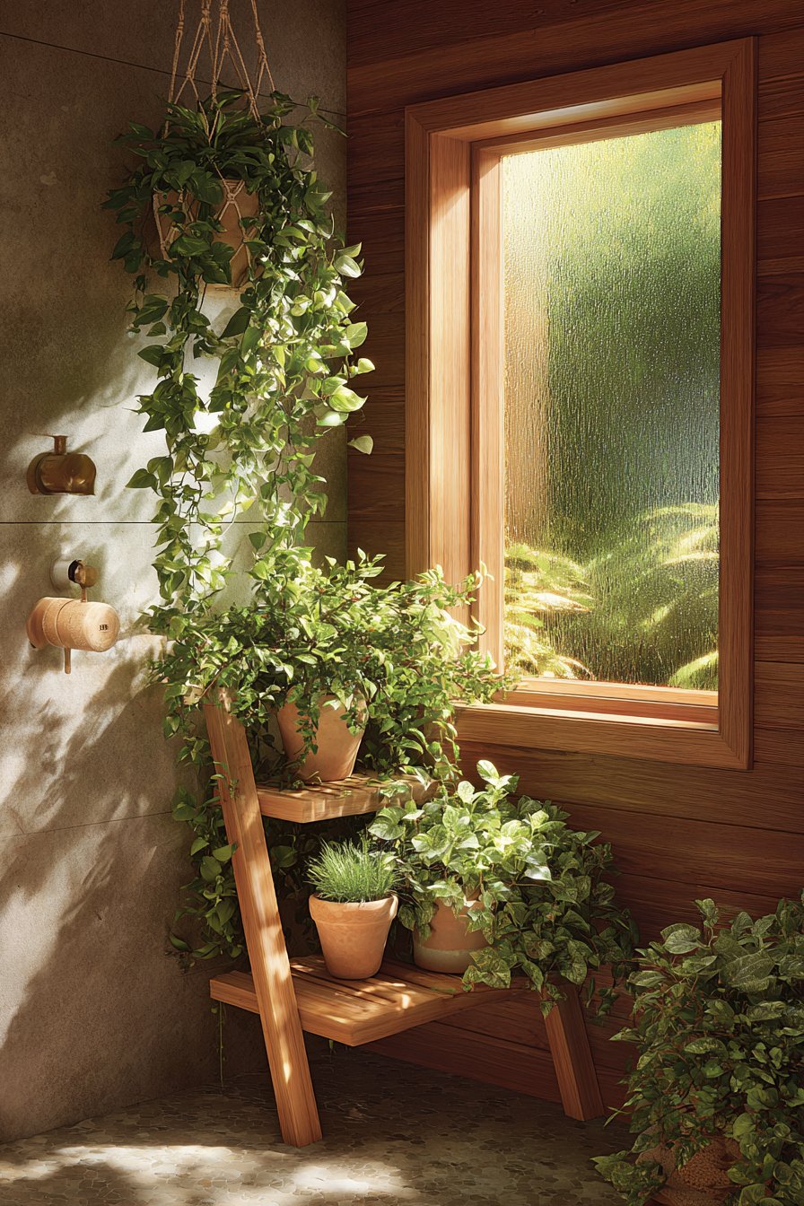 Plants and bathrooms form a natural partnership, with the humidity from showers and baths creating ideal conditions for many tropical and humidity-loving species. This plant corner design creates a mini greenhouse effect, with a collection of carefully chosen plants on a tiered bamboo stand near a frosted window where they receive adequate light while maintaining bathroom privacy. The bamboo stand itself contributes to the warm aesthetic with its natural honey tones and organic material, while its tiered design allows for multiple plants at different heights.