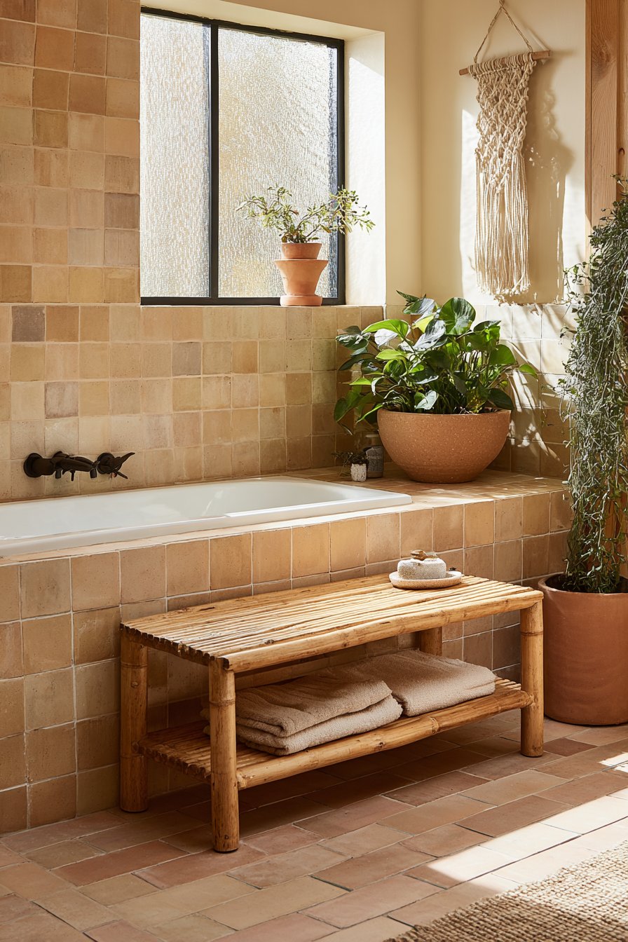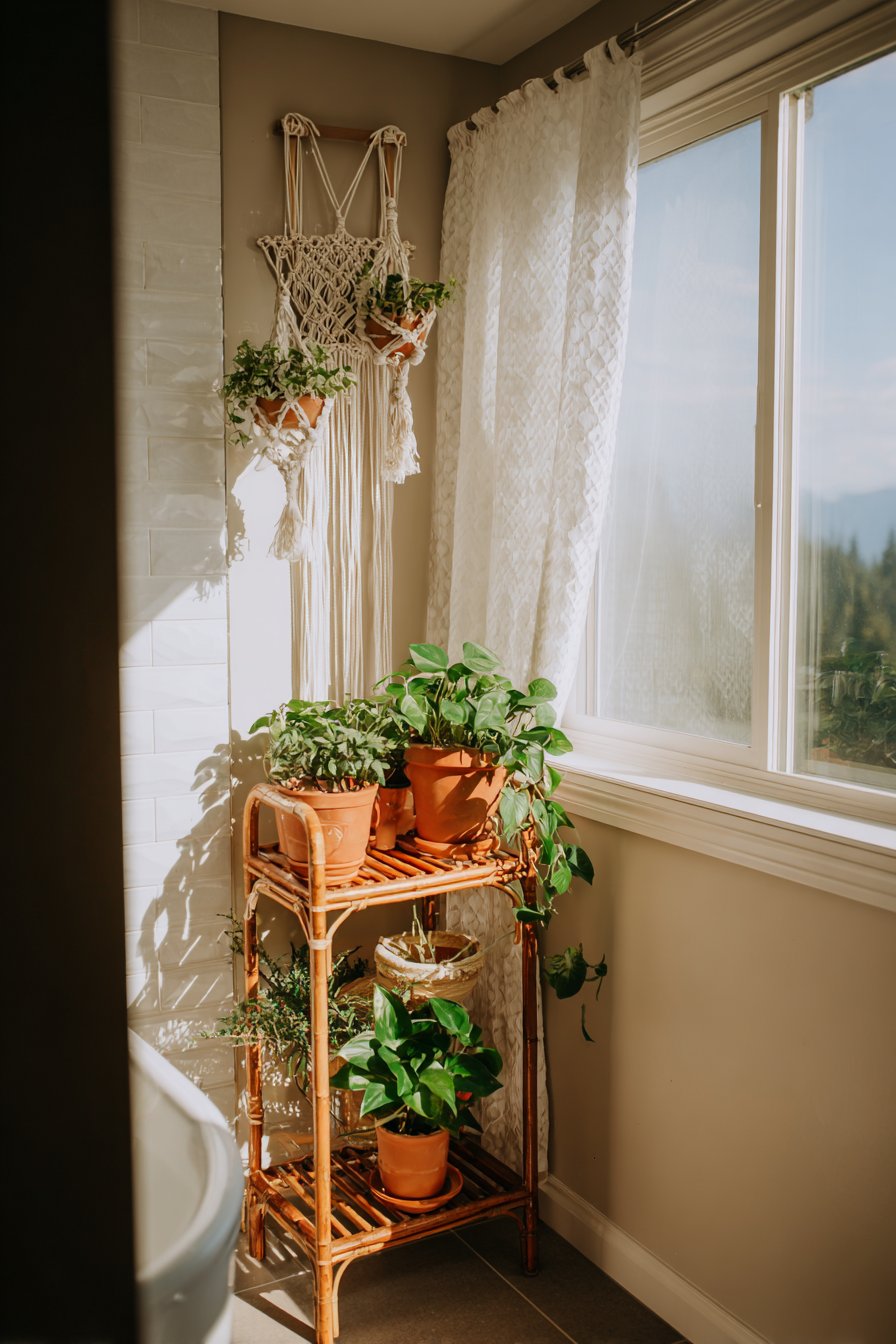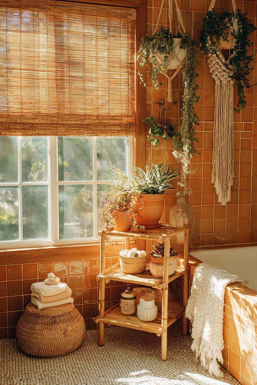 Macramé hangers in natural cotton suspend trailing pothos from ceiling hooks, their cascading vines adding vertical interest and movement to the space while their heart-shaped leaves bring organic curves that soften the bathroom’s angular architecture. Terra cotta pots in various warm clay tones complement the botanical display while providing the breathability that many plants prefer, allowing excess moisture to evaporate through the pot walls. The unglazed terra cotta ages beautifully, developing white mineral deposits and patina that add to the organic, collected feel.