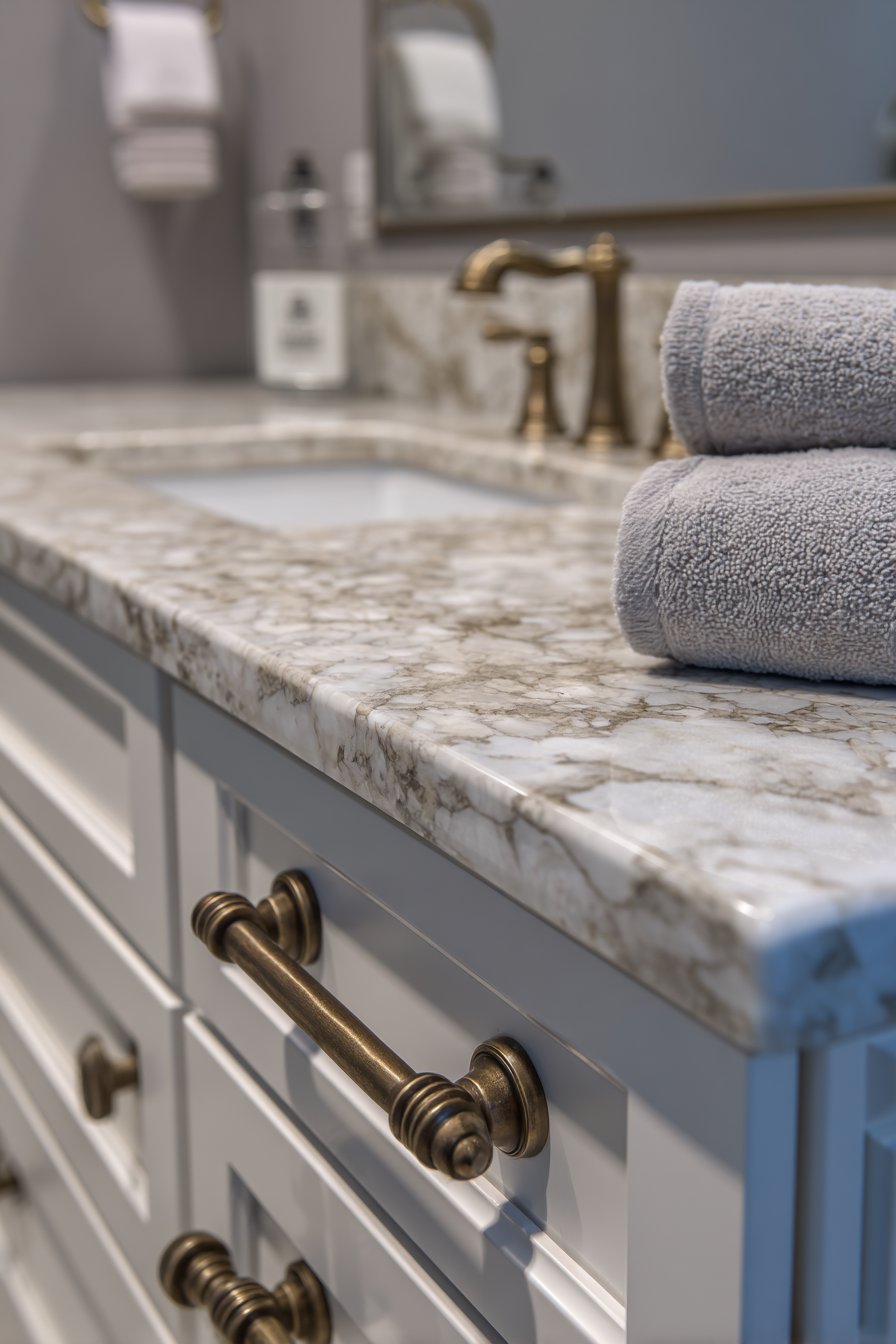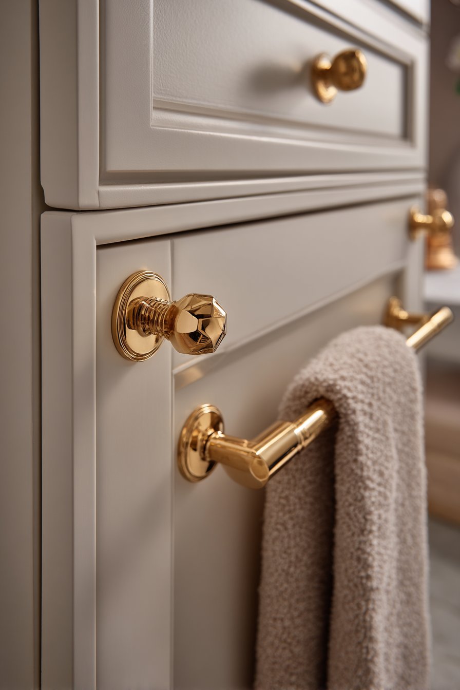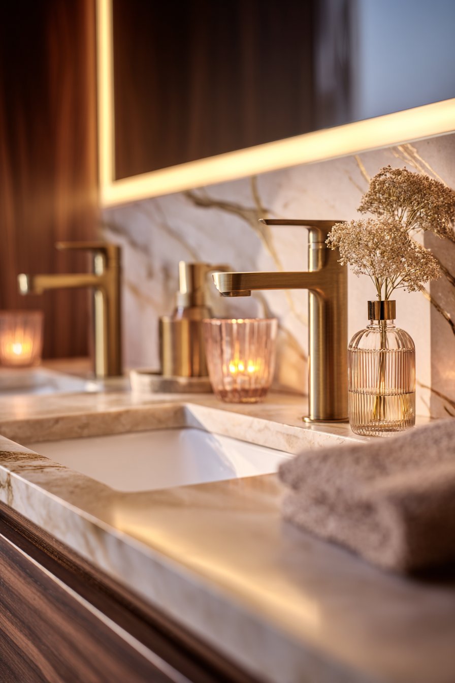 The detail-focused interior photography captures how this cohesive design through consistent warm metallic accents elevates the entire bathroom aesthetic from acceptable to exceptional. When every piece of hardware is carefully selected and coordinated, the bathroom feels custom-designed rather than simply assembled from random parts. This attention to detail demonstrates respect for the space and creates an environment where even the smallest interactions—opening a drawer, hanging a towel—become subtly more pleasant.