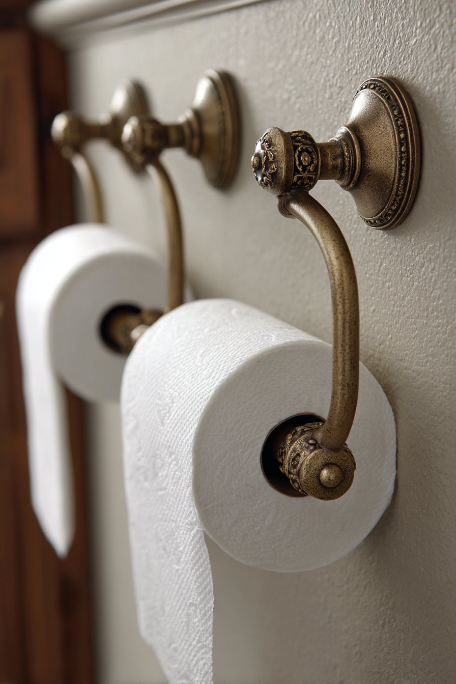 While hardware might seem like a minor detail, this design proves that consistent, high-quality hardware selections significantly impact the overall cohesion and sophistication of bathroom design. The antique brass finish with slight patina appears on every metallic element throughout the space—cabinet pulls, towel bars, toilet paper holder, robe hooks—creating a unified design language that feels intentional and curated. The warmth of the brass brings golden tones that enhance all the other warm elements in the room.