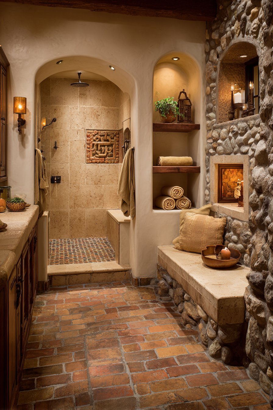 The foundation of warmth begins quite literally from the ground up with heated terra cotta floor tiles that provide both physical and visual comfort. These rustic-finished tiles bring an earthy, Mediterranean quality to the space, their warm clay tones evoking sun-baked landscapes and ancient architecture. The radiant heating system beneath ensures that stepping out of the shower is never an unpleasant shock, maintaining that cocoon of warmth that defines the best bathroom experiences.