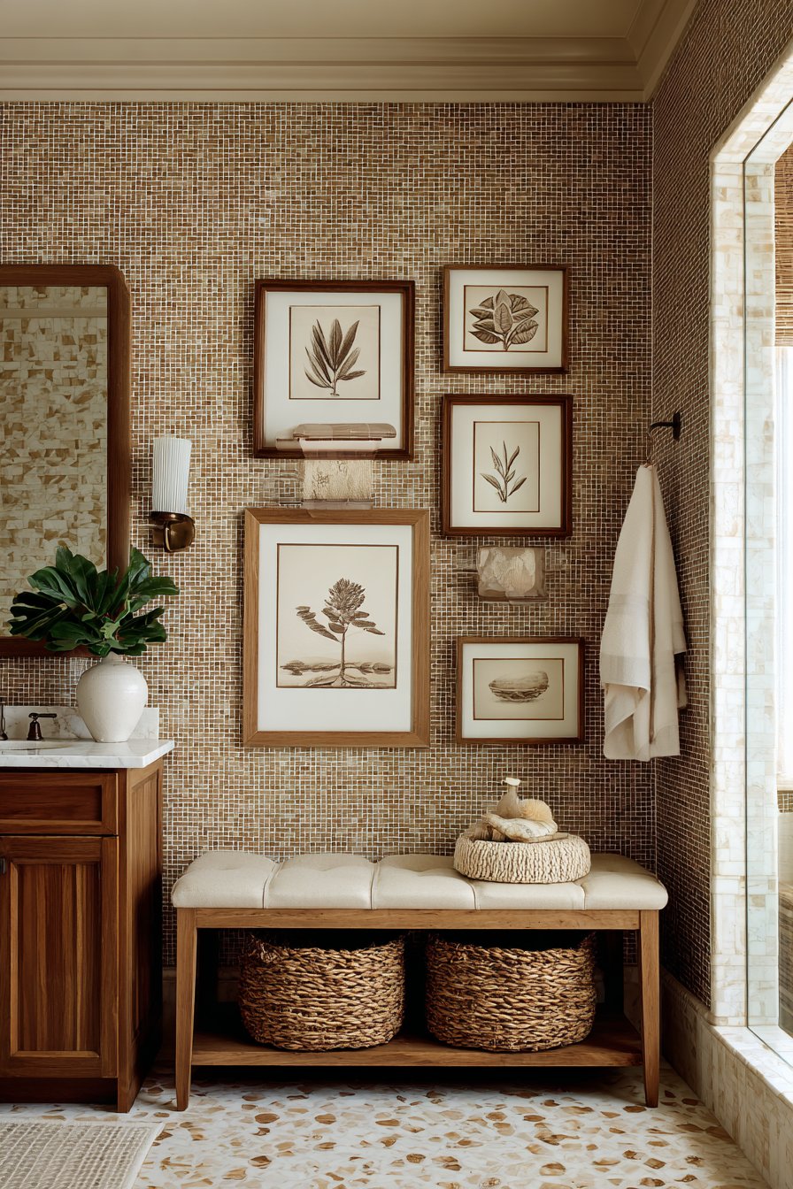 Artwork in bathrooms is often overlooked or relegated to generic prints, but this design demonstrates how a carefully curated gallery wall can bring personality and warmth while transforming the bathroom into a true extension of the home’s overall design narrative. The collection of botanical prints in warm sepia tones within natural wood frames of varying sizes creates visual interest through both the subject matter and the varied frame arrangements. The botanical subjects connect to the natural, organic theme that underlies so much warm design.