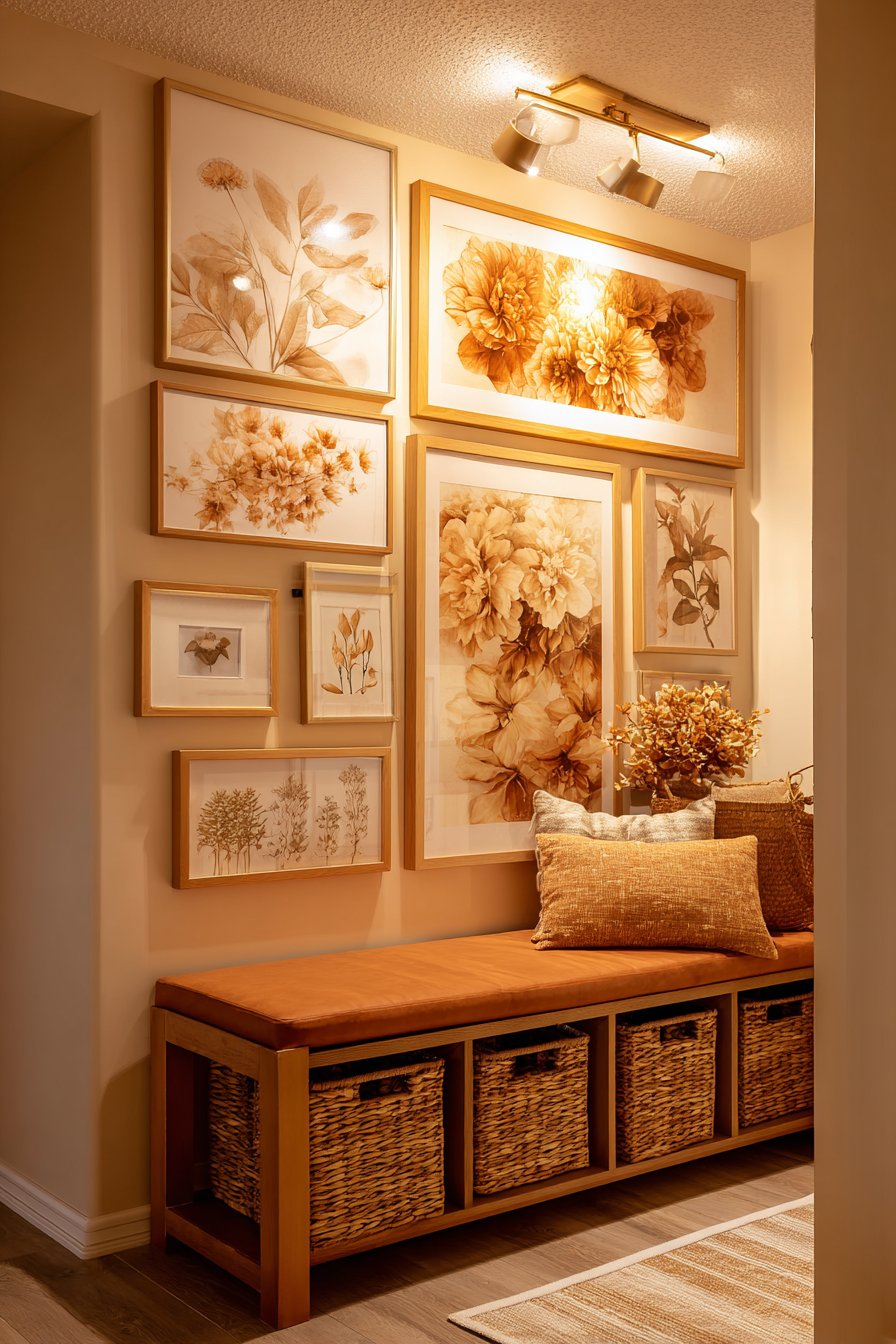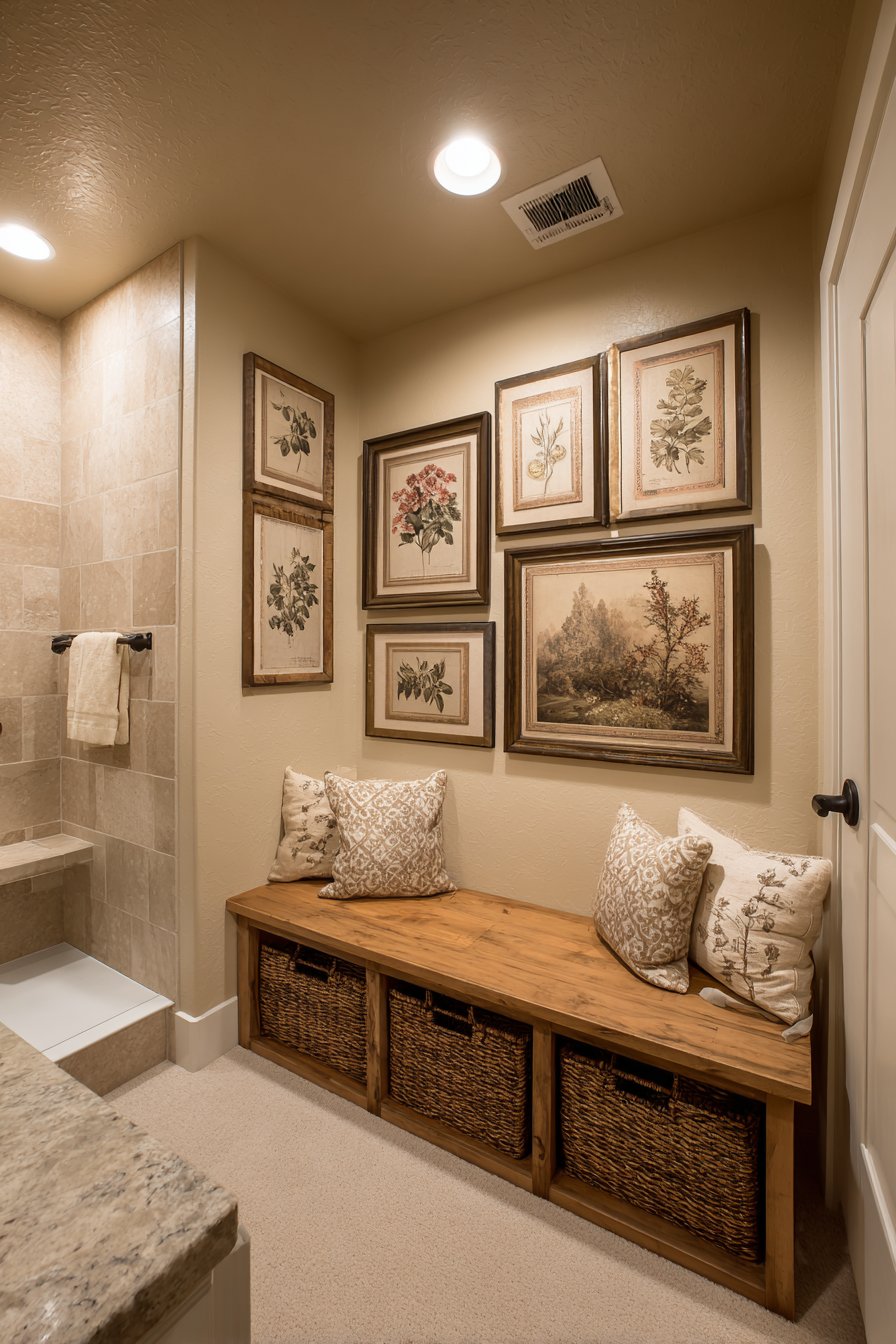 Warm overhead lighting positioned to highlight the curated display without creating glare on the glass-covered prints makes the gallery wall a true focal point worthy of attention. This type of lighting requires careful planning—angle the fixtures to illuminate the artwork rather than creating hot spots or reflections. The result shows how personal touches and warm art selections transform a bathroom from a purely utilitarian space into an extension of the home’s overall warm, inviting design narrative where your personality and interests are expressed in every room.