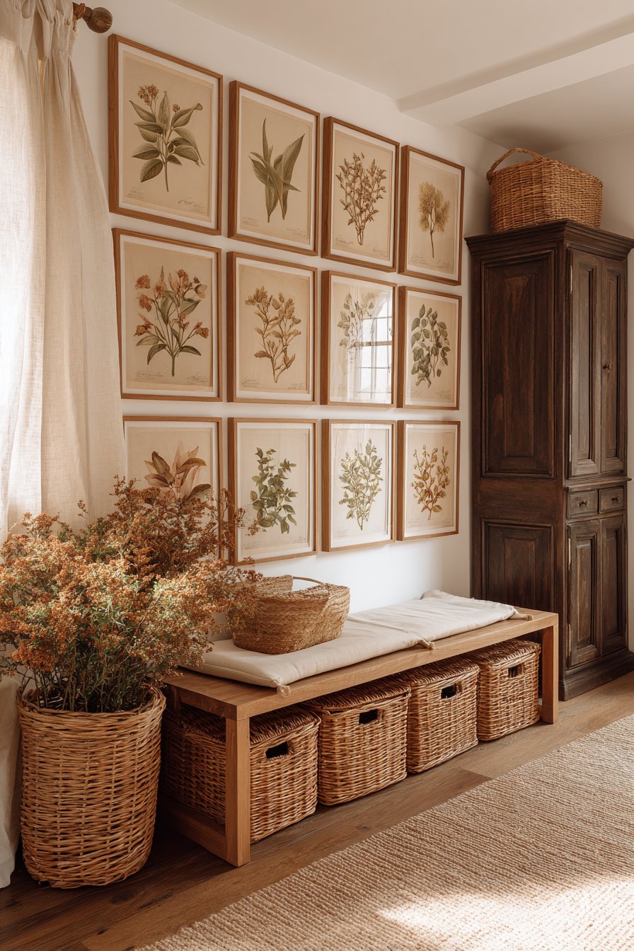 The gallery wall hangs above a low storage bench in warm teak with woven basket storage underneath, creating a functional yet beautiful vignette that serves multiple purposes. The bench provides seating for putting on shoes or a place to set items while preparing for the day, while the baskets offer attractive storage for extra towels, toilet paper, or personal items. The warm teak brings another layer of natural wood tone that harmonizes with the picture frames and contributes to the overall warmth.
