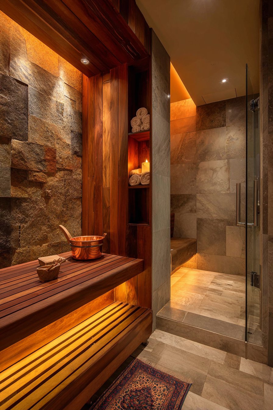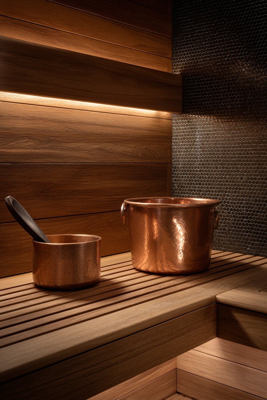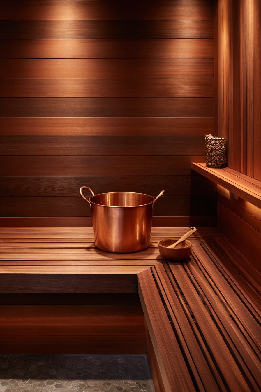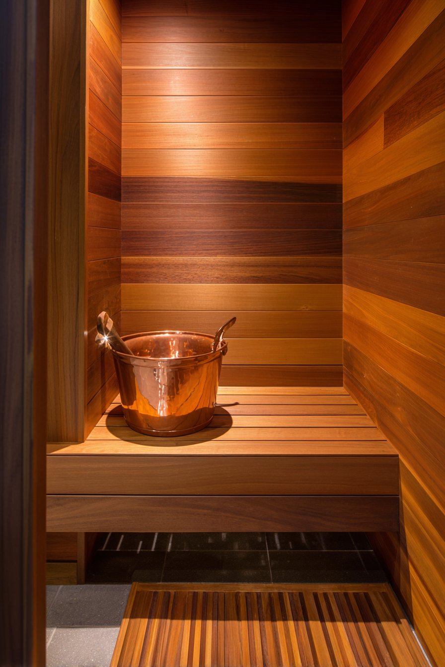 The walls in this section use warm cedar planking that releases aromatic warmth when heated, creating an immersive sensory experience that engages smell as well as touch and sight. The natural insulation properties of wood make it comfortable to sit on even in high heat, unlike tile or stone which would become uncomfortably hot. A copper bucket and ladle sit ready for traditional sauna use, where water splashed on hot stones creates the steam that defines the sauna experience, while their warm metallic beauty makes them beautiful objects even when not in use.