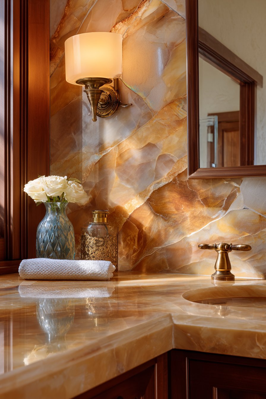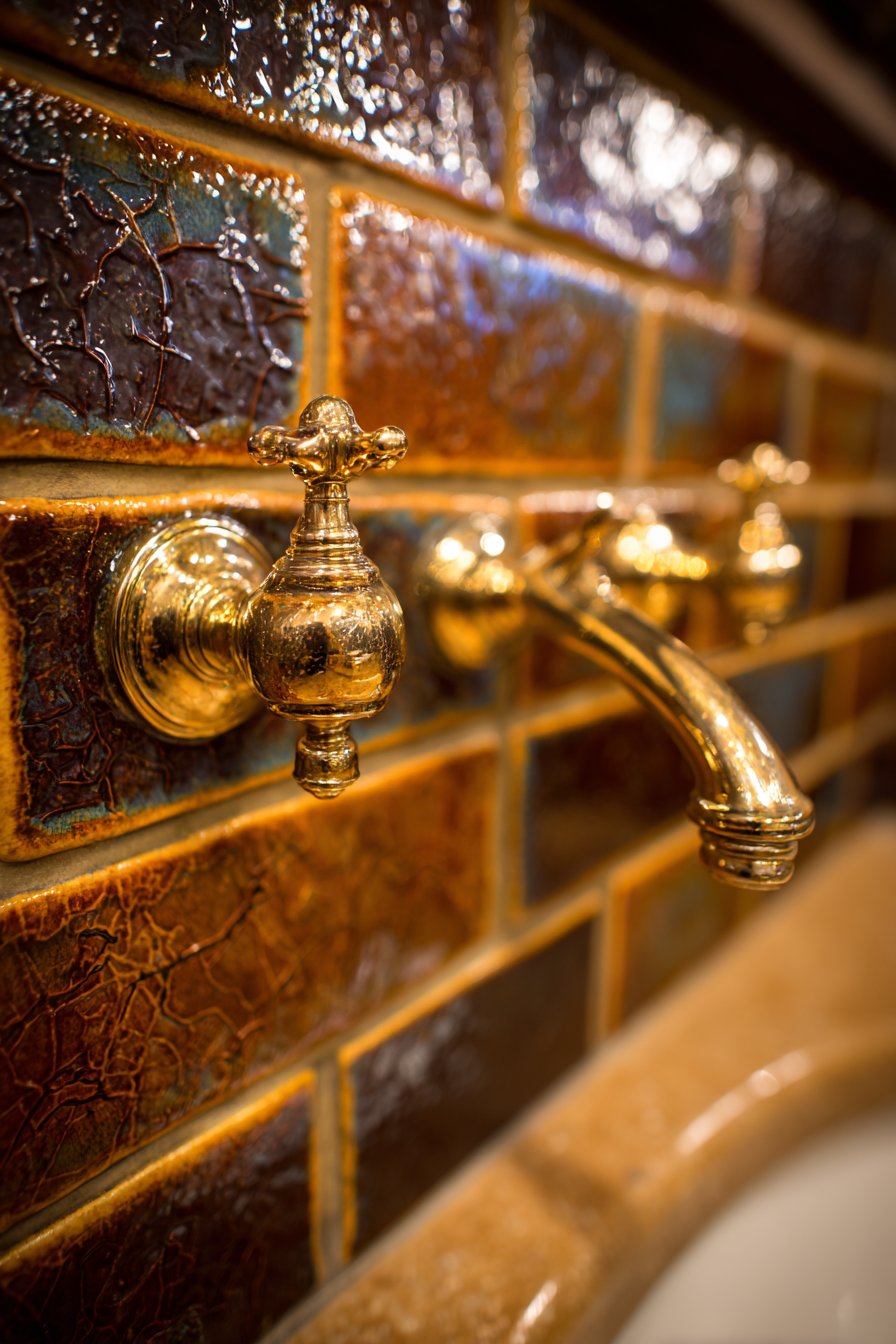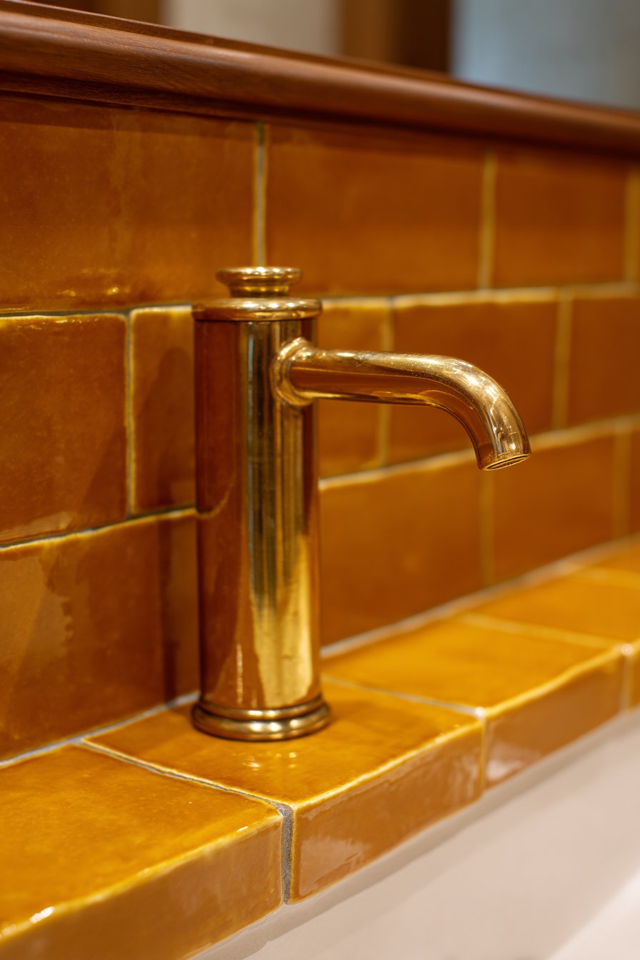 The backsplash extends to ceiling height behind the vanity, creating a warm focal wall that becomes the bathroom’s primary design statement. This bold choice of taking the tile all the way up transforms what could be a small accent into an immersive feature that wraps you in warmth and artistic beauty. The gold-finished faucet and accessories complement the golden undertones in the tile glaze, creating a cohesive metallic story that ties the entire vanity area together.