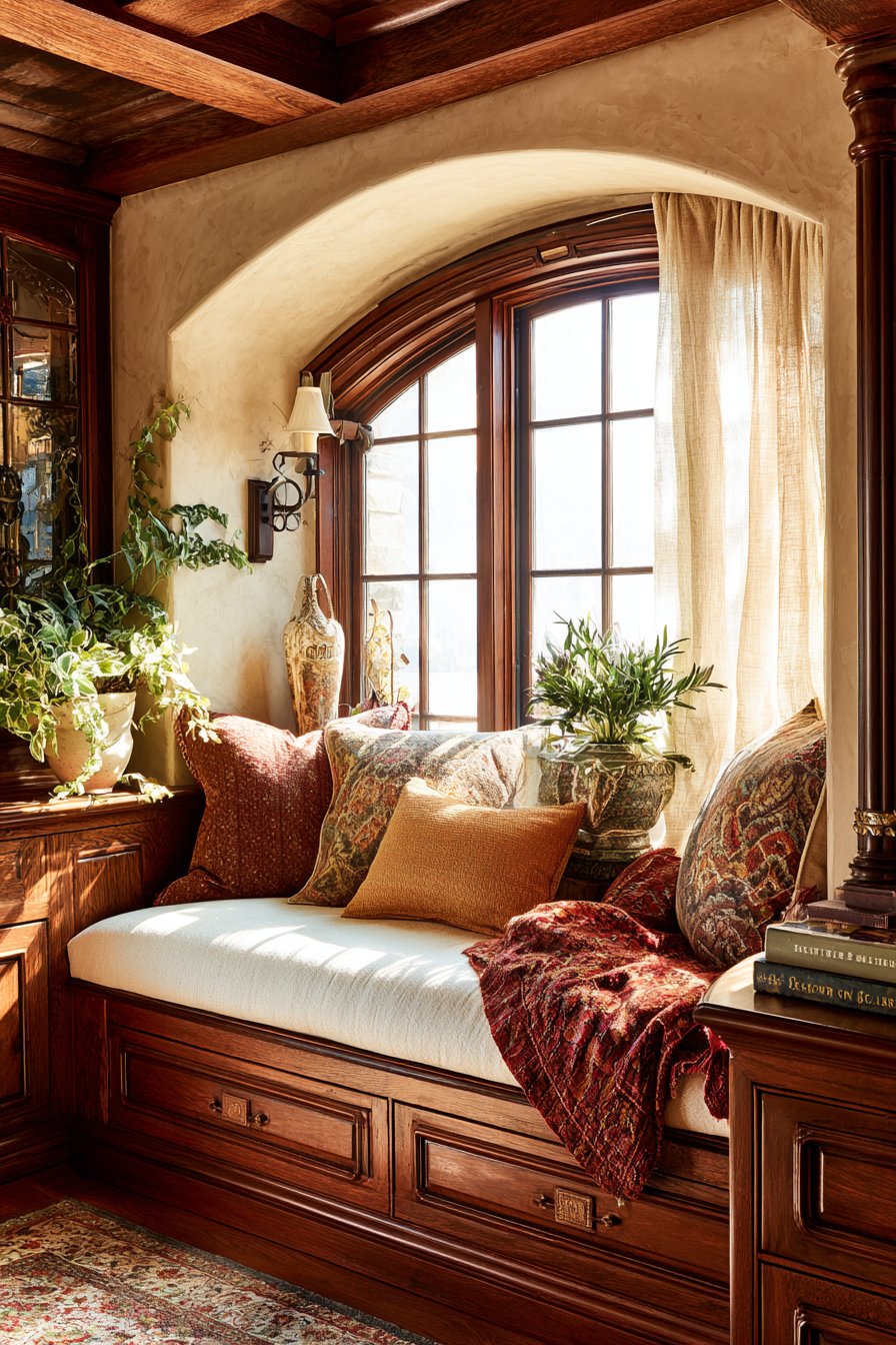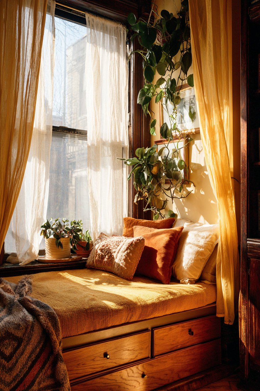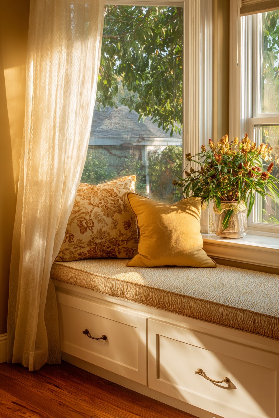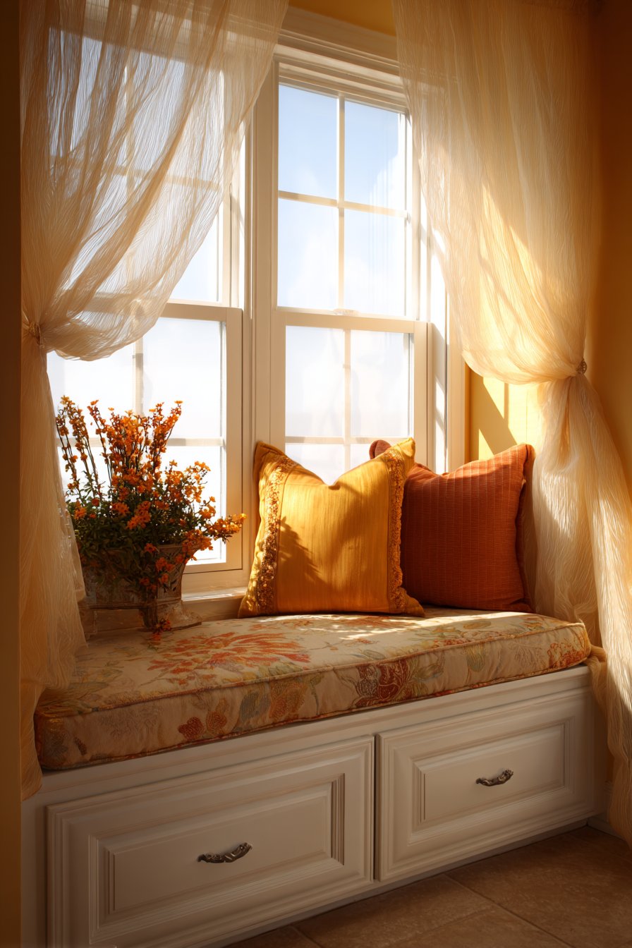 The seat cushion and throw pillows use fabrics in warm cinnamon, saffron, and cream colors, their rich hues and soft textures inviting you to sit and stay awhile. These textiles can be easily changed seasonally to refresh the look while maintaining the warm palette—perhaps deeper, richer colors for winter and lighter, brighter versions of warm tones for summer. Sheer curtains diffuse natural light, creating a golden ambiance that makes the alcove glow during sunny afternoons while providing privacy when needed.